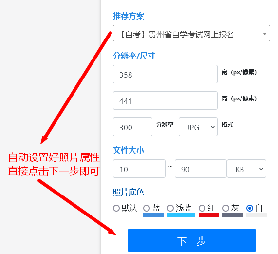 4、在推荐方案中选择【贵州省自学考试报名照片】,也可以自己按要求设置