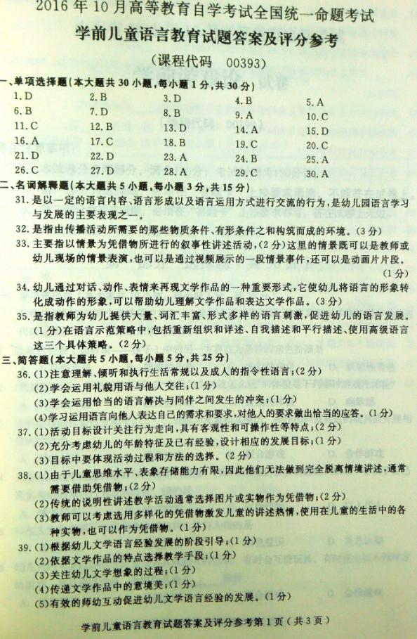 2016年10月贵州省自学考试《学前儿童语言教育》试卷真题