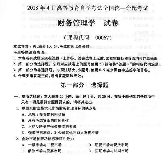 2018年04月贵州自考0067《财务管理学》真题及答案解析