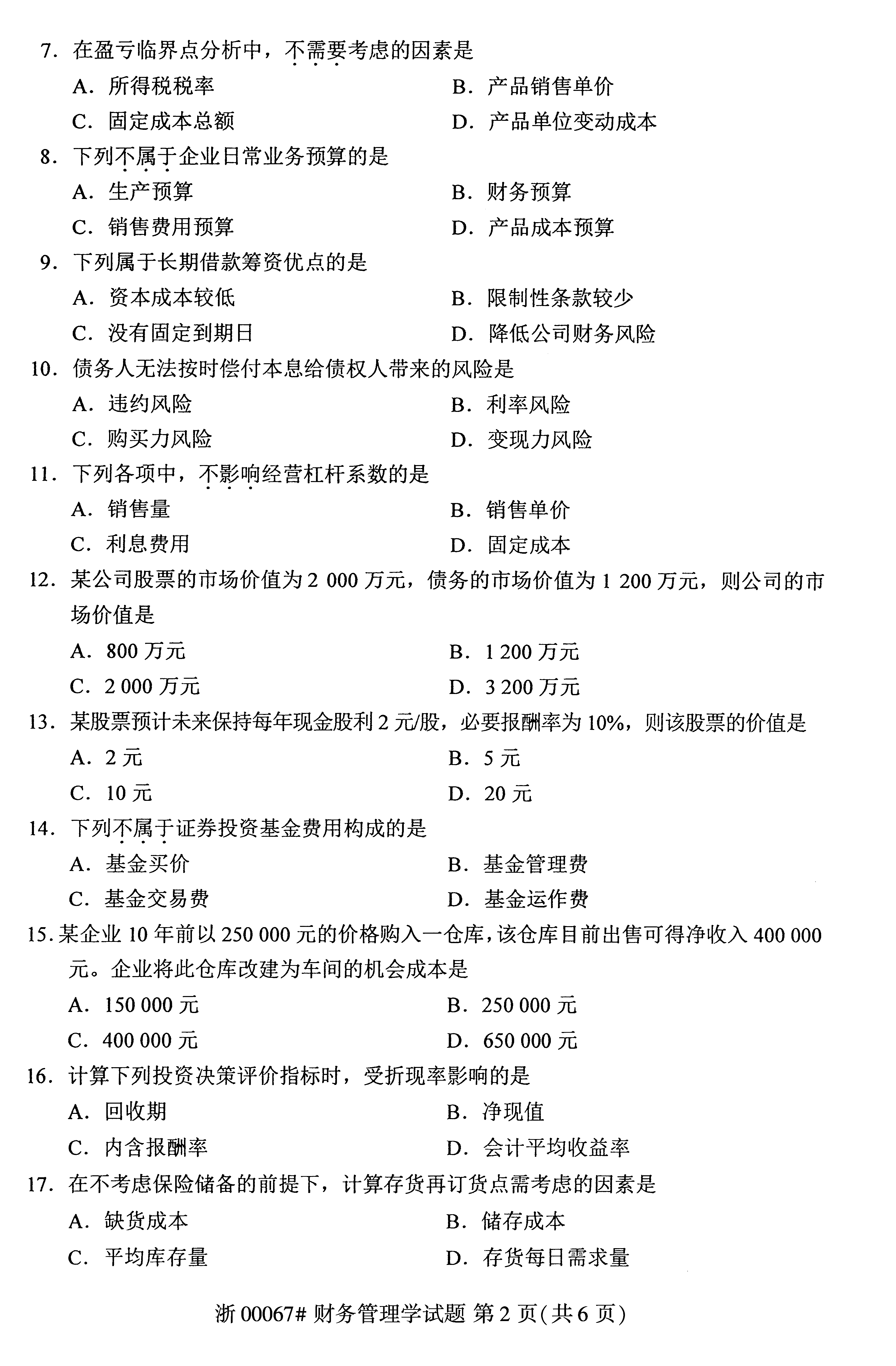 2019年10月贵州自考0067《财务管理学》历年真题及答案