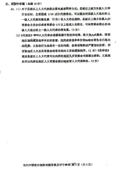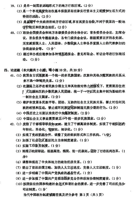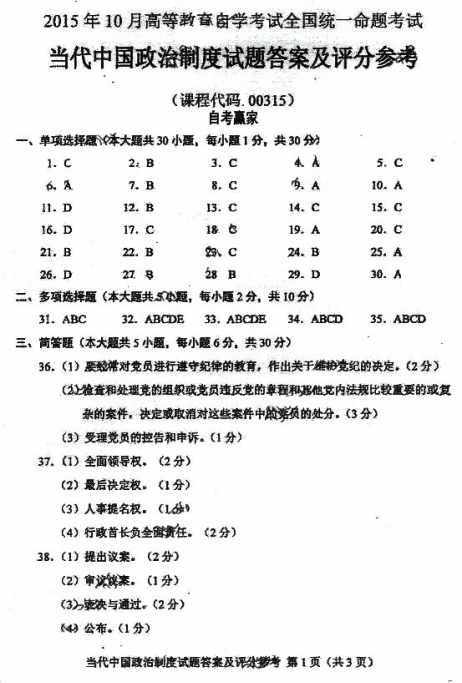 2015年10月贵州省自学考试当代中国政治制度真题答案