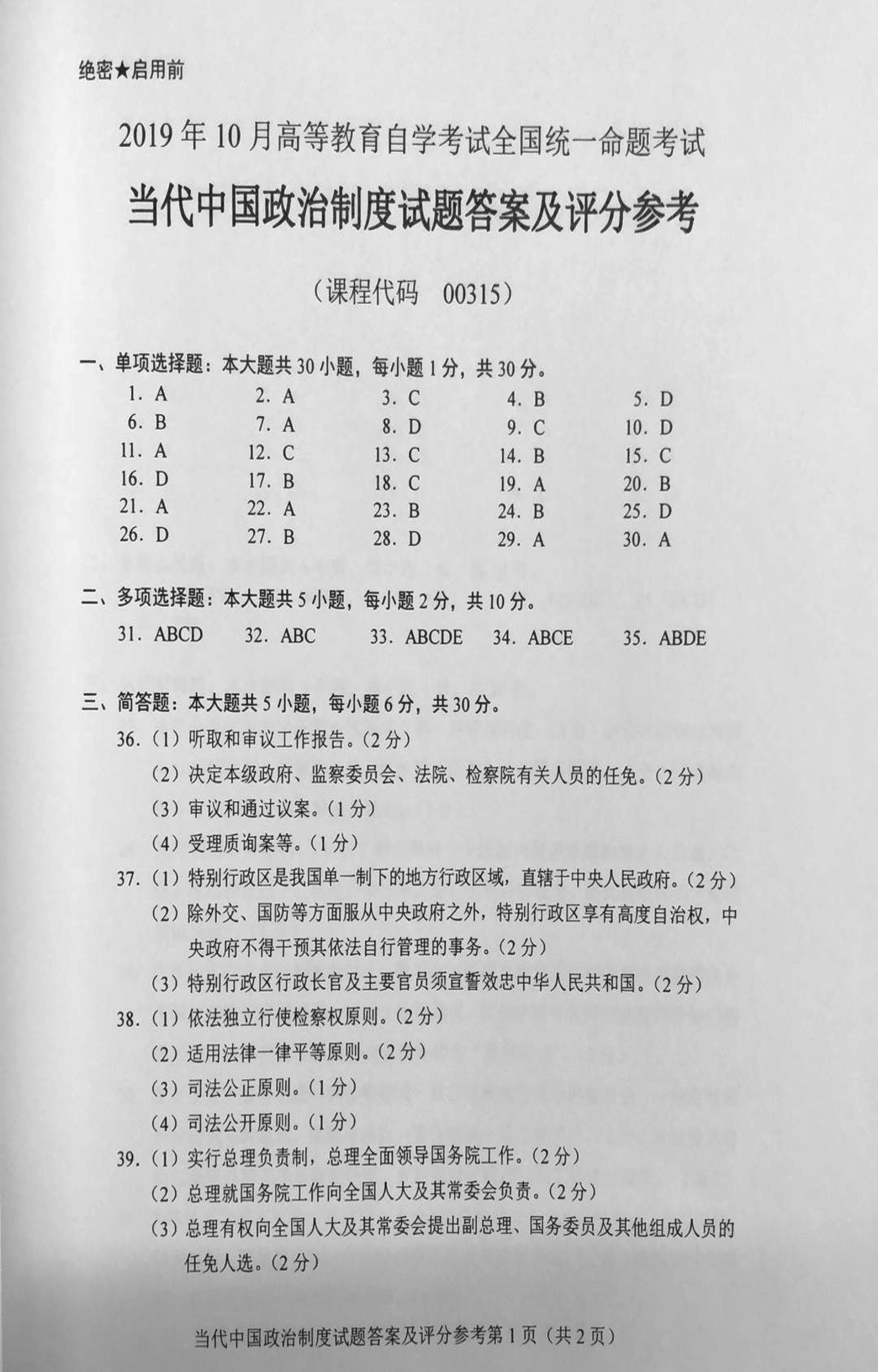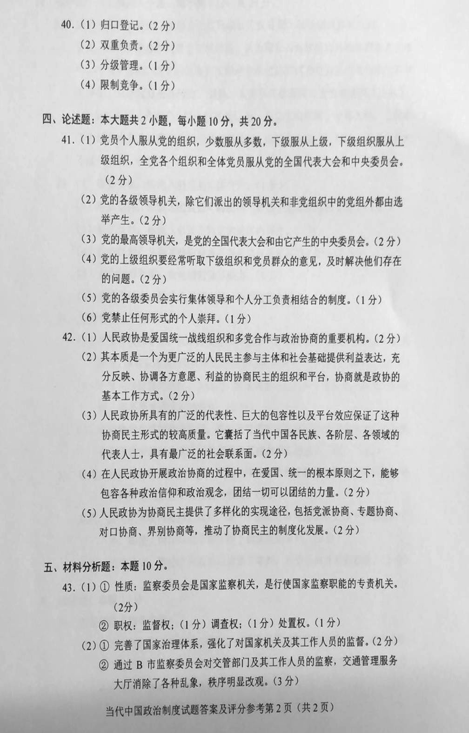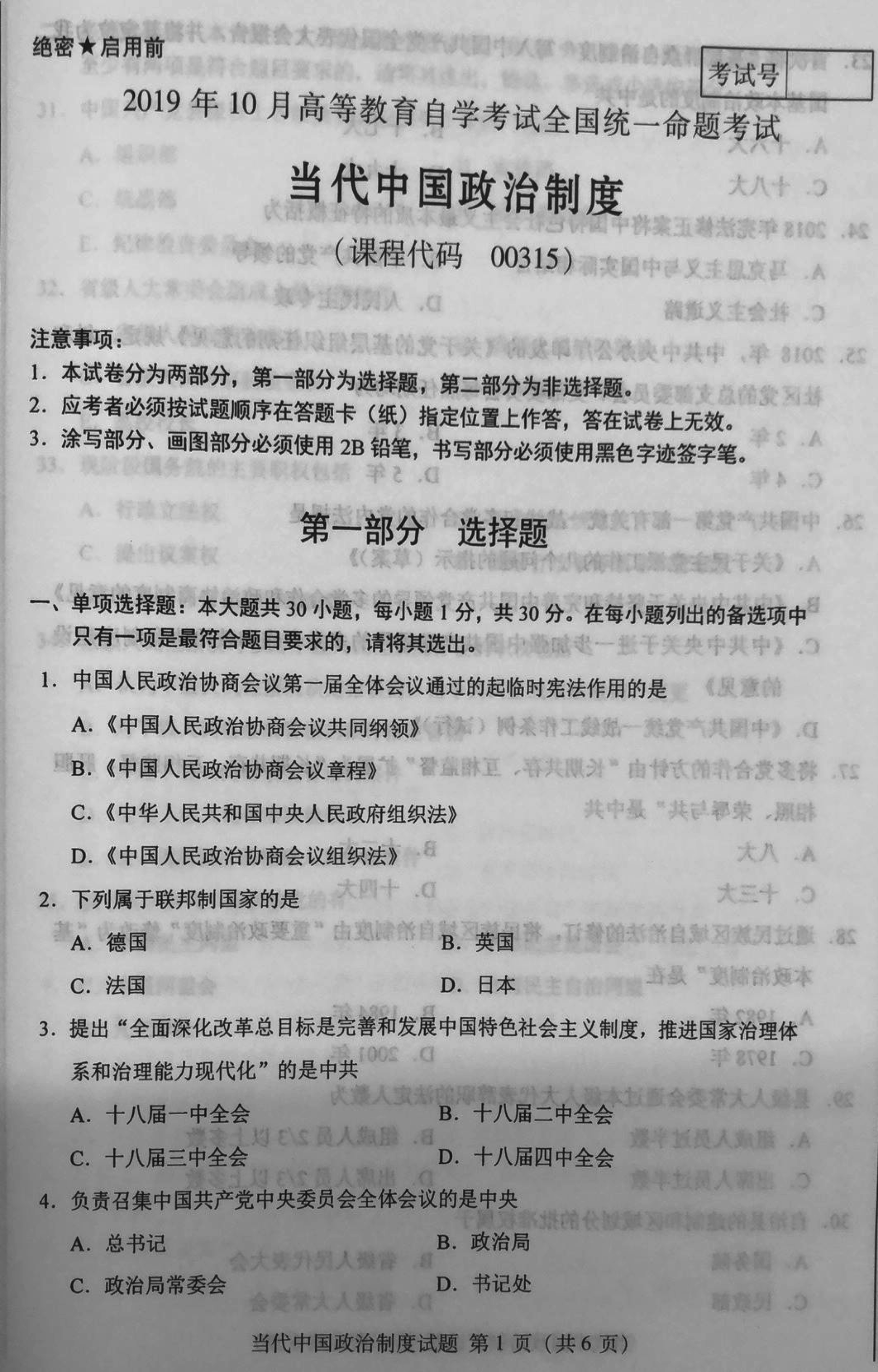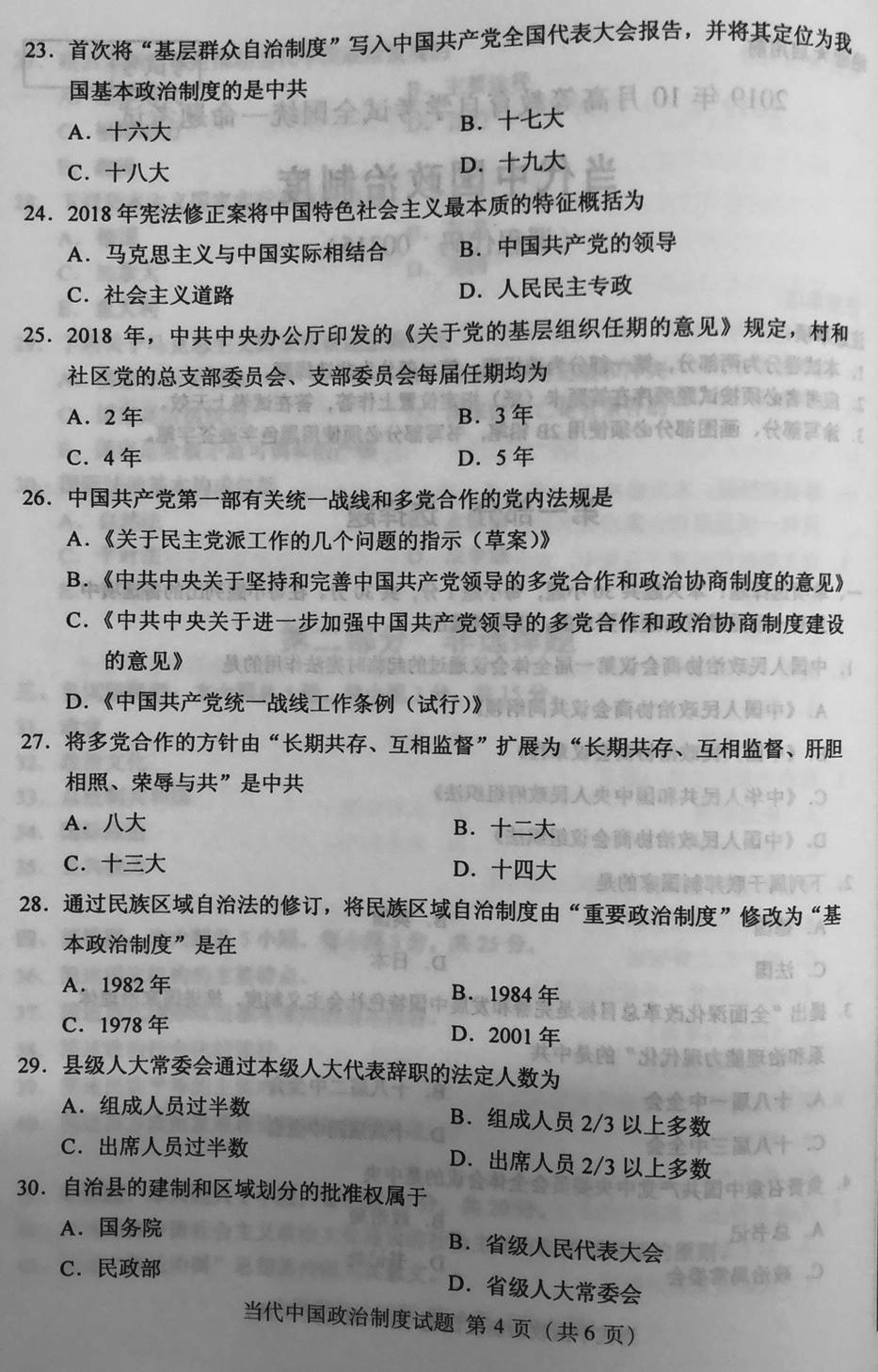 2019年10月贵州省自考当代中国政治制度真题及答案
