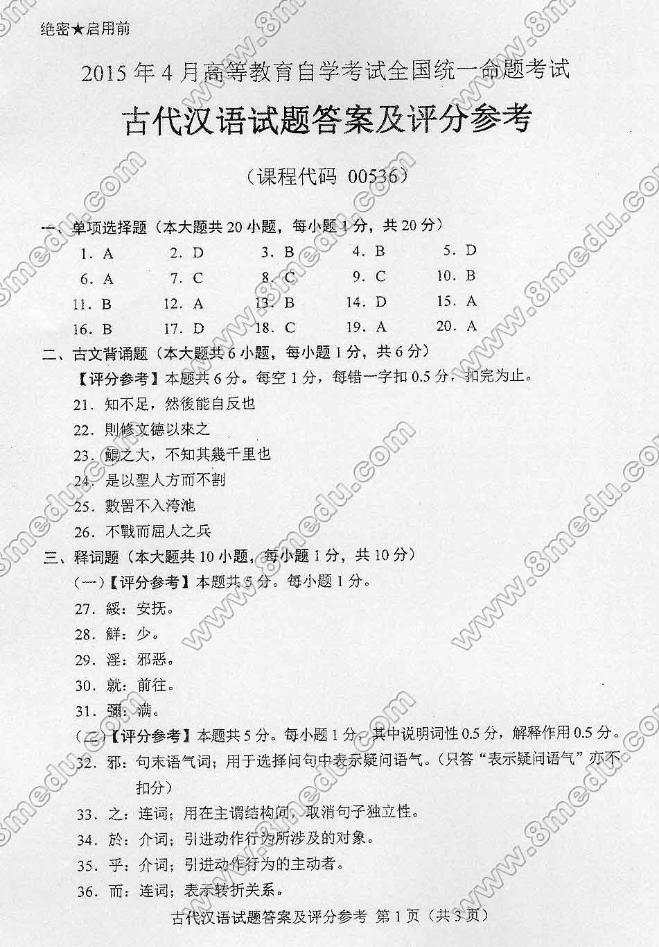 2015年04月贵州省自学考试00536古代汉语真题及答案