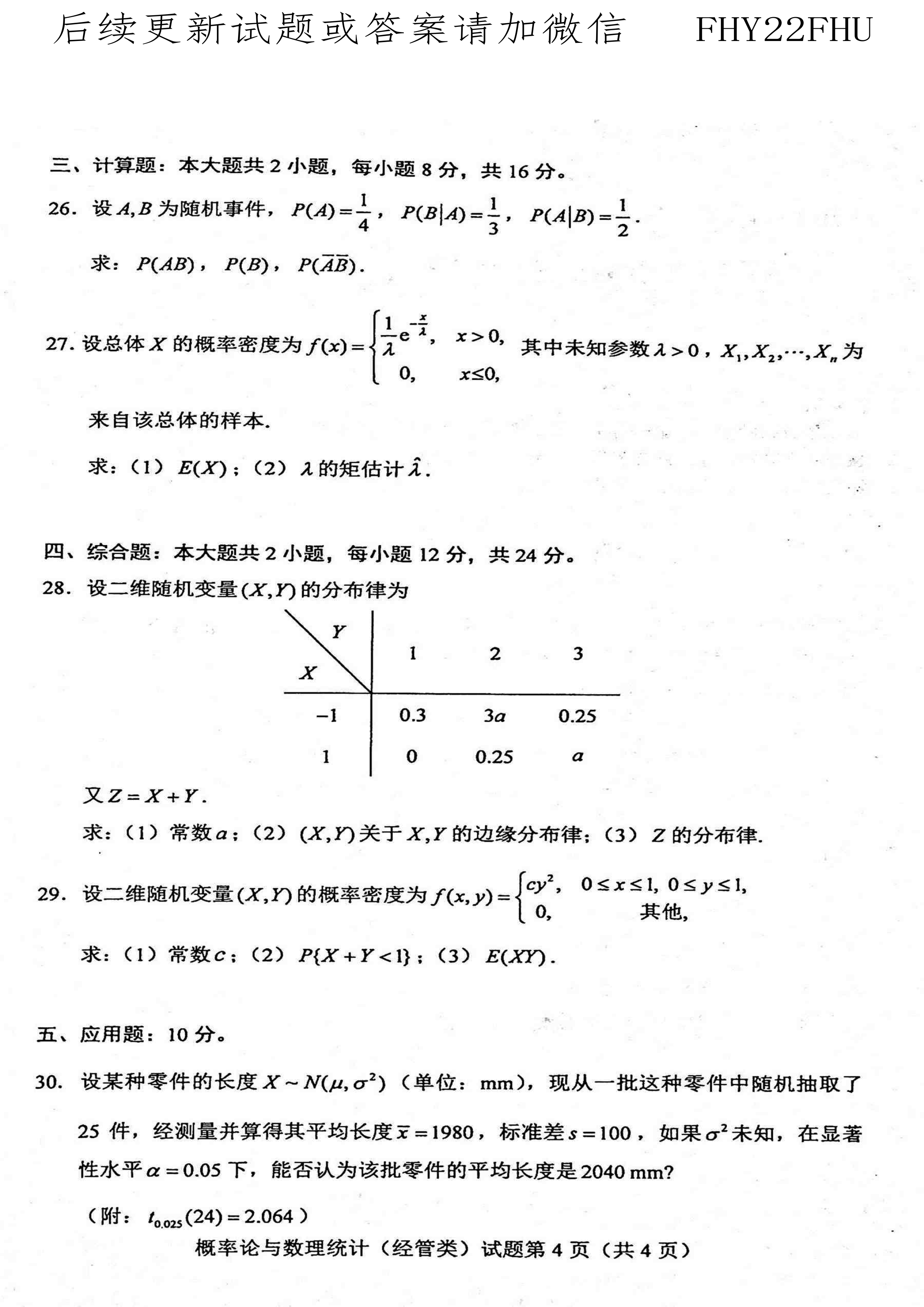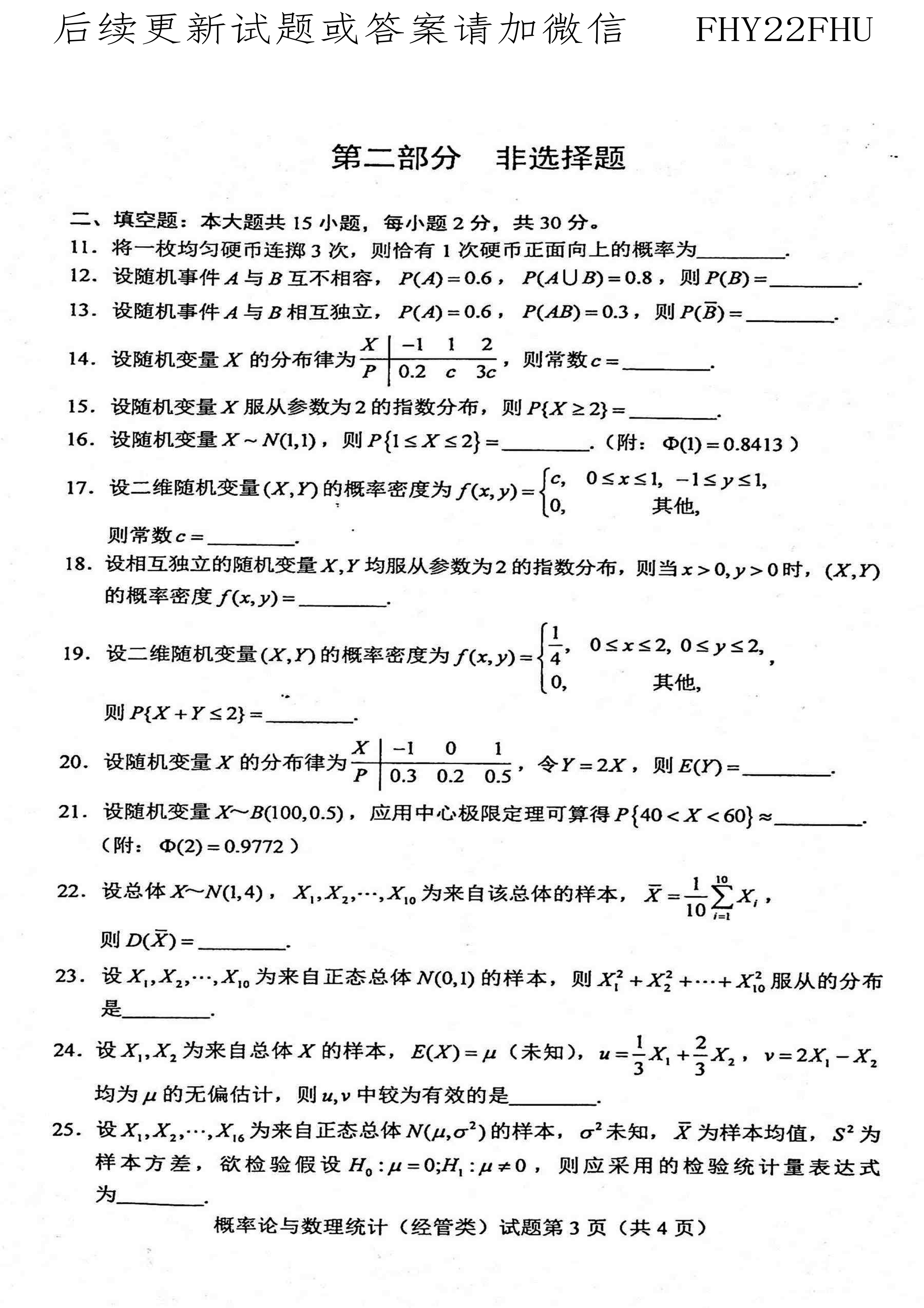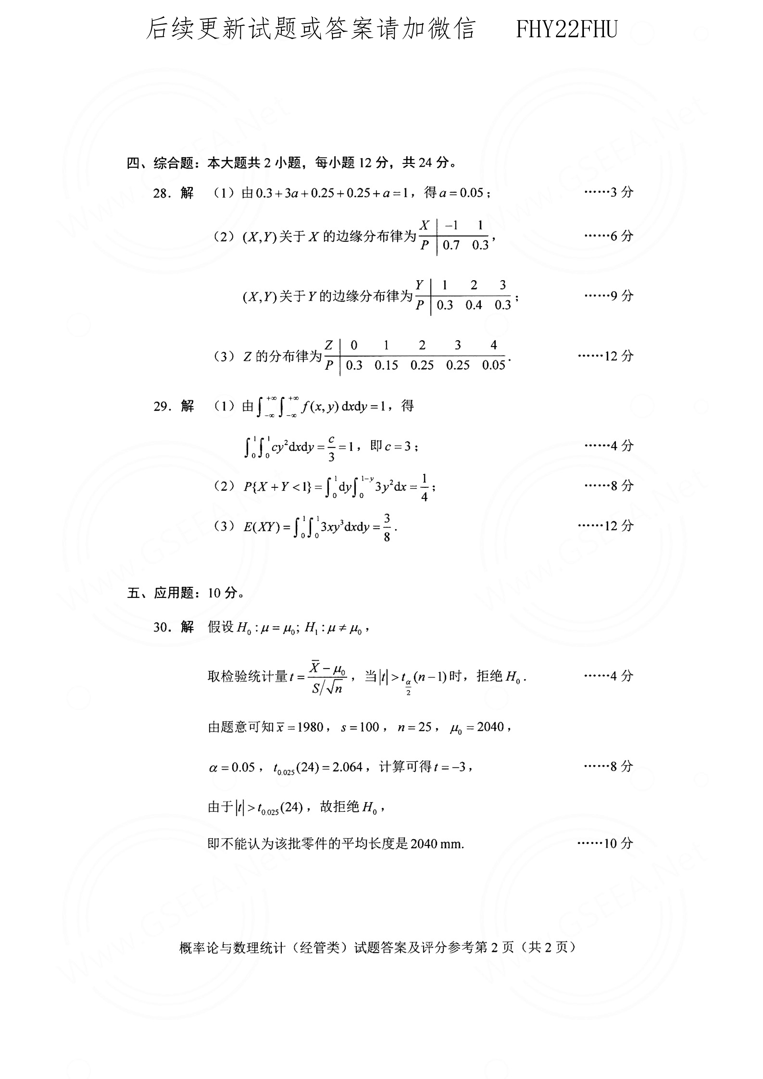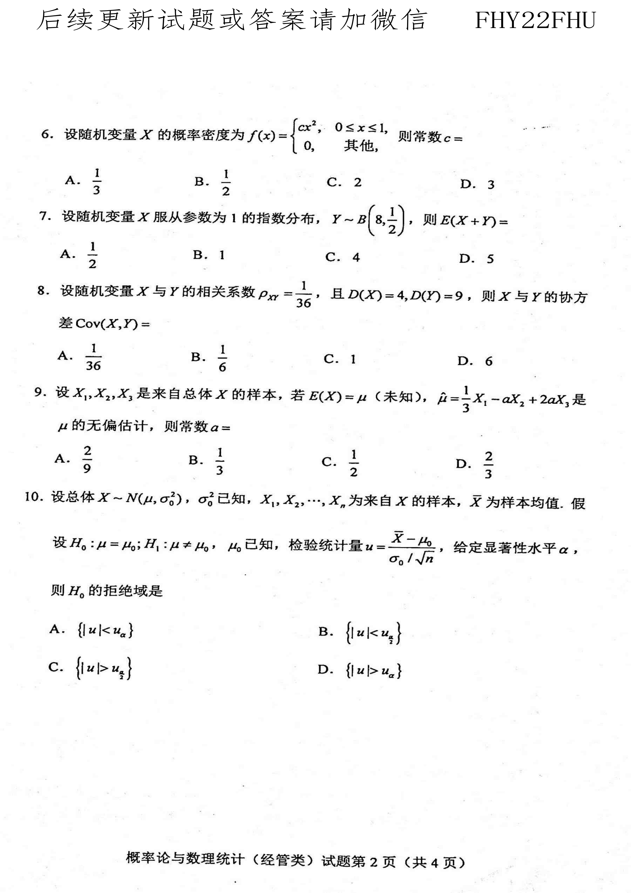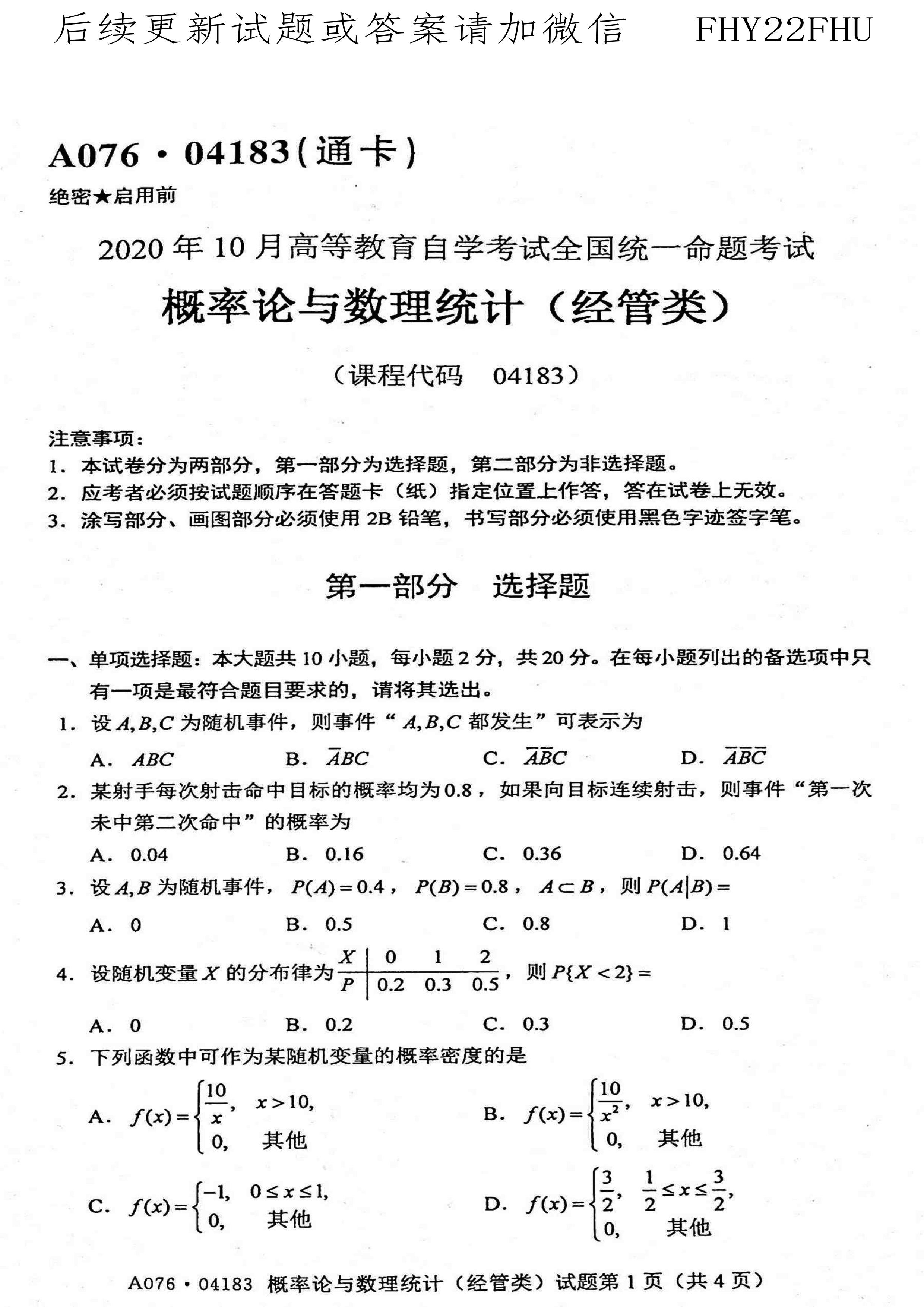 2020年10月贵州自考04183概率论与数理统计(经管类)真题及答案