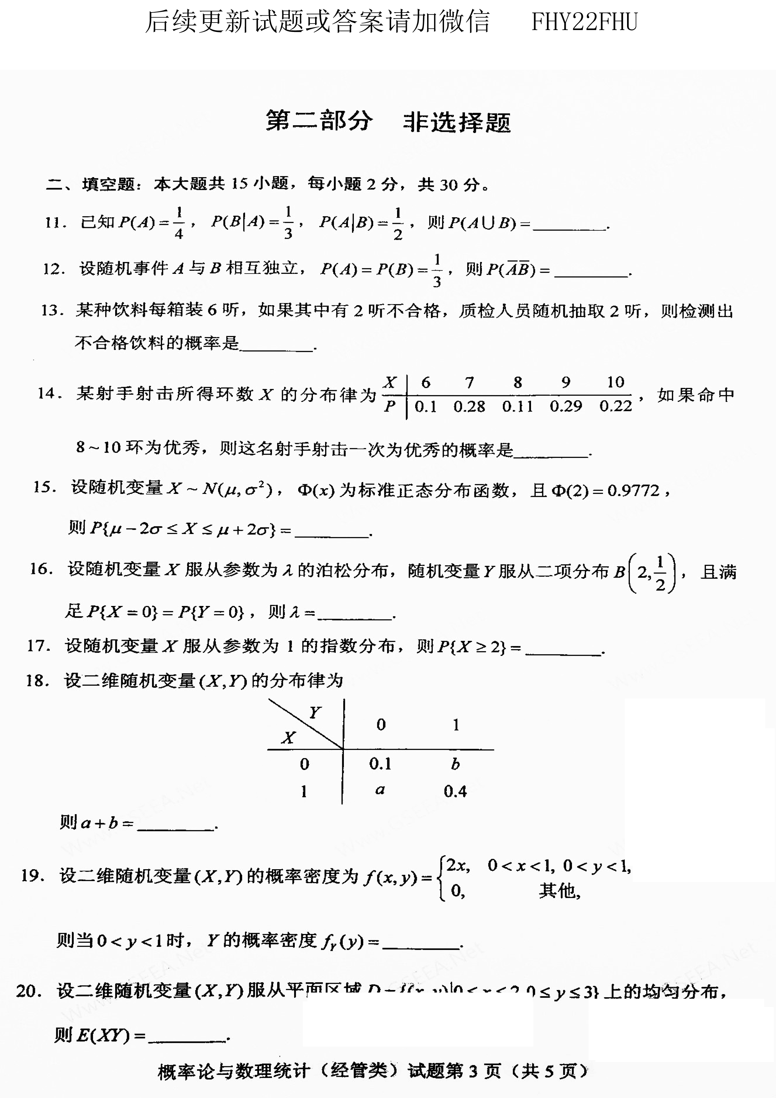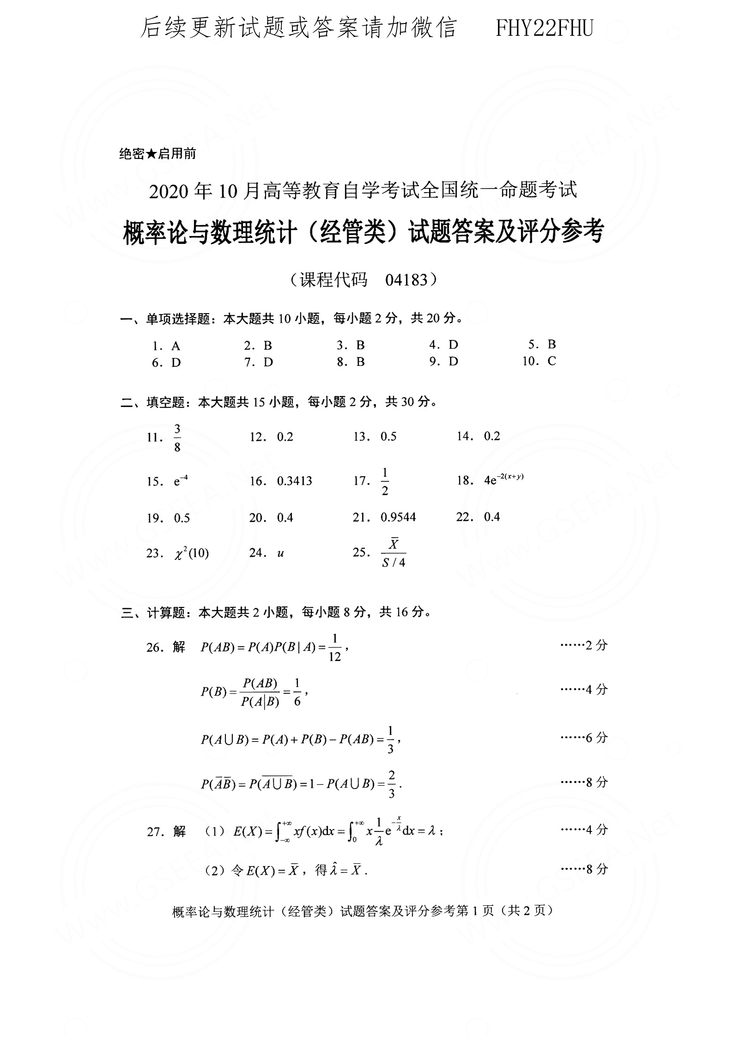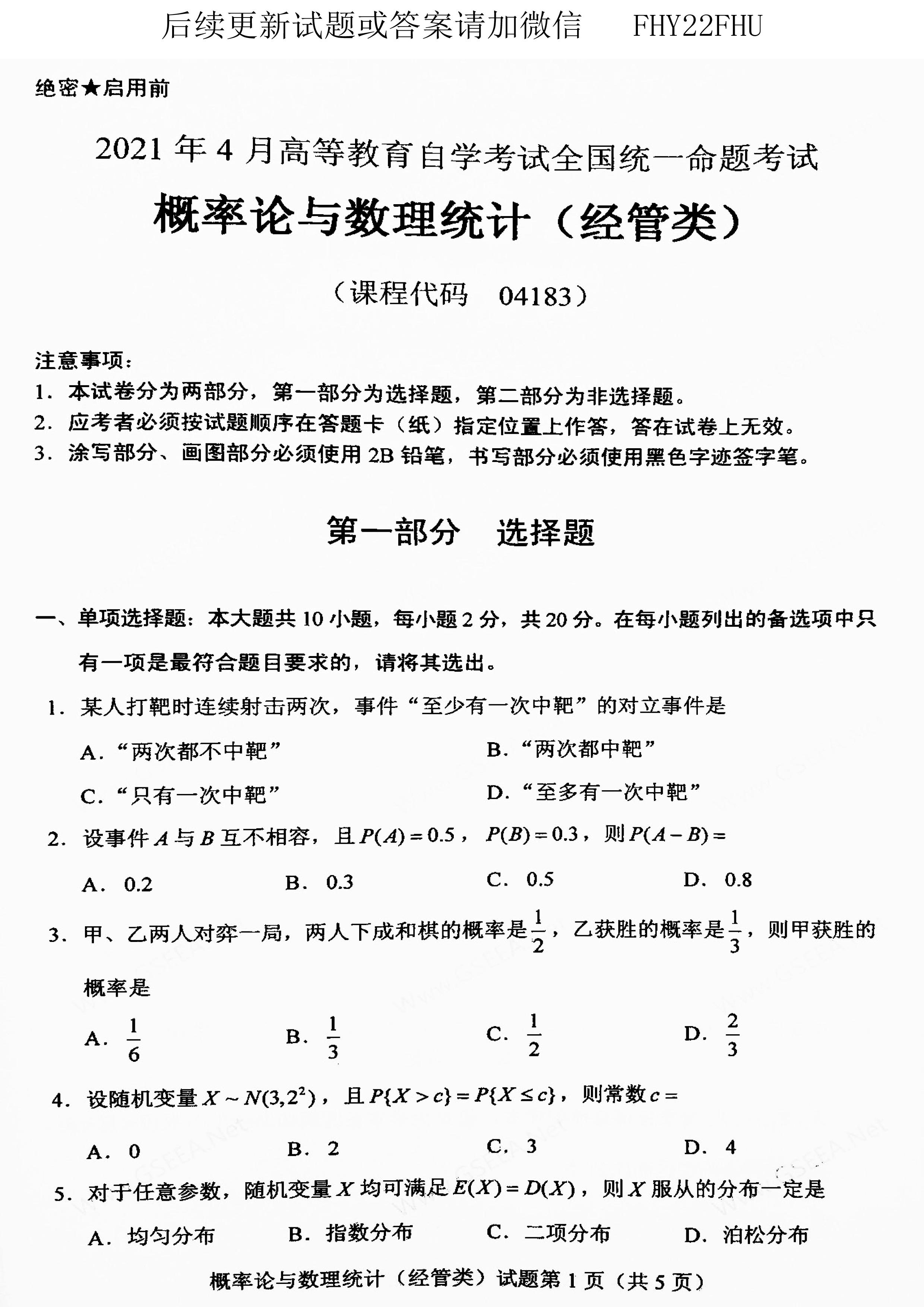 2021年04月贵州自考04183概率论与数理统计(经管类)真题及答案
