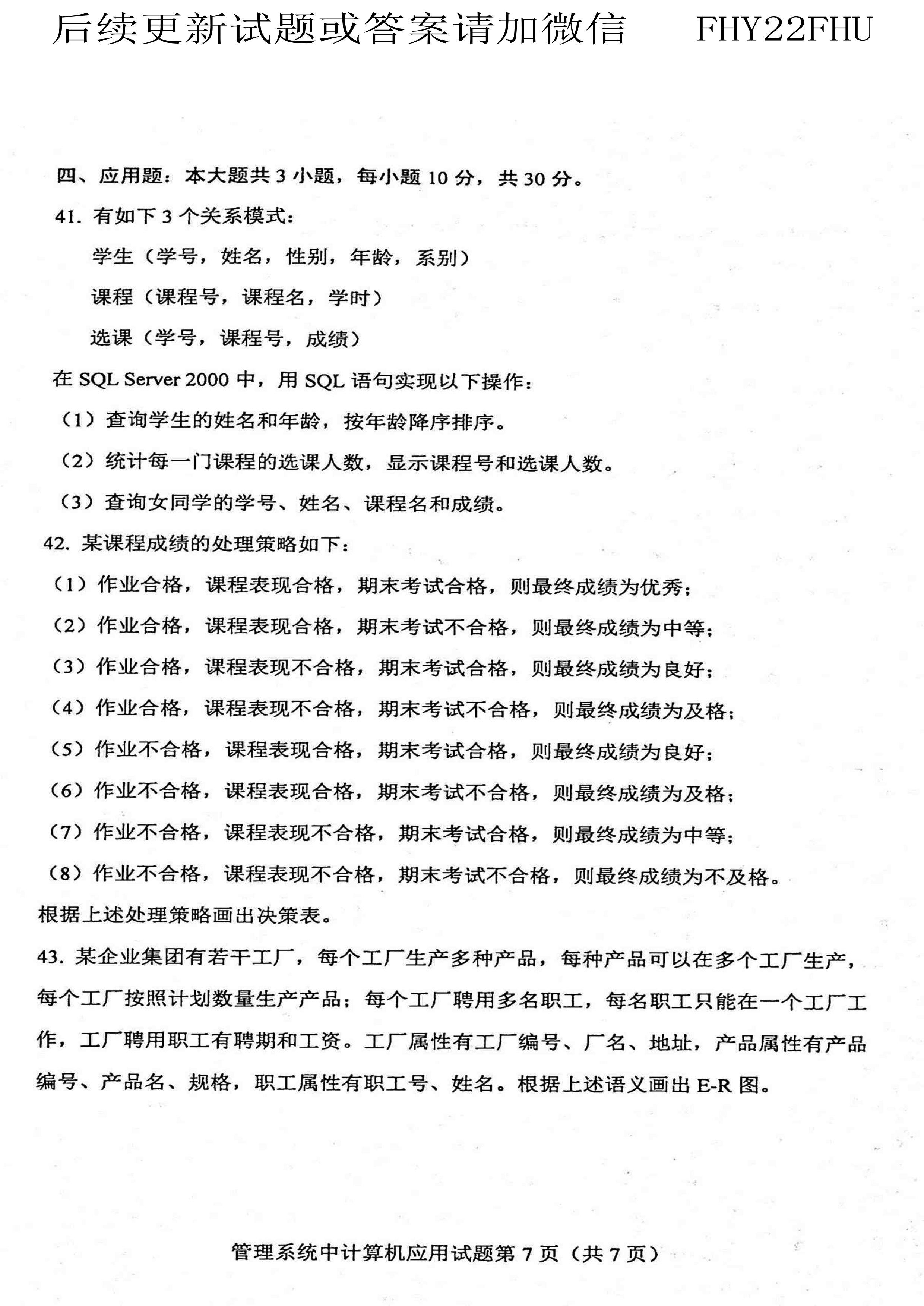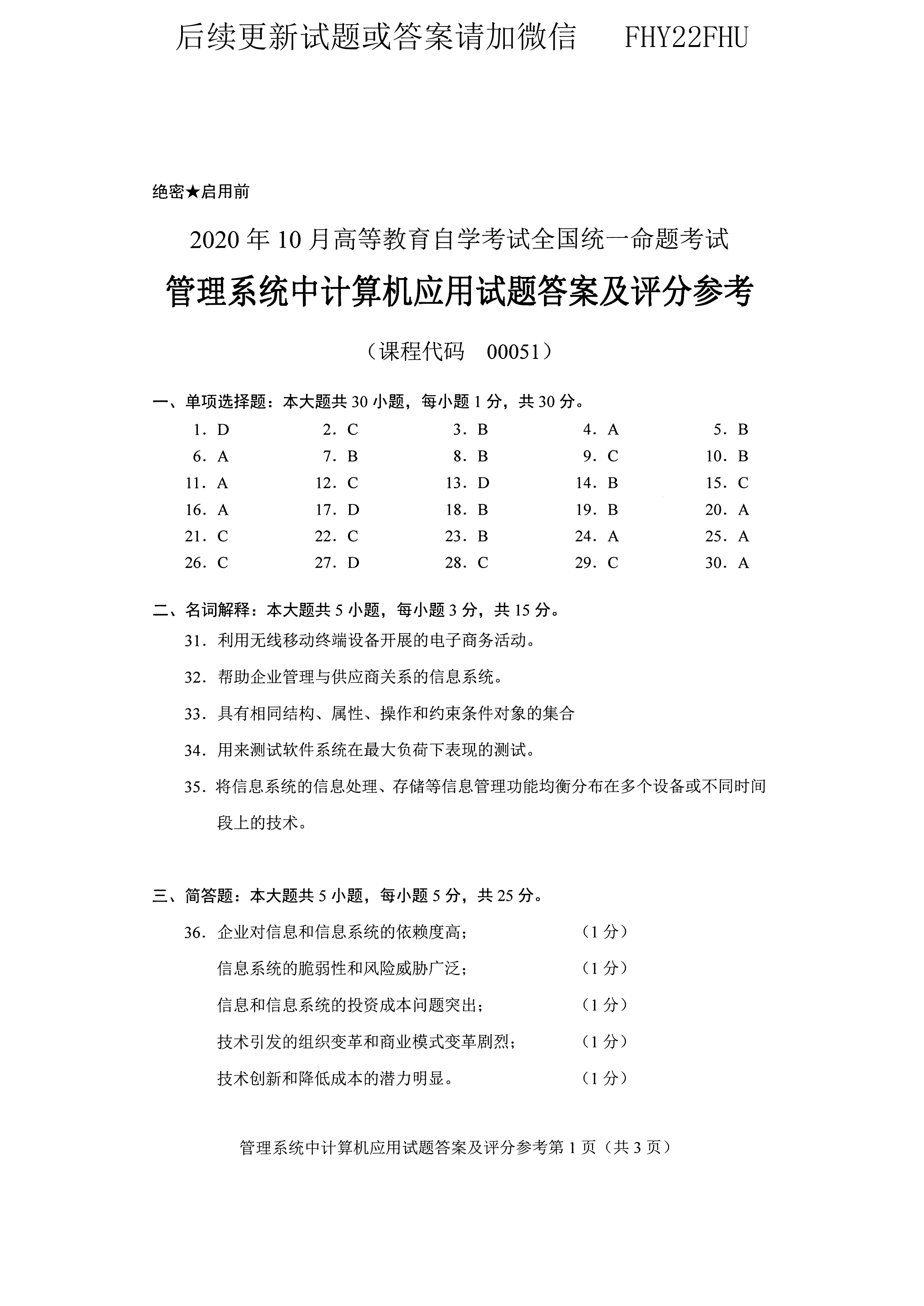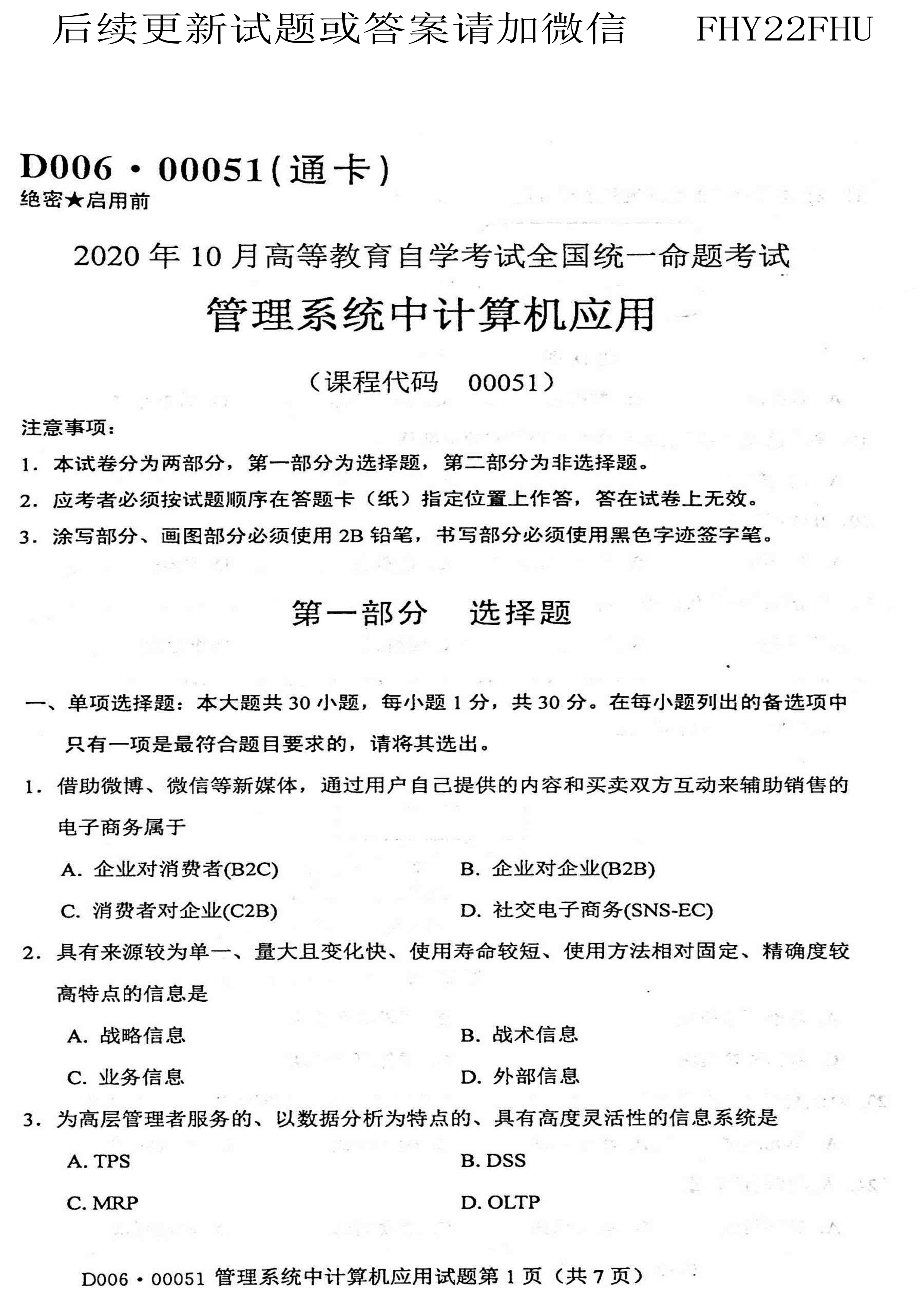 2020年10月贵州自考00051管理系统中计算机应用真题及答案