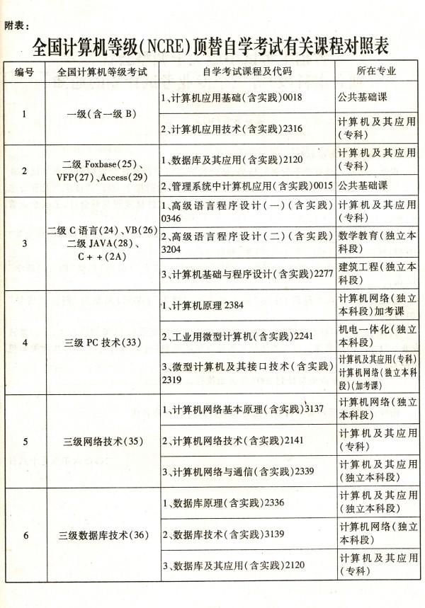 (三)取得全国计算机等级考试合格证书者,可申请免考自学考试有关专业的计算机类课程(各级证书对应免考课程见附表)。