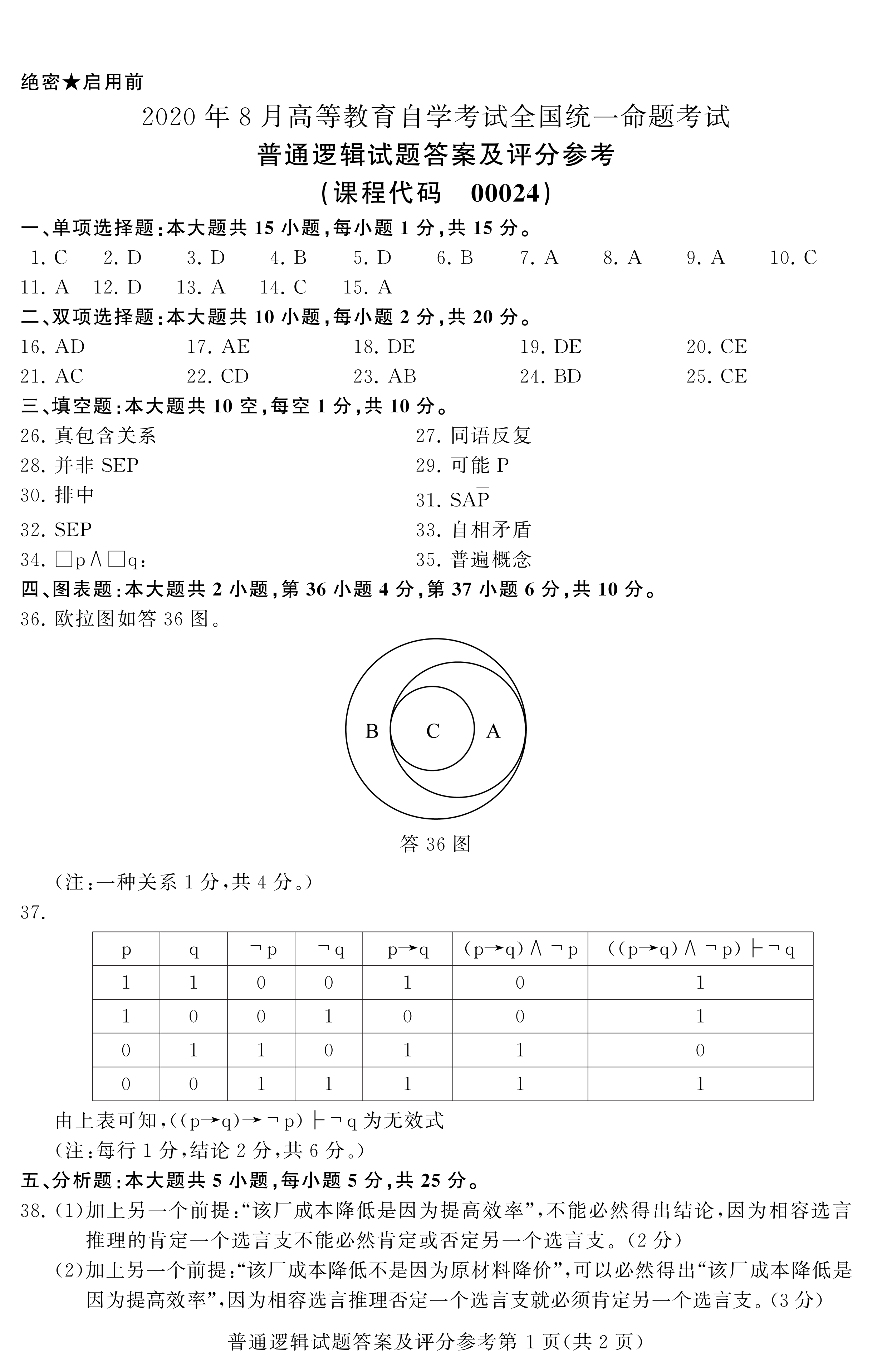 2020年08月贵州省自考00024普通逻辑真题及答案
