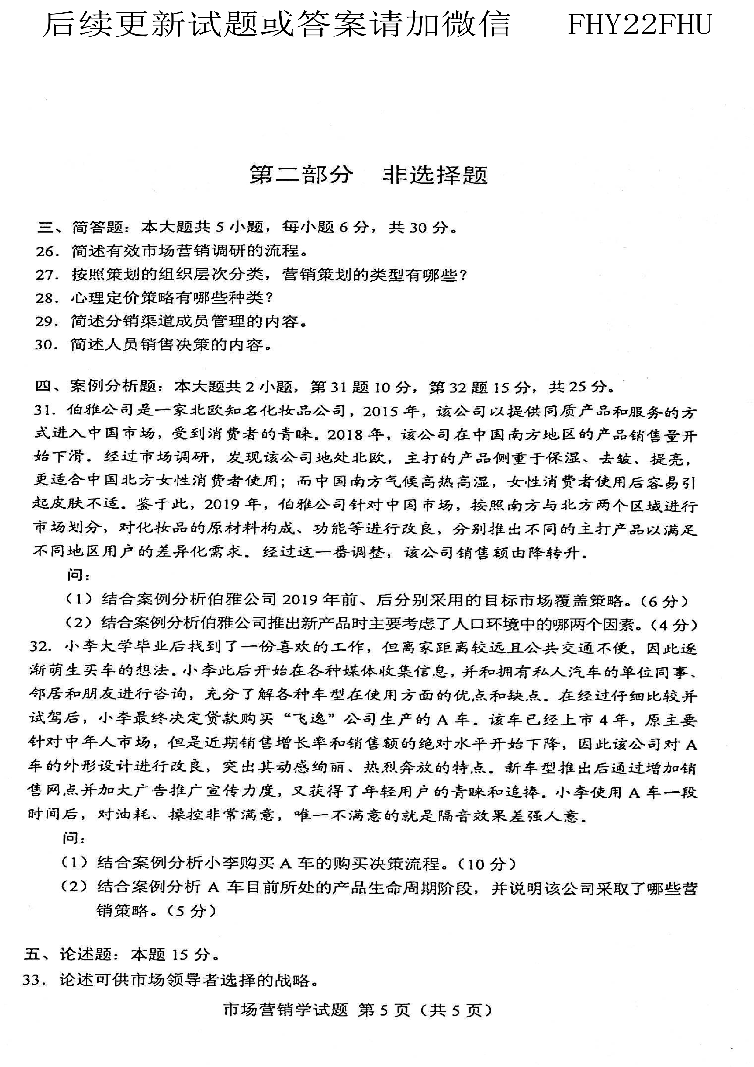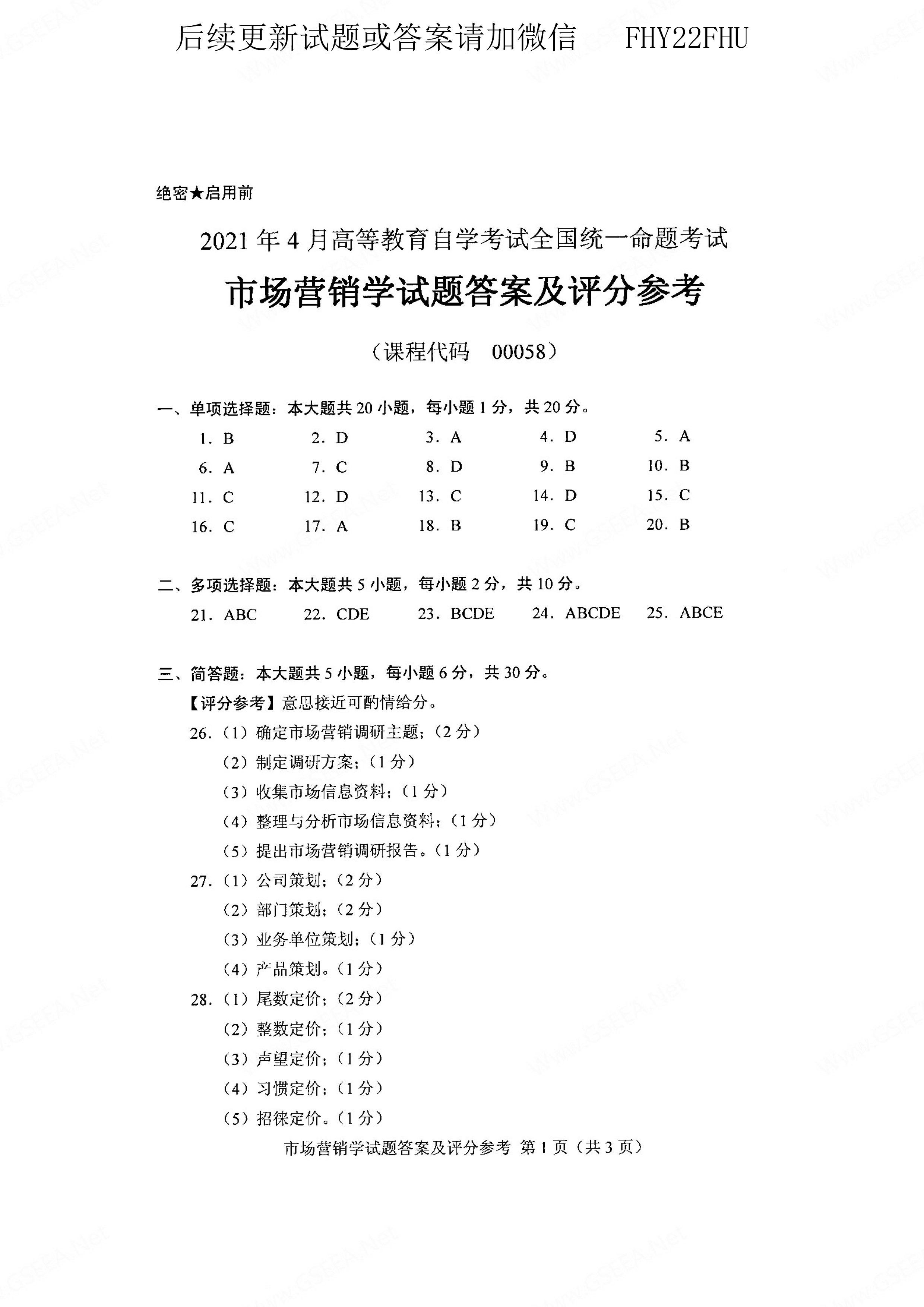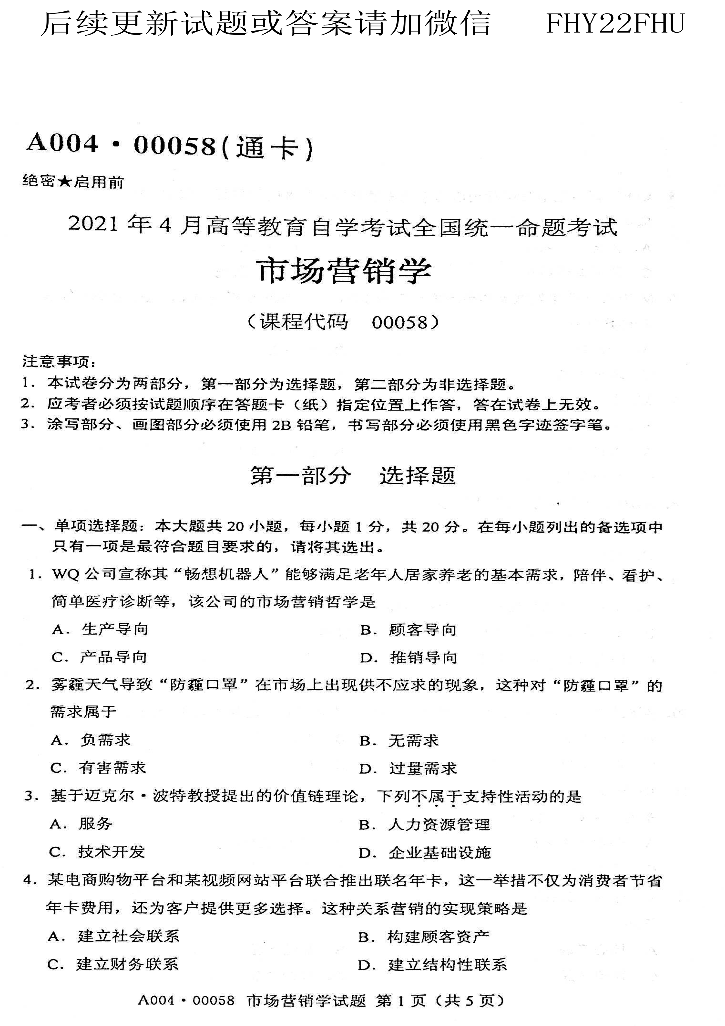 贵州省2021年04月自学考试00058市场营销学真题及答案