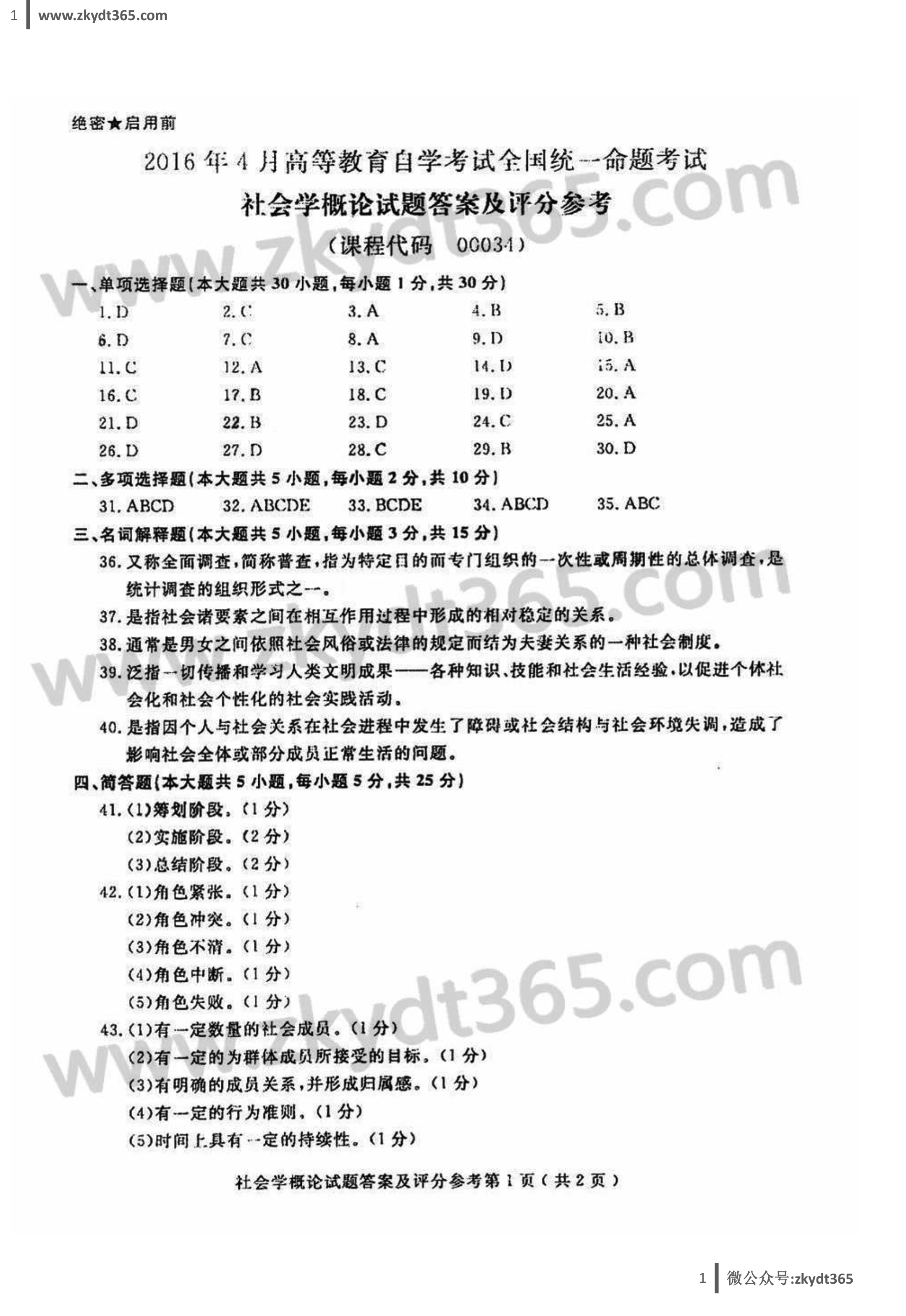 2016年04月贵州自考00034《社会学概论》历年真题答案