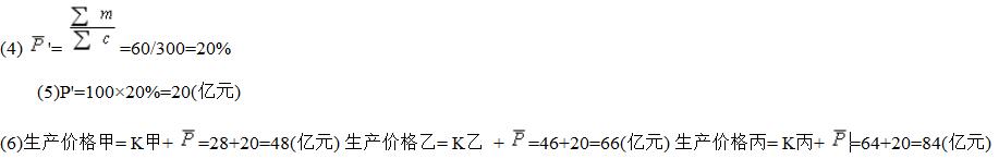 3、全社会有甲乙丙三个部门,投资总额均为100亿元,资本有机构成分别为9:1、4:1、7:3,固定资本分别为总资本的80%、60%、40%,使用年限为10年;流动资本一年周转1次;m'为100%。计算:(1)各部门的所费资本总额?(2)各部门的剩余价值总额?(3)各部门的利润率?(4)平均利润率?(5)各部门的平均利润?(6)各部门的生产价格?