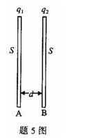 5.如图所示,真空中两块面积均为S的平板A和B彼此平行放置,板间距离为d,d远小于板的线度。设A、B板都均匀带正电,电量分别为q1和q2,则A、B两板间的电势差为( )