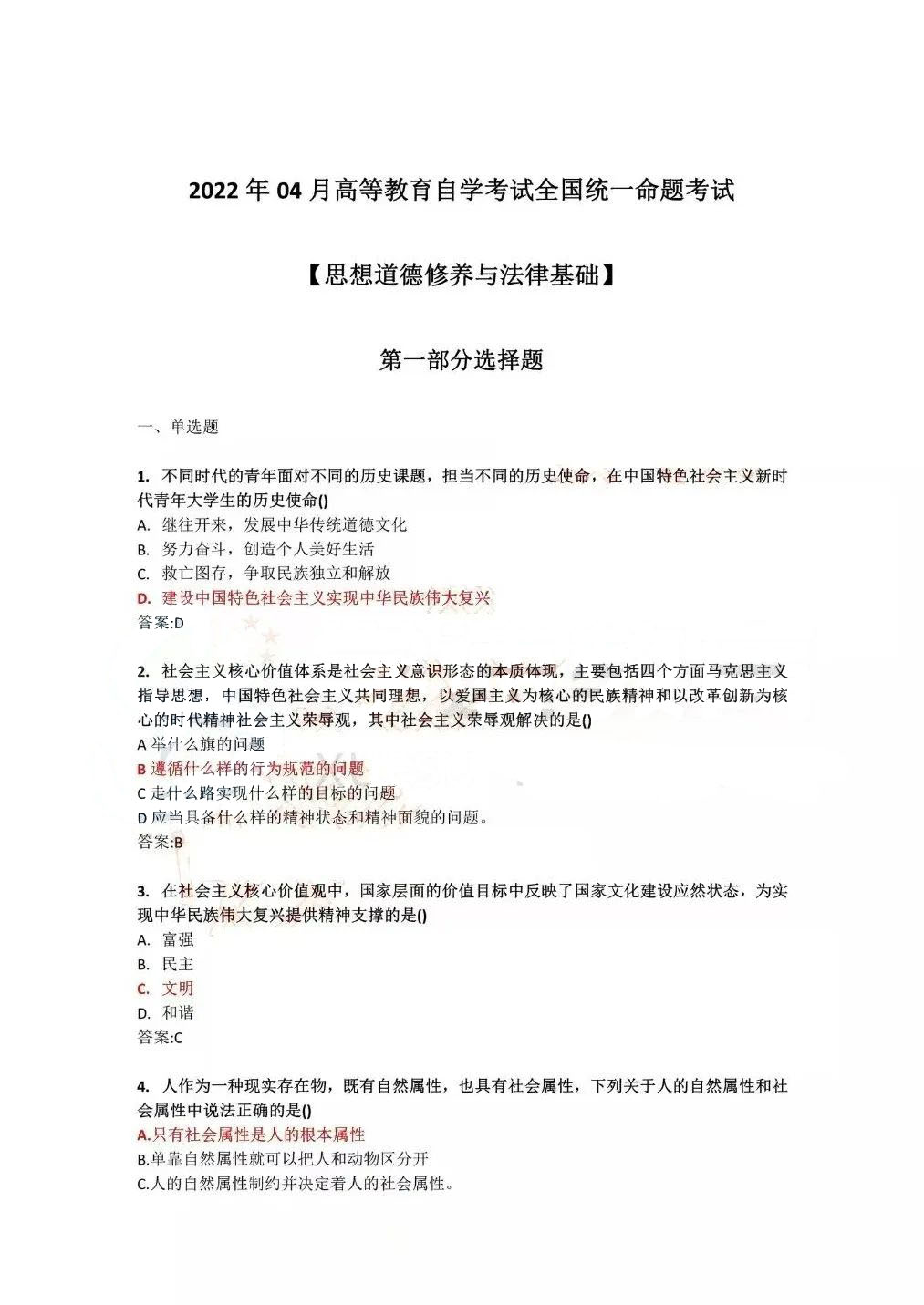 2022年4月贵州自考《思修道德修养与法律基础》真题及答案!