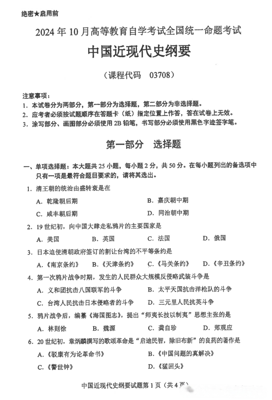 2024年10月贵州自考03708中国近现代史纲要试题及答案