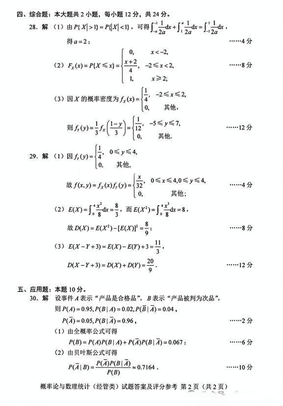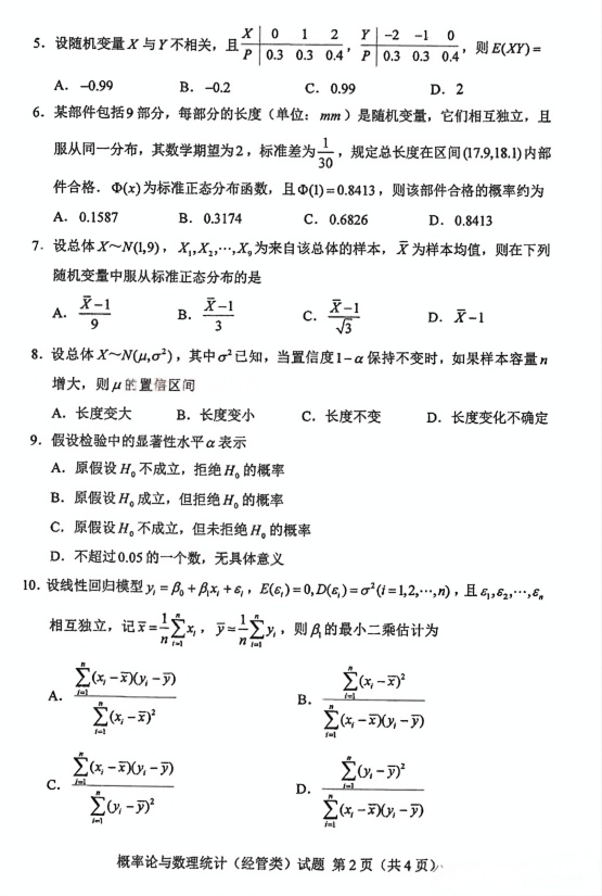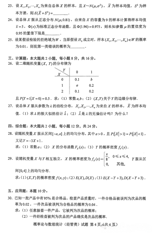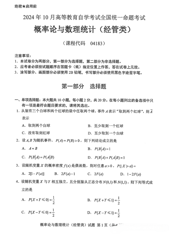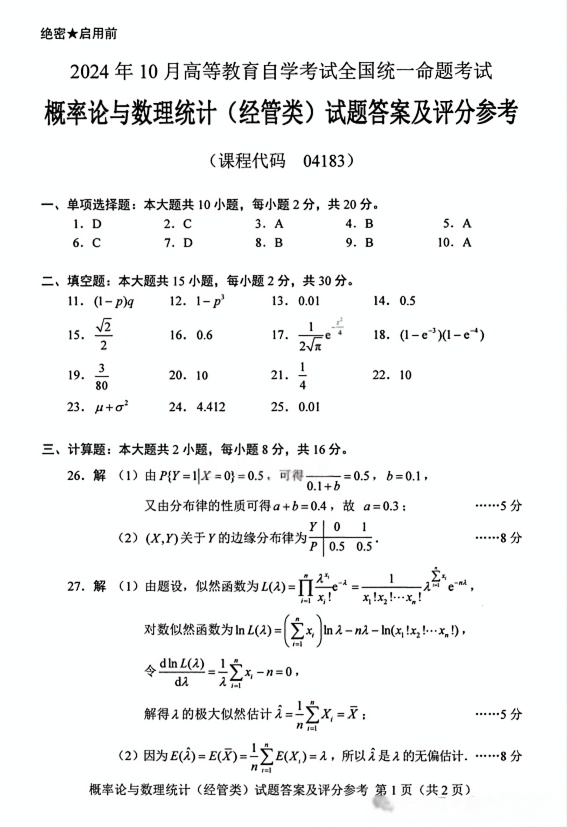 2024年10月贵州自考04183概率论与数理统计经管类试题及答案