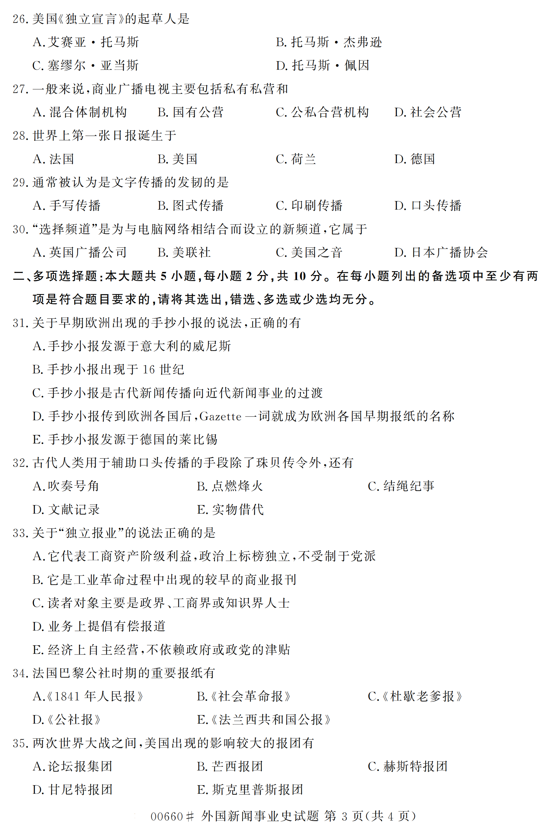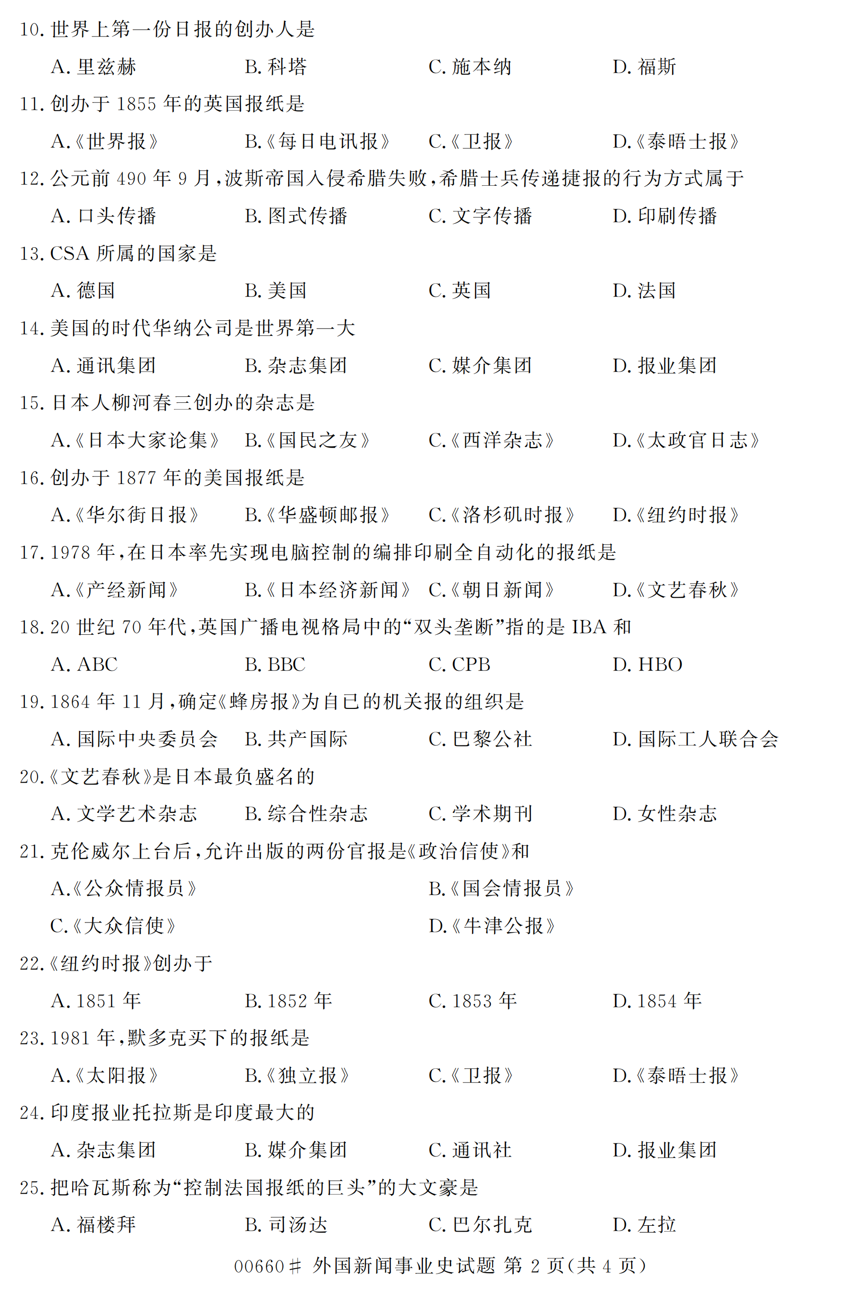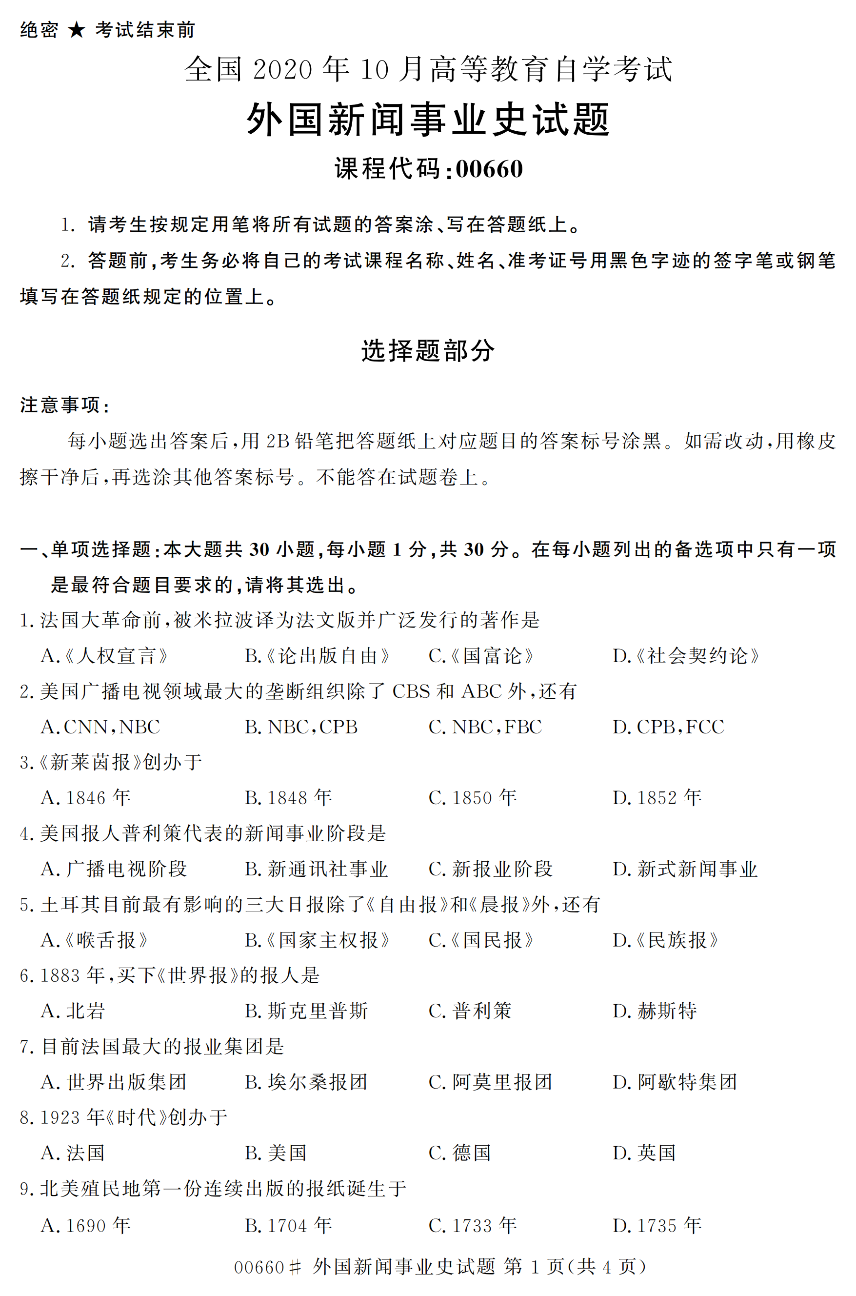 2020年10月贵州高等教育自学考试外国新闻事业史00660真题