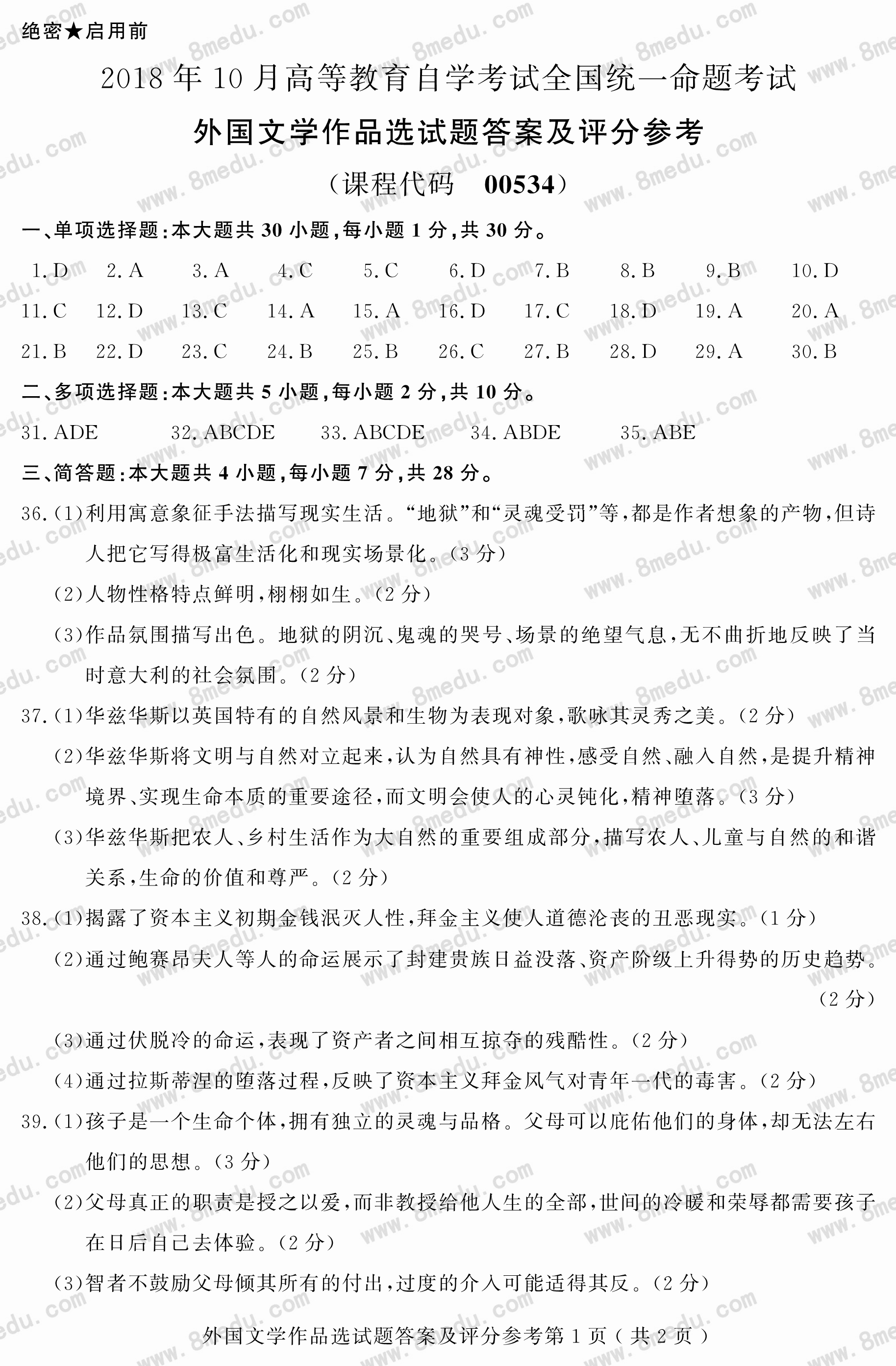 贵州省2018年10月自考00534外国文学作品选试题及答案
