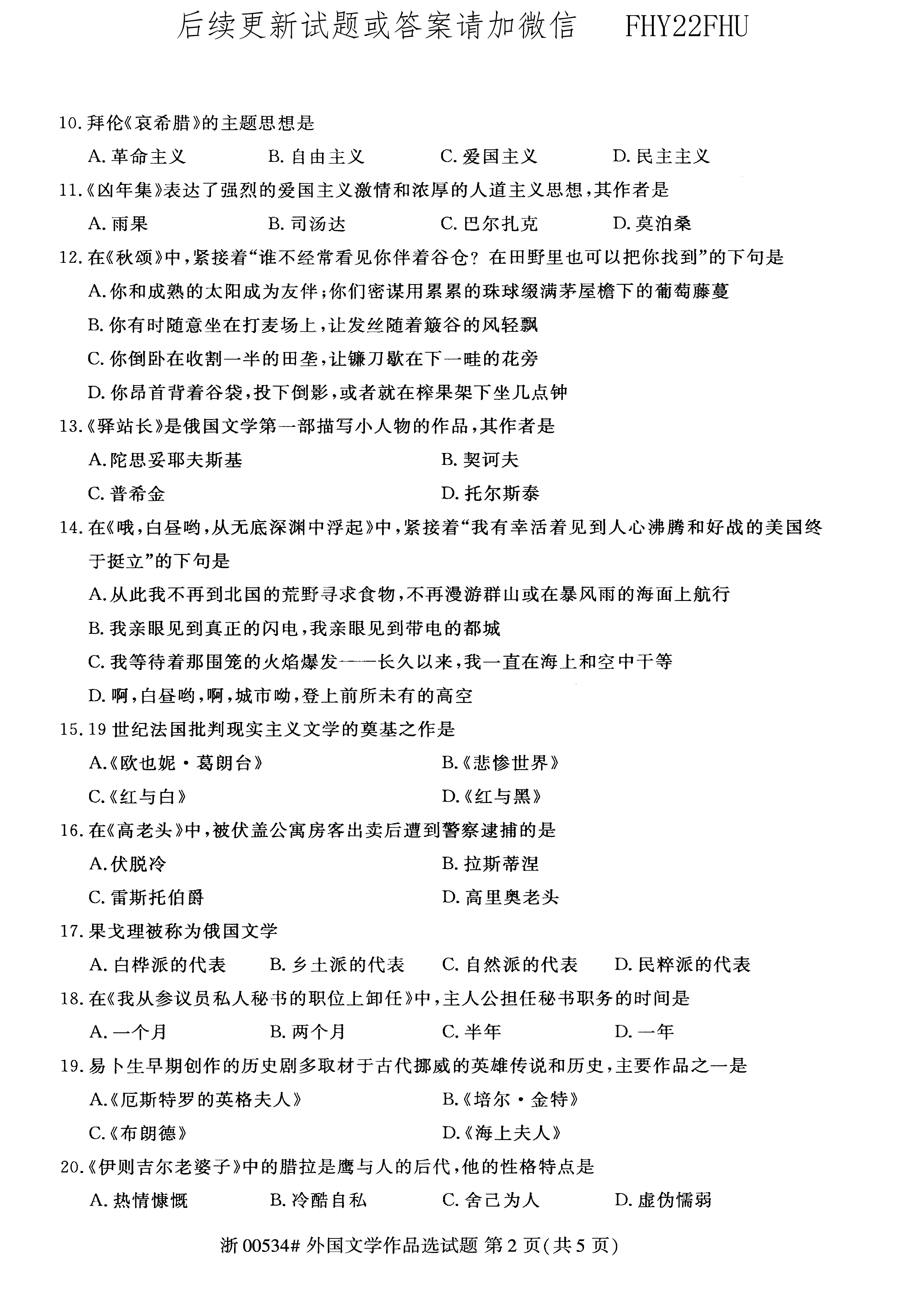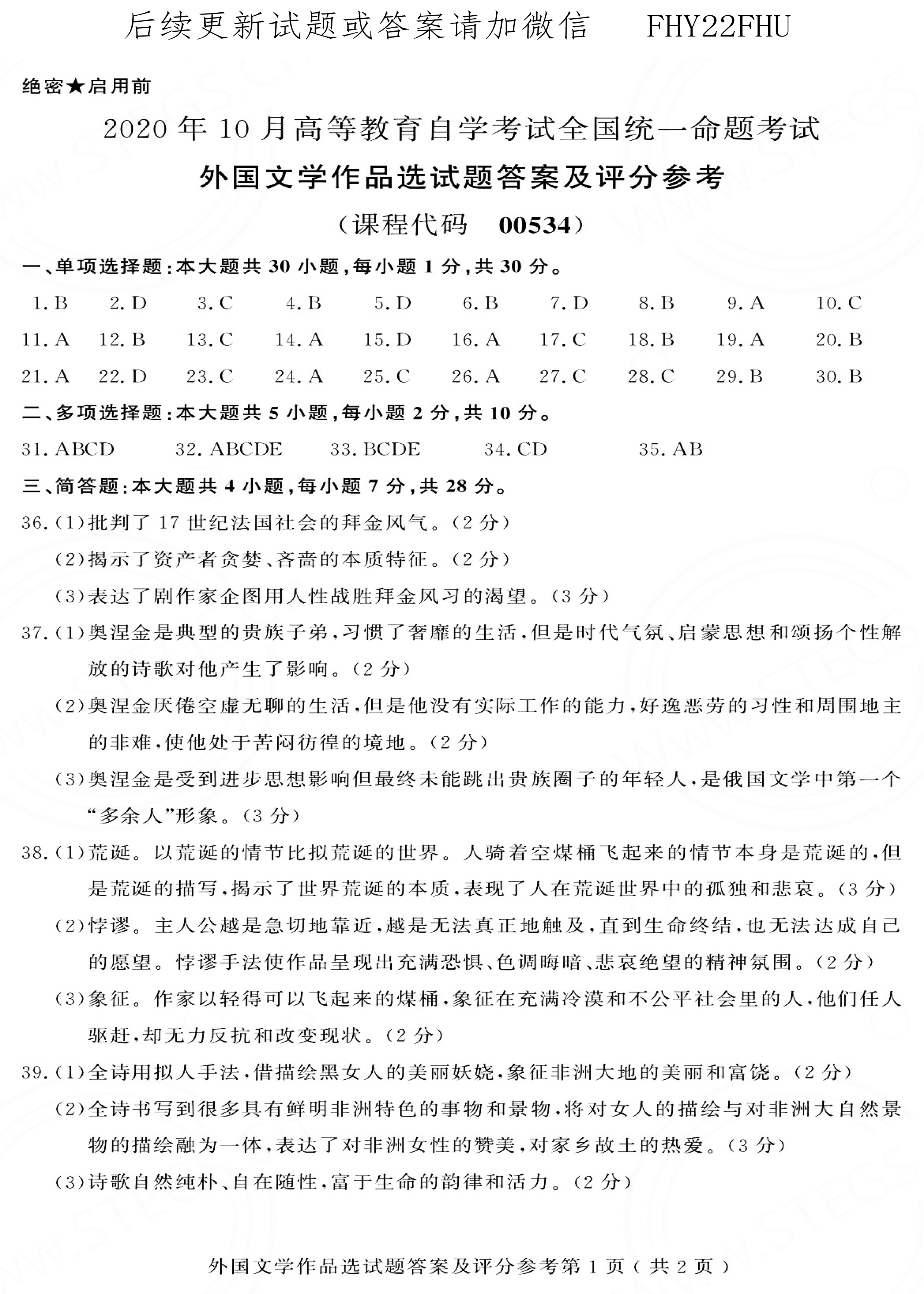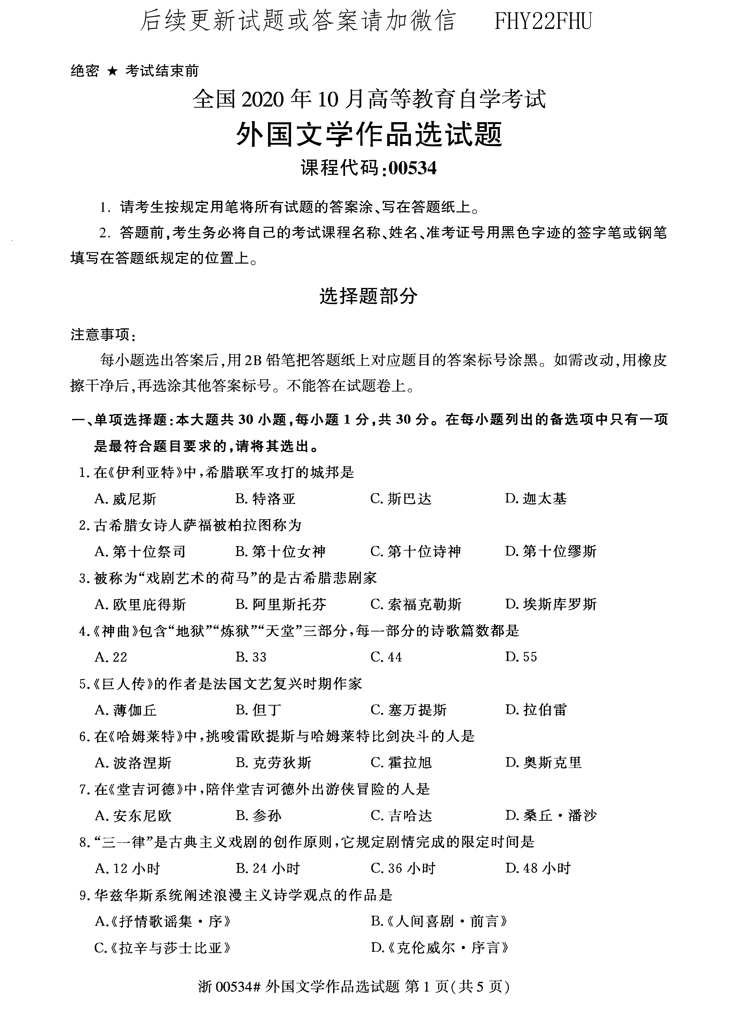 2020年10月贵州省自考00534外国文学作品选试题及答案