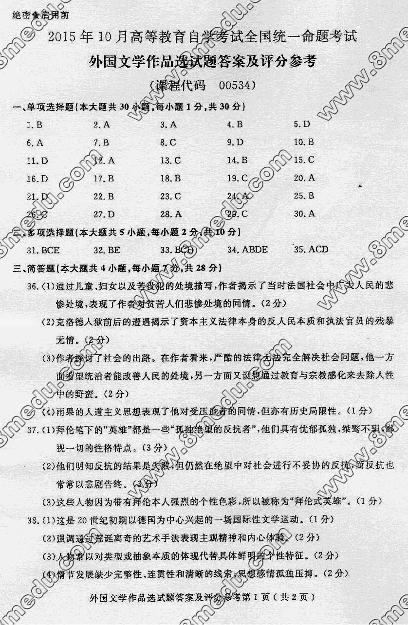 2015年10月贵州省自学考试外国文学作品试题及答案