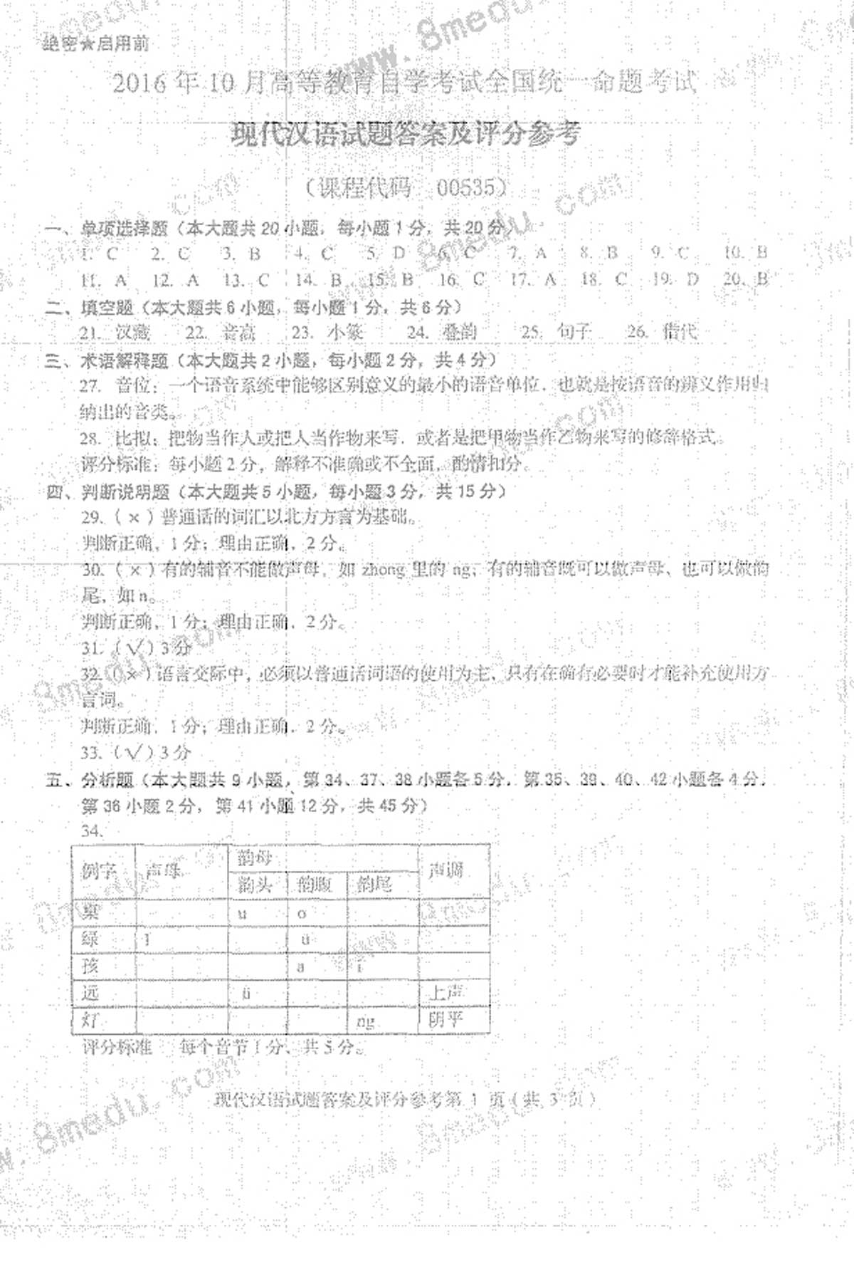 贵州省2016年10月自考00535现代汉语真题及答案
