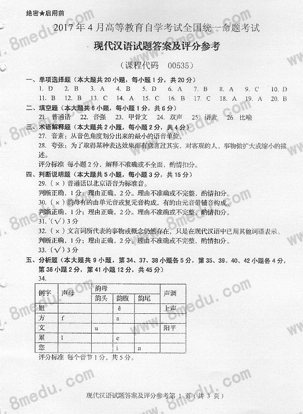 2017年04月贵州自考00535现代汉语真题及答案