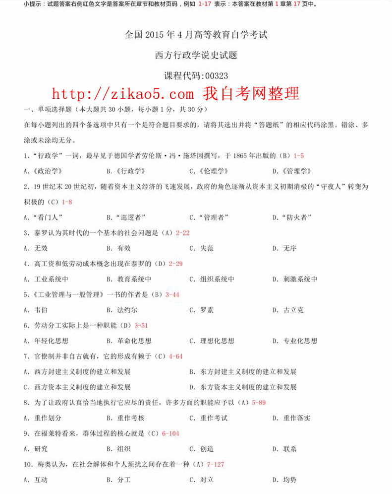 2015年4月贵州自学考试《西方行政学说史》00323试题和答案