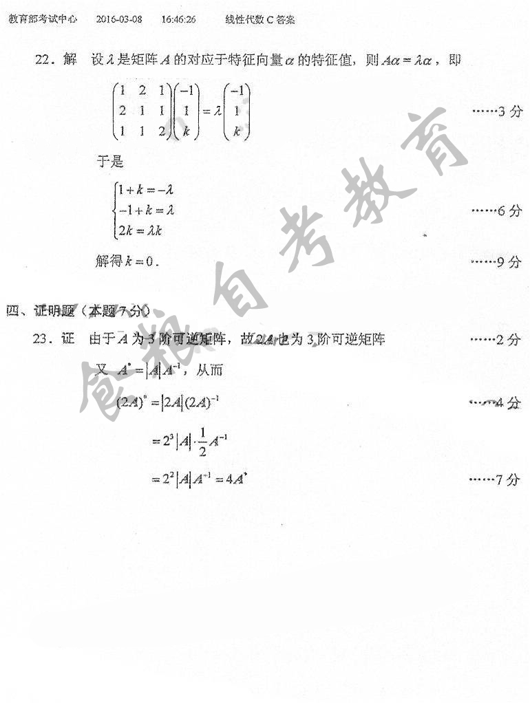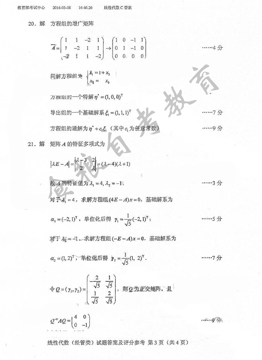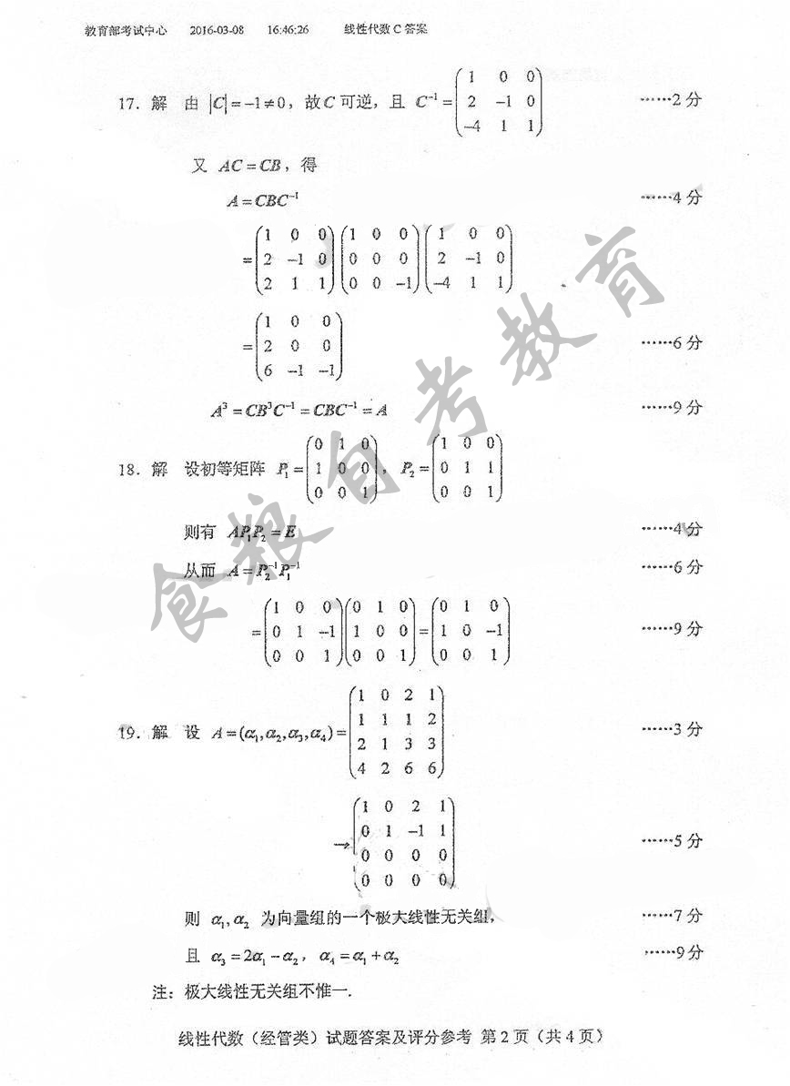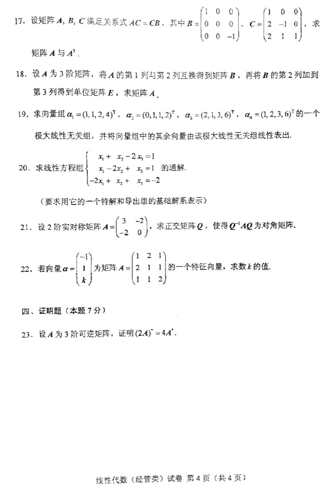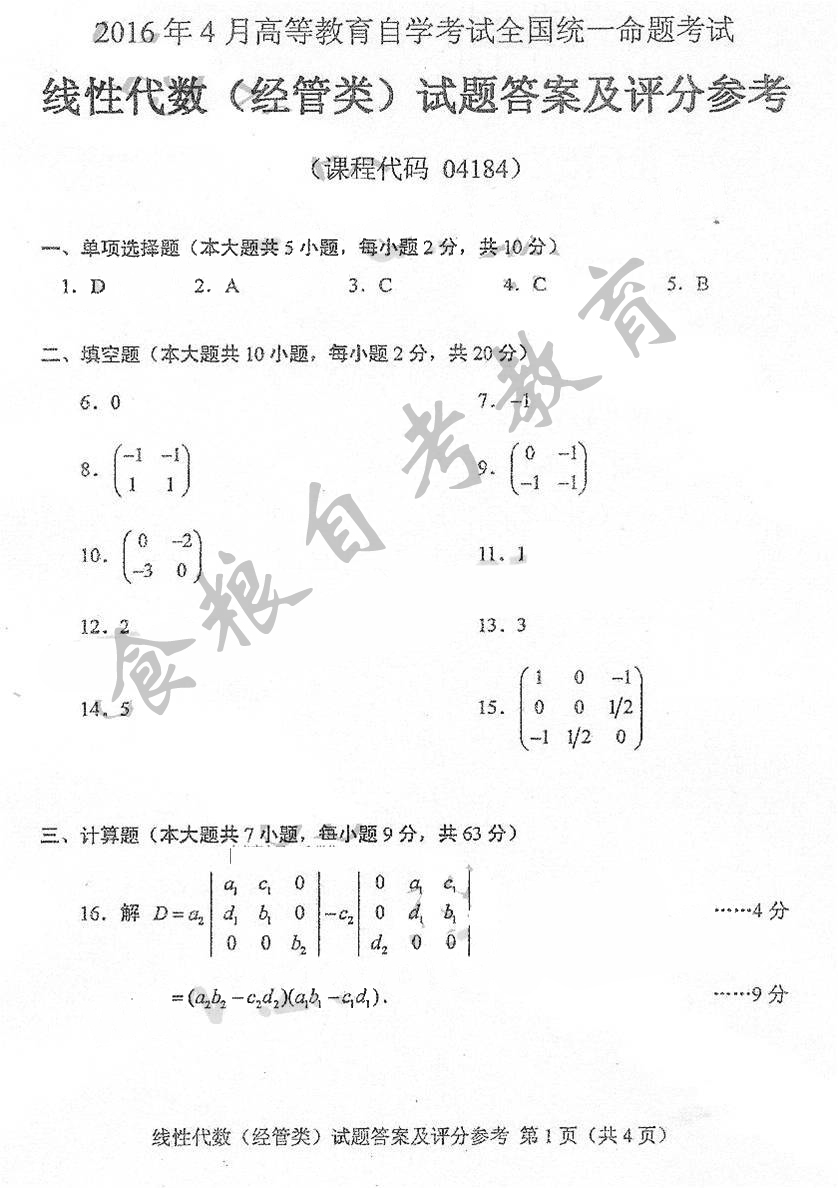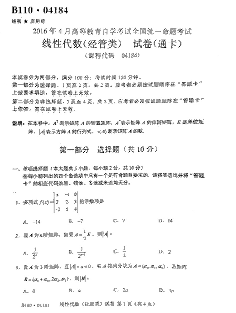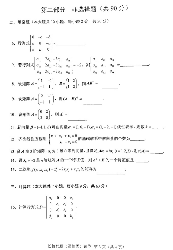 贵州省2016年10月自考04184线性代数(经管类)真题及答案