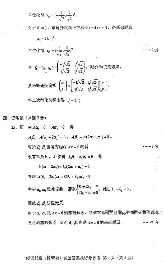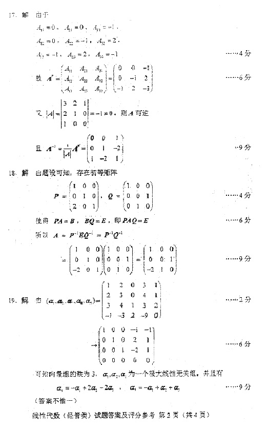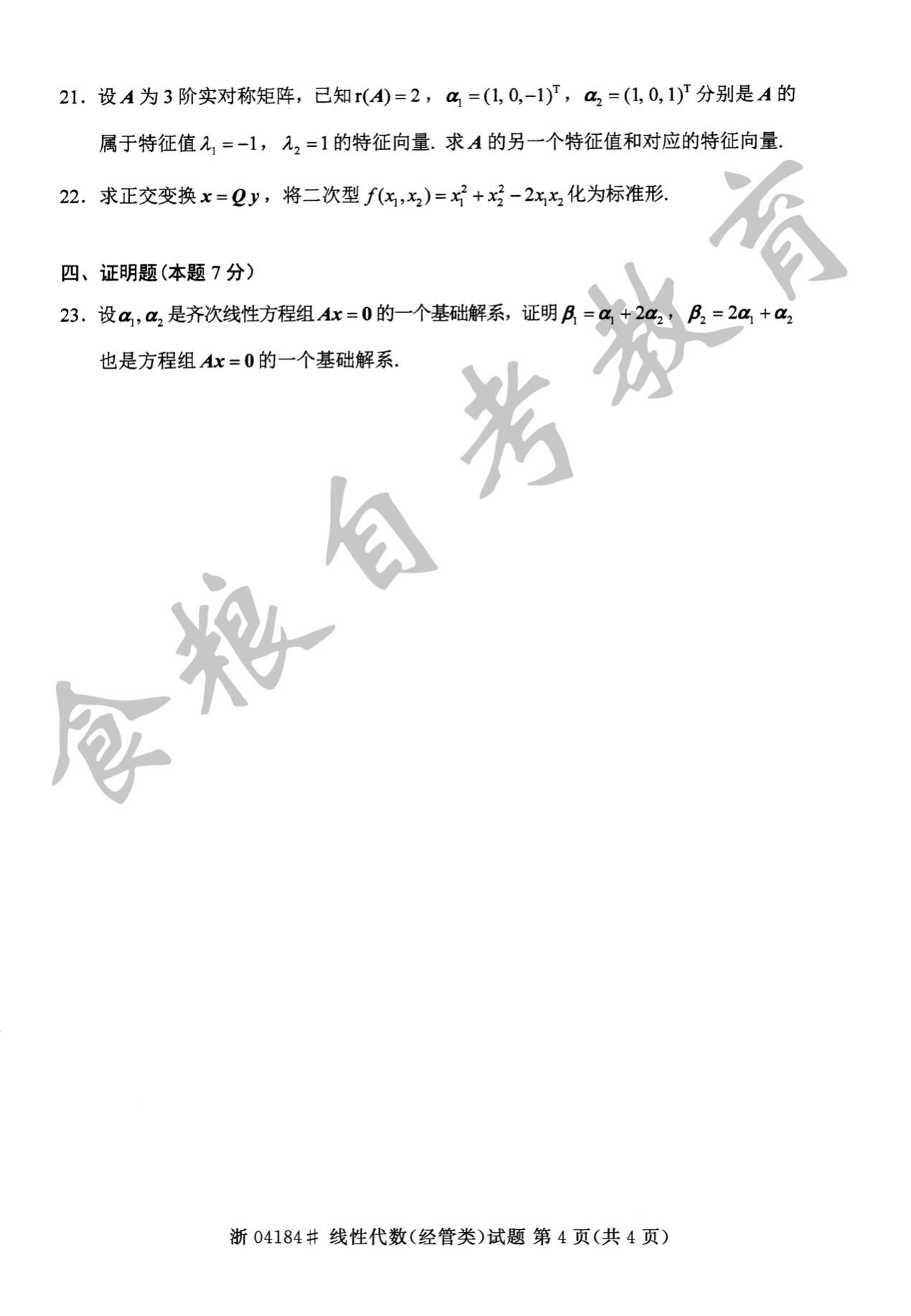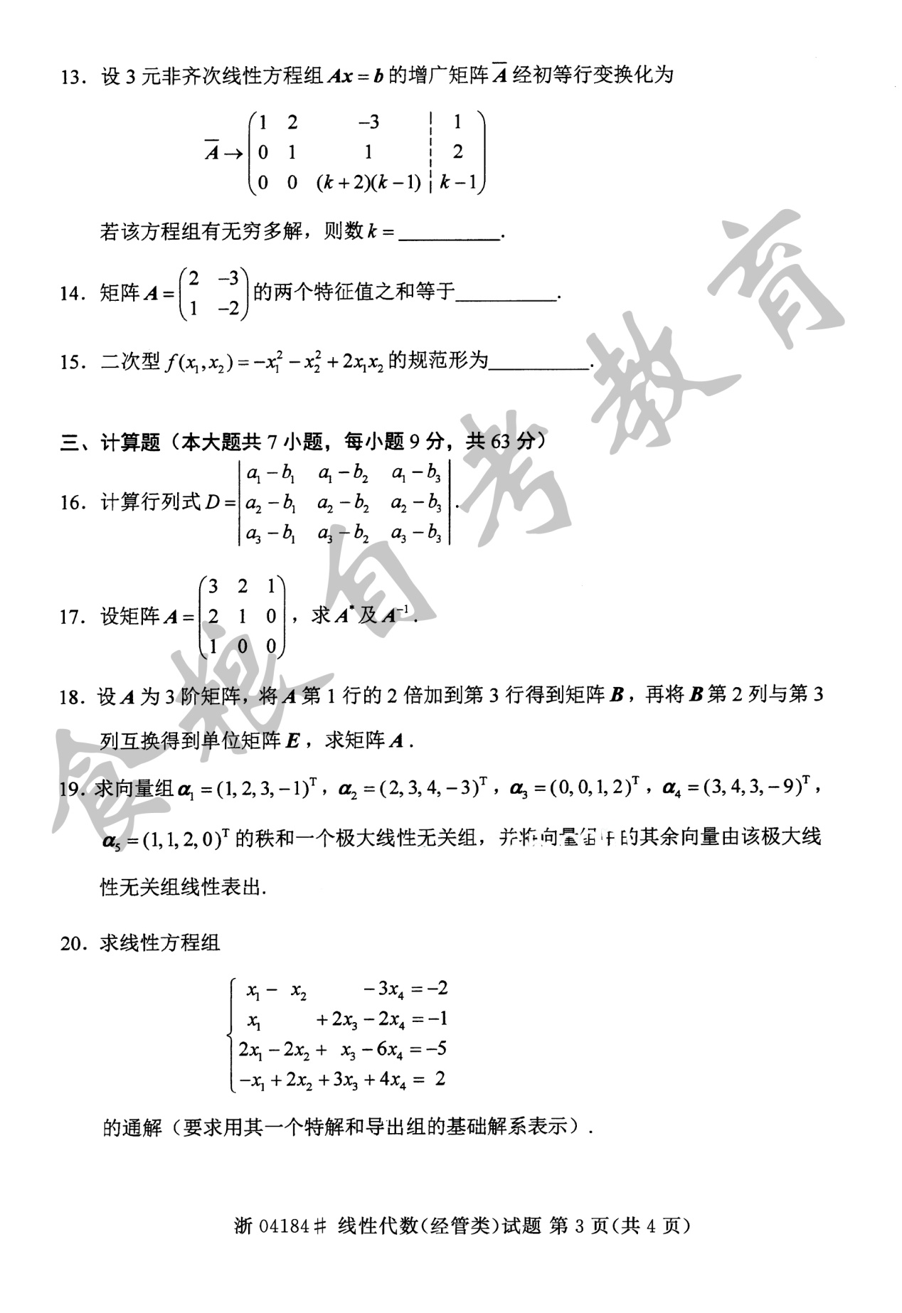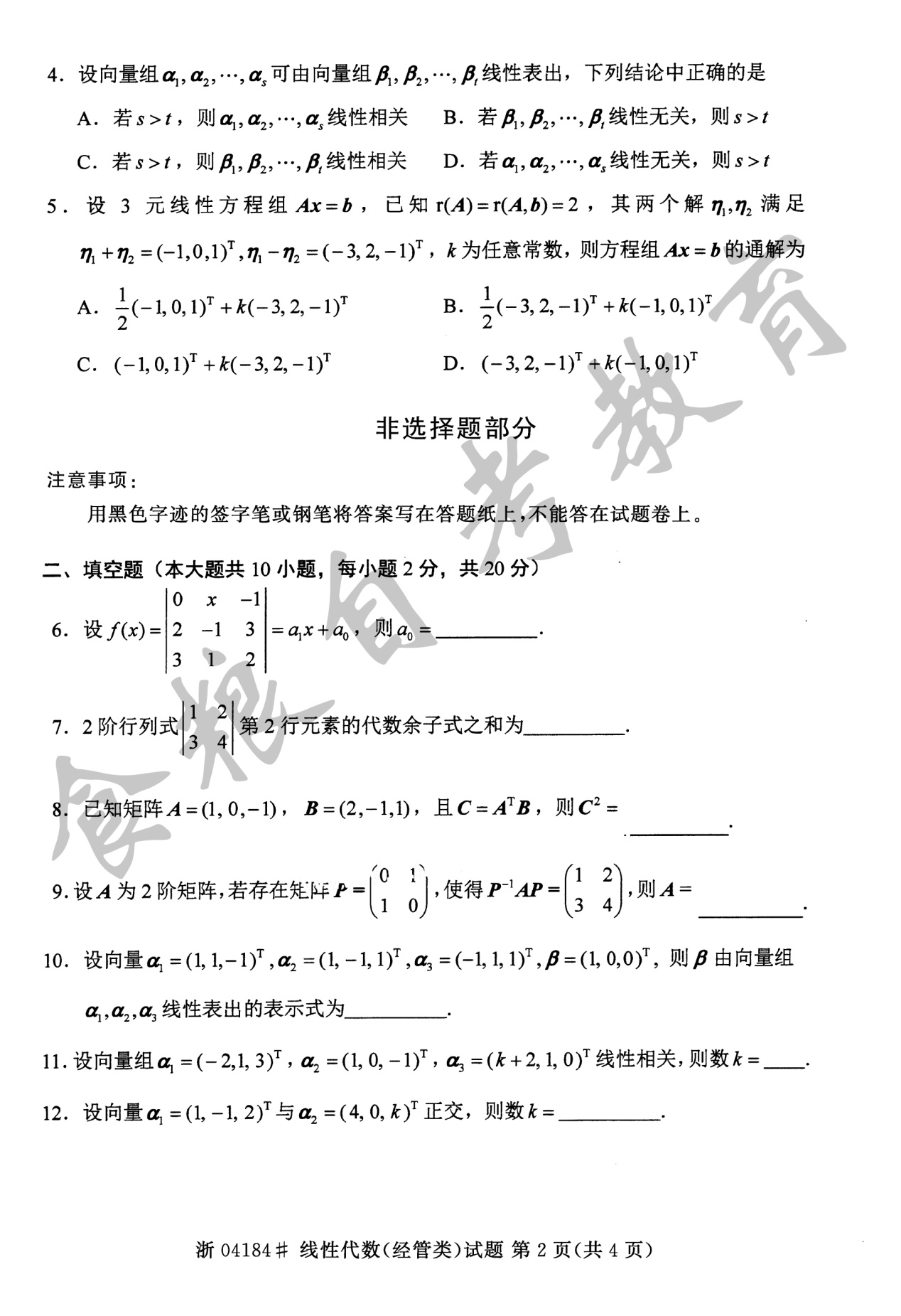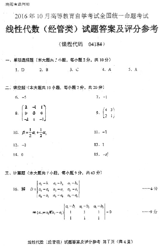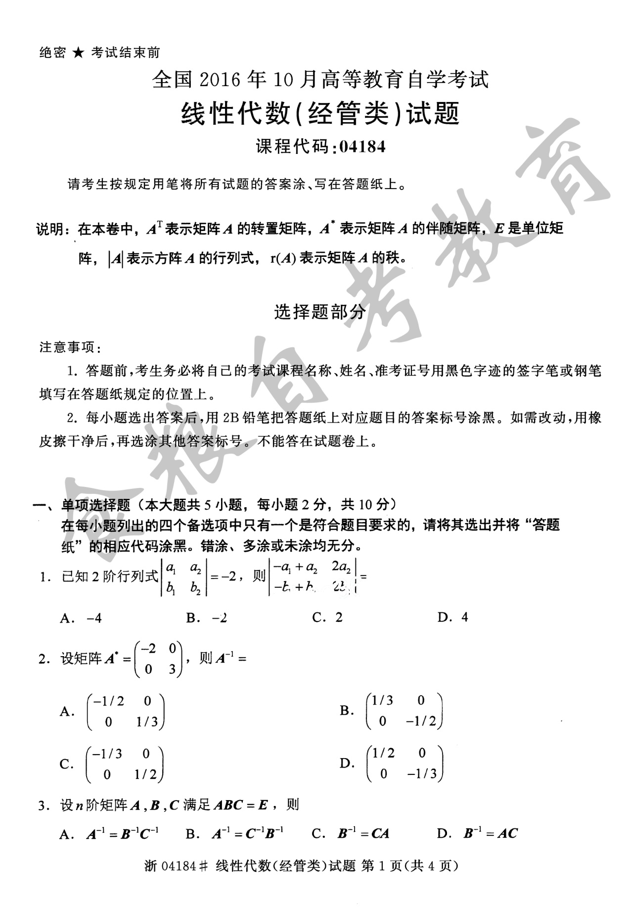 2016年10月贵州省自考04184线性代数(经管类)真题及答案
