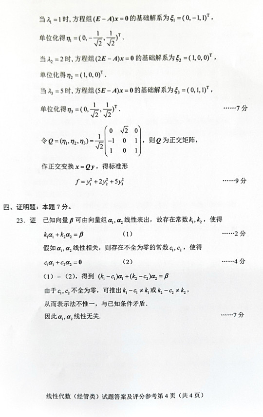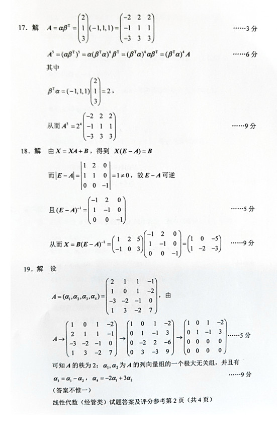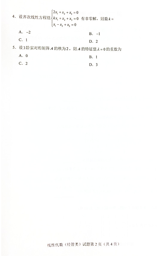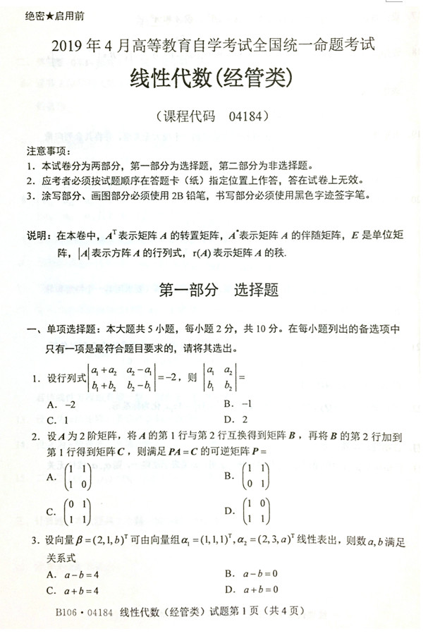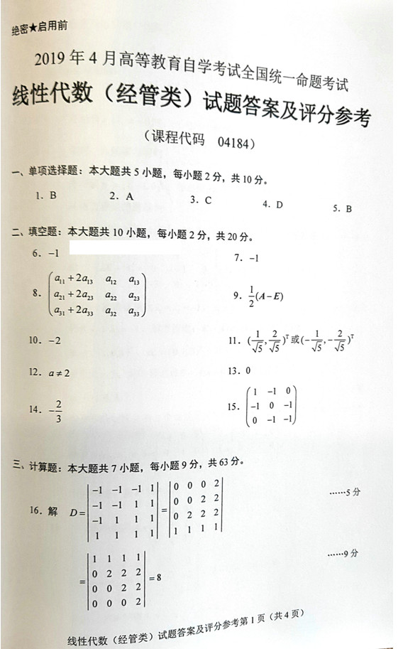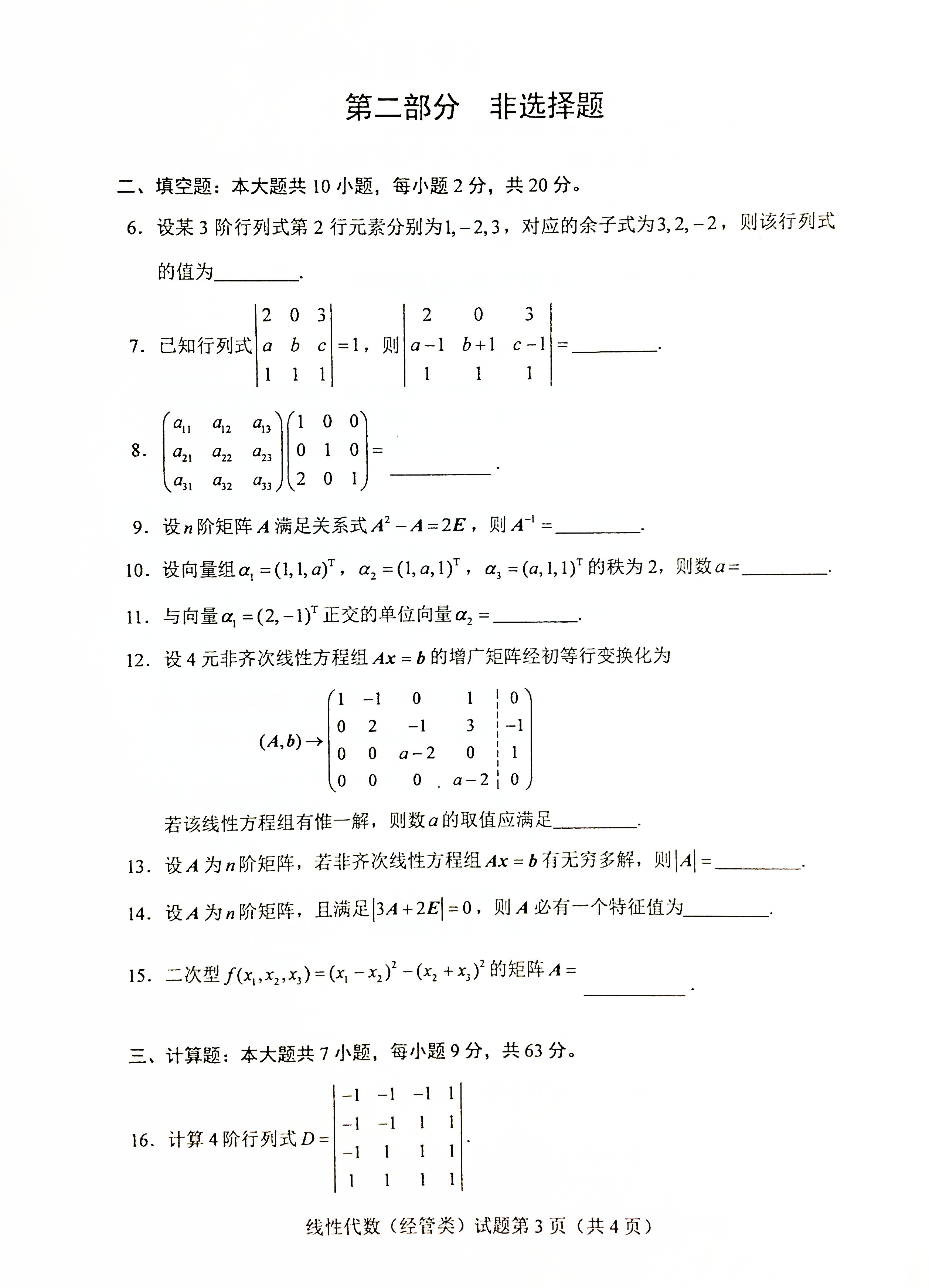 2019年04月贵州自考04184线性代数(经管类)真题及答案