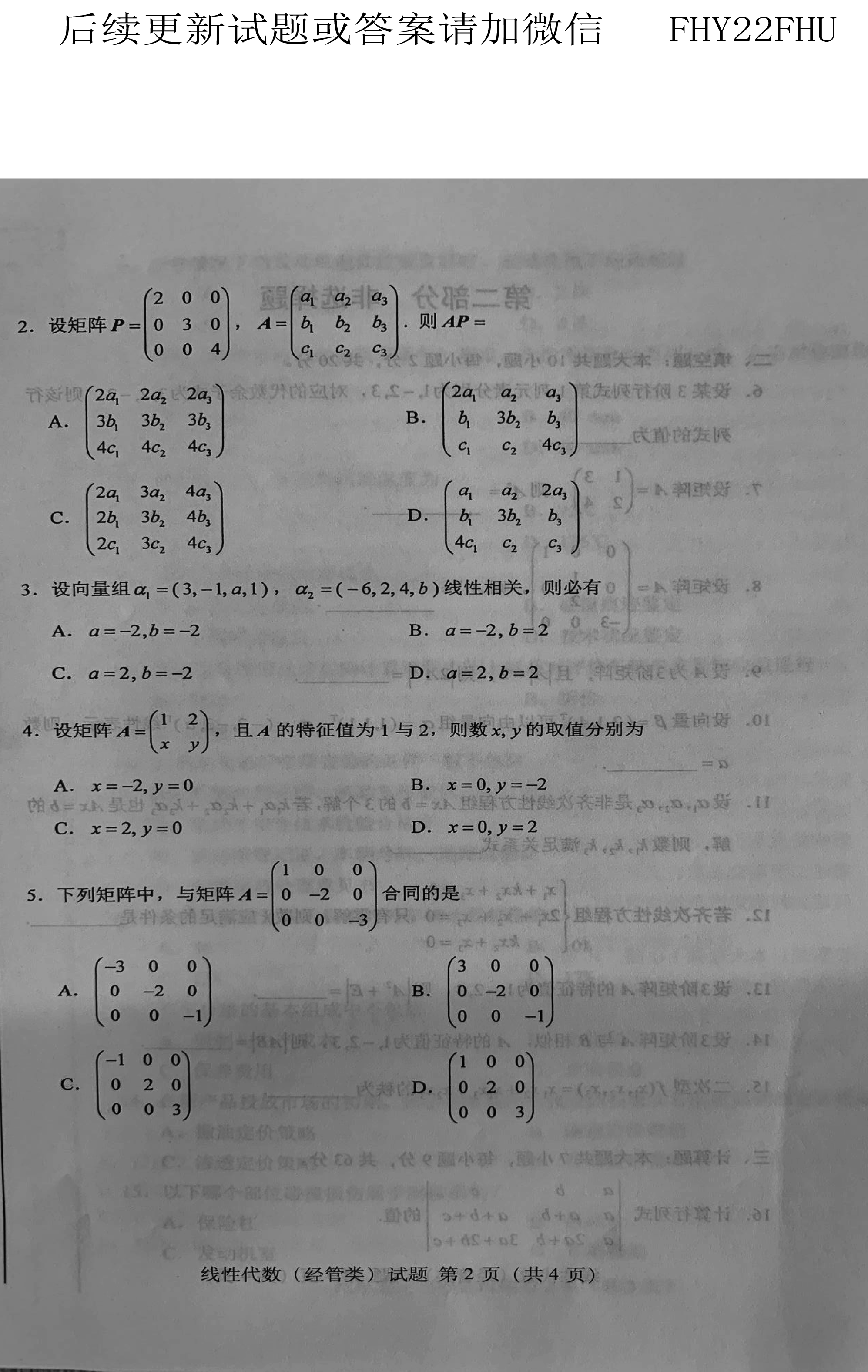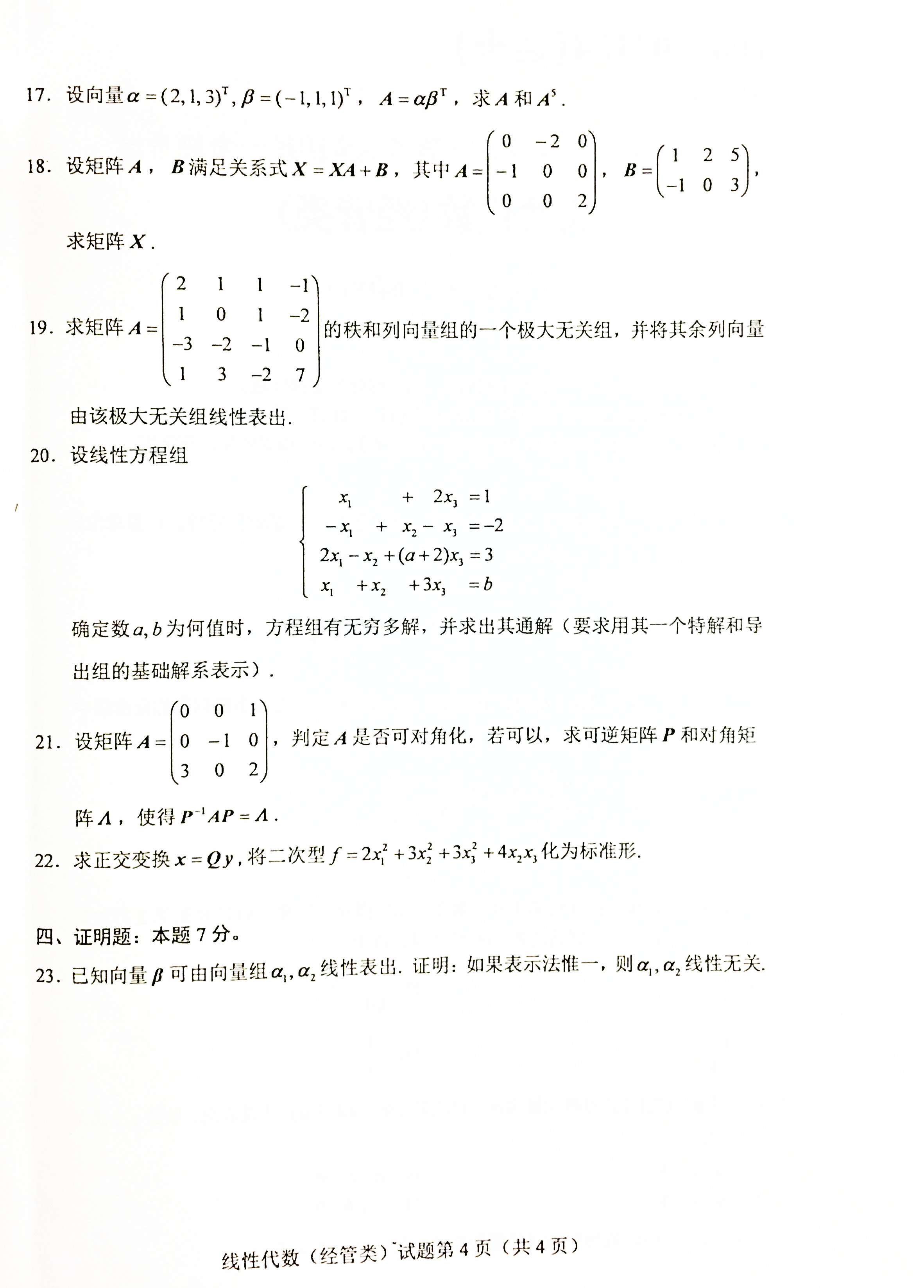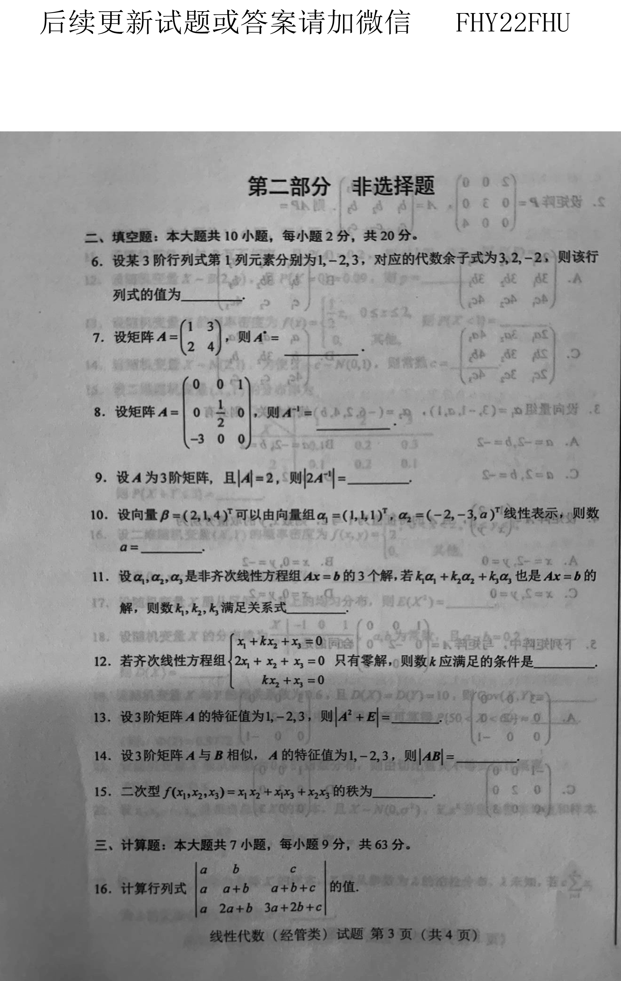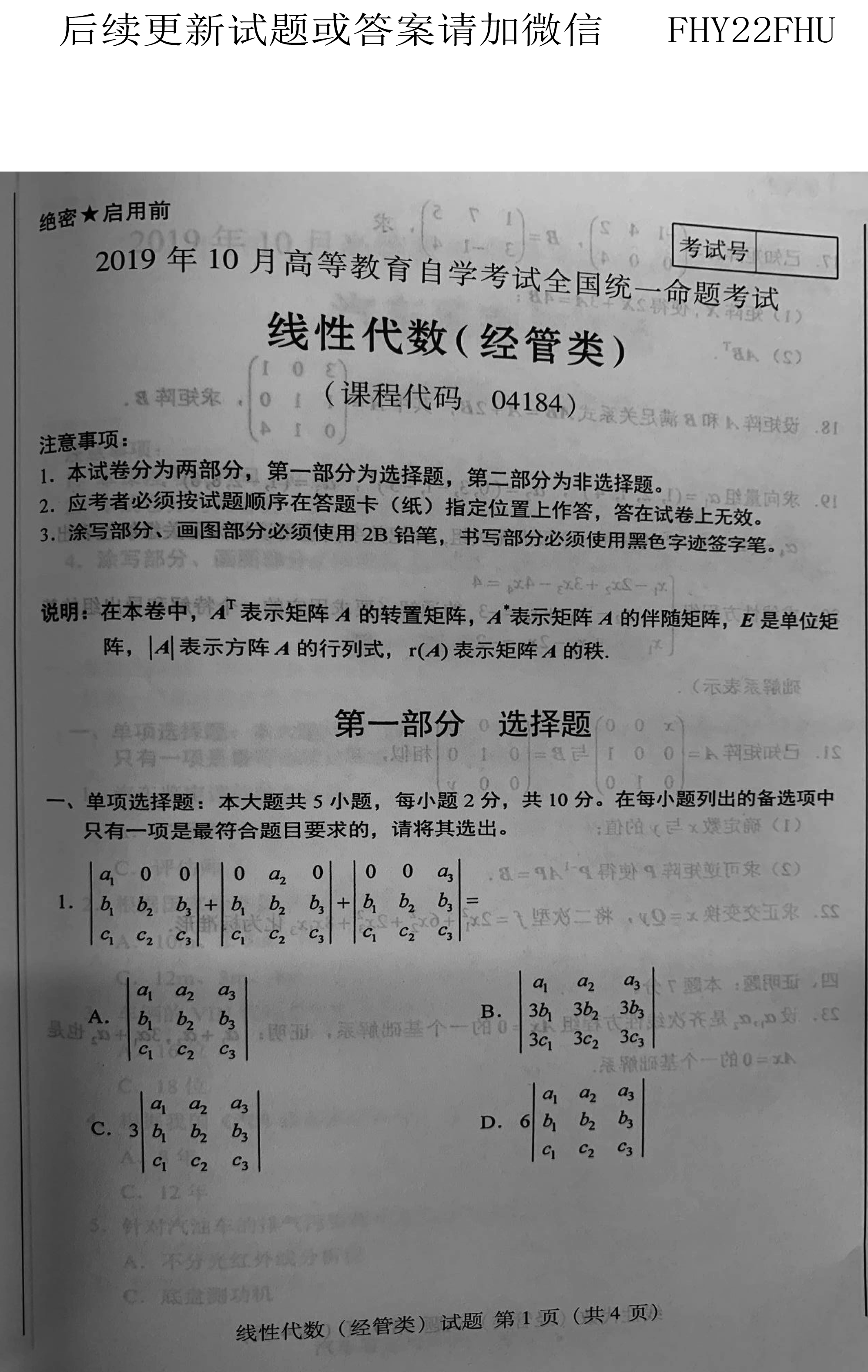 2019年10月贵州自考04184线性代数(经管类)真题及答案