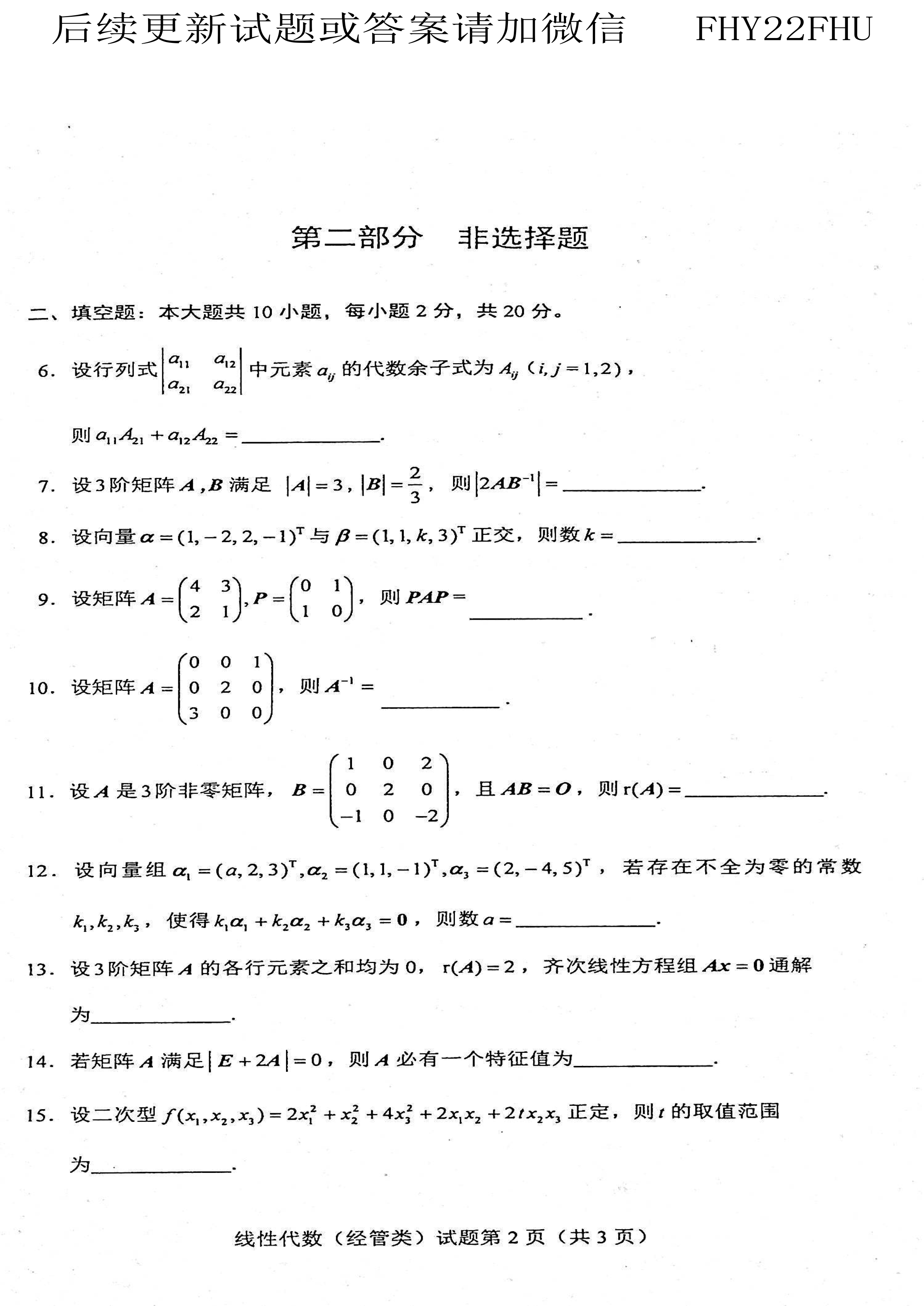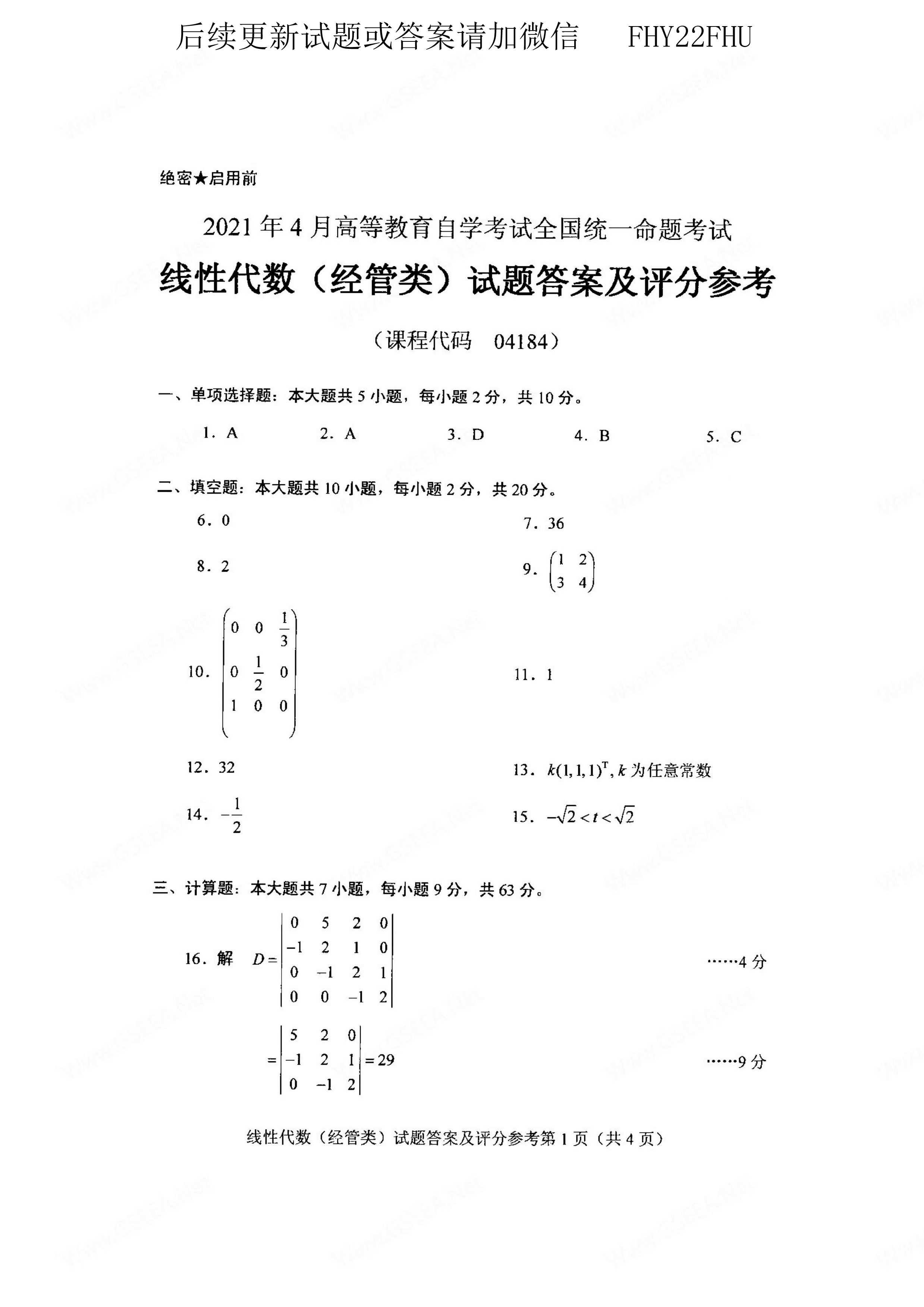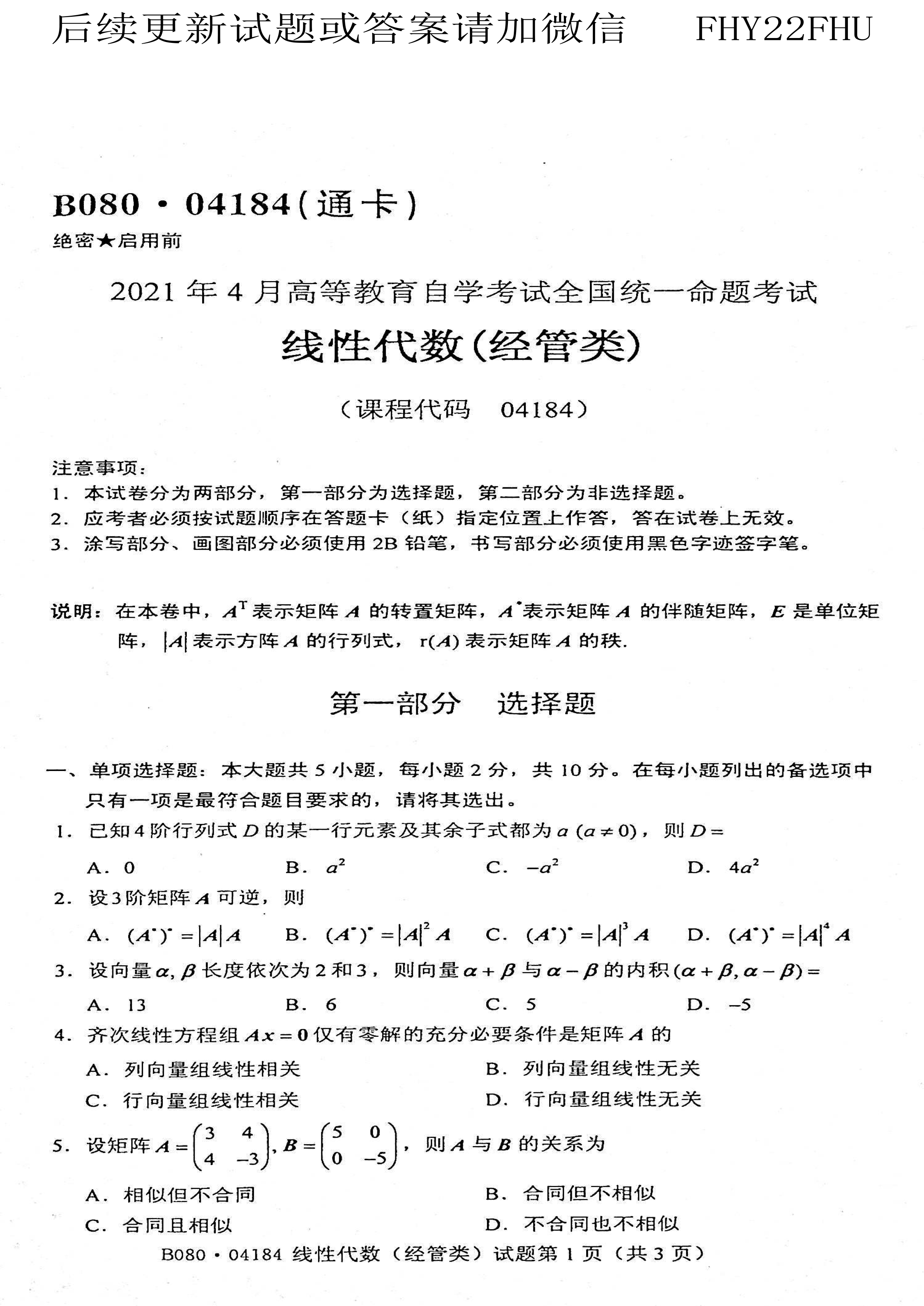 2021年04月贵州省自考04184线性代数(经管类)试题及答案