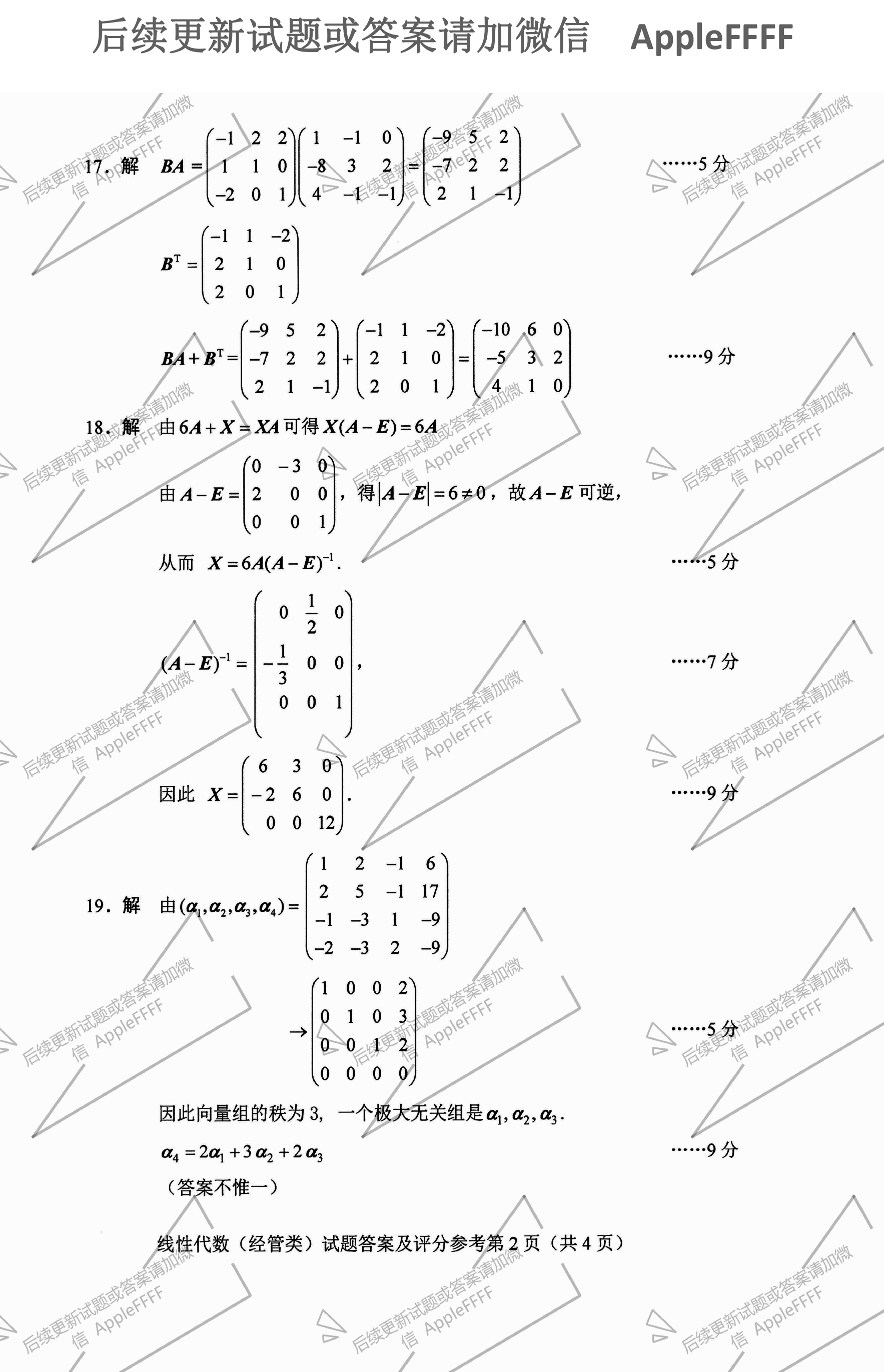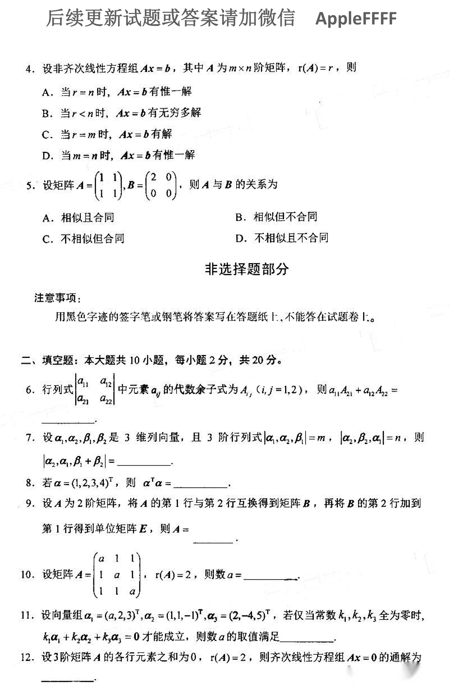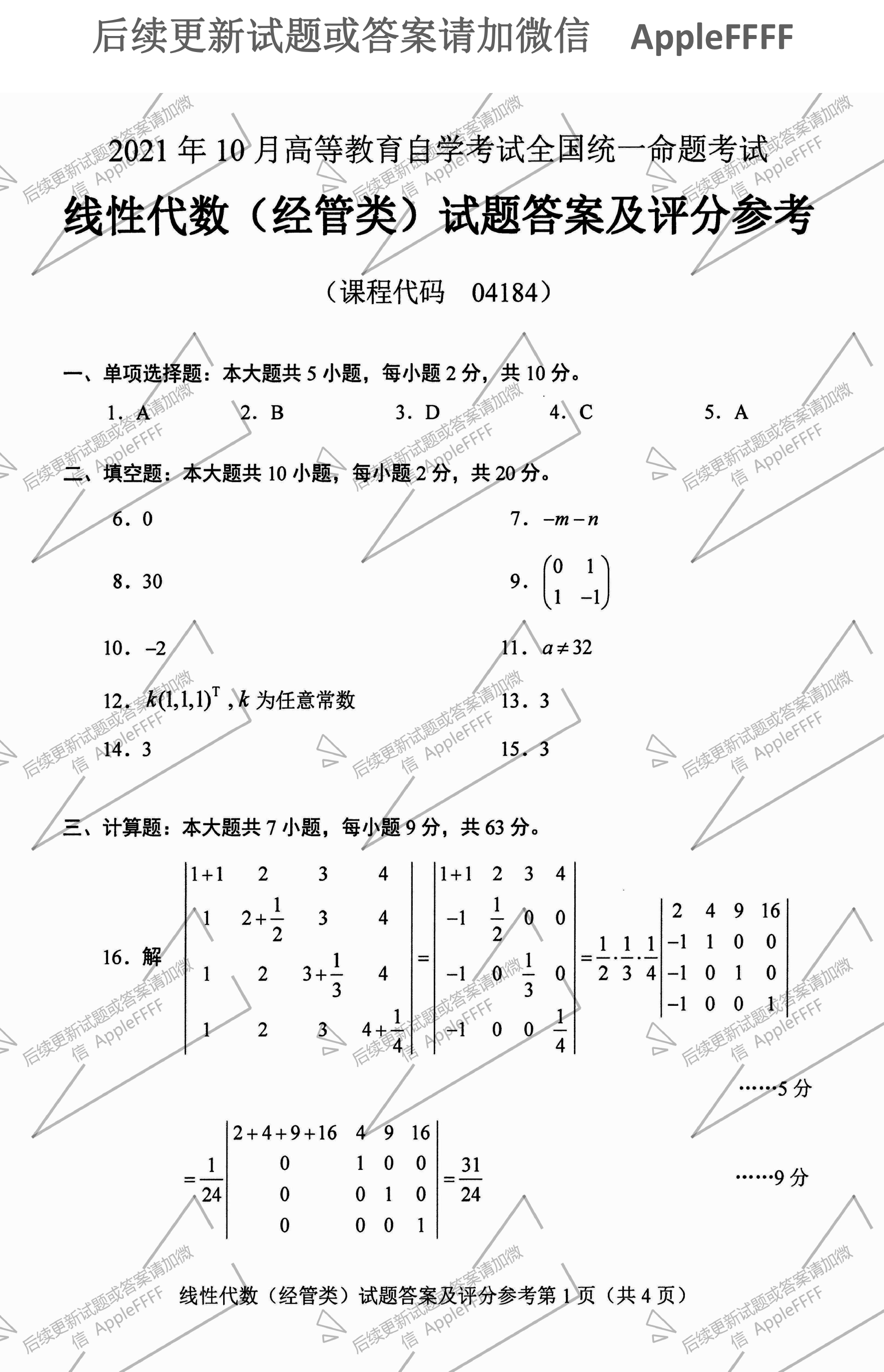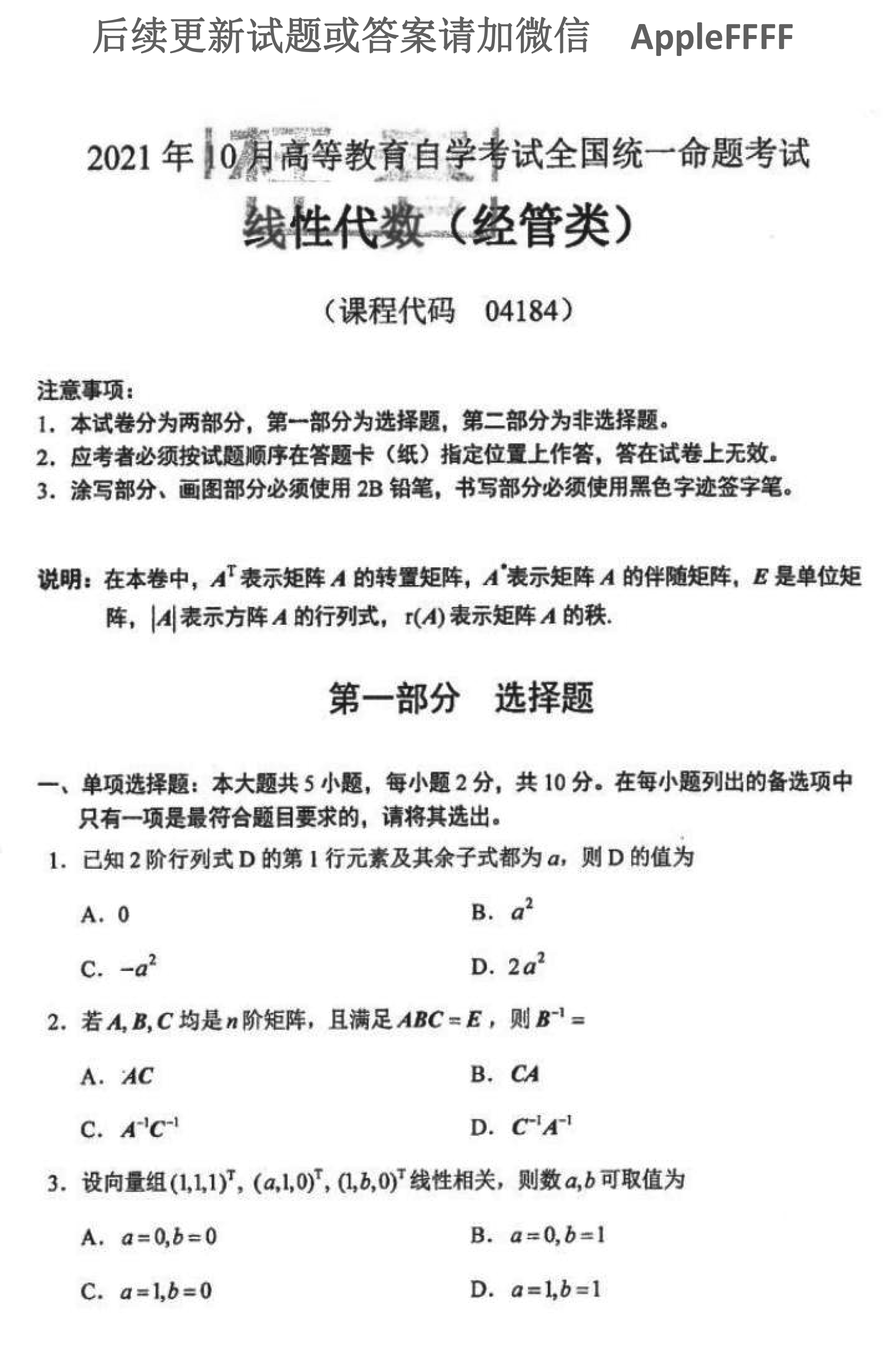 贵州省2021年10月自考04184线性代数(经管类)试题及答案