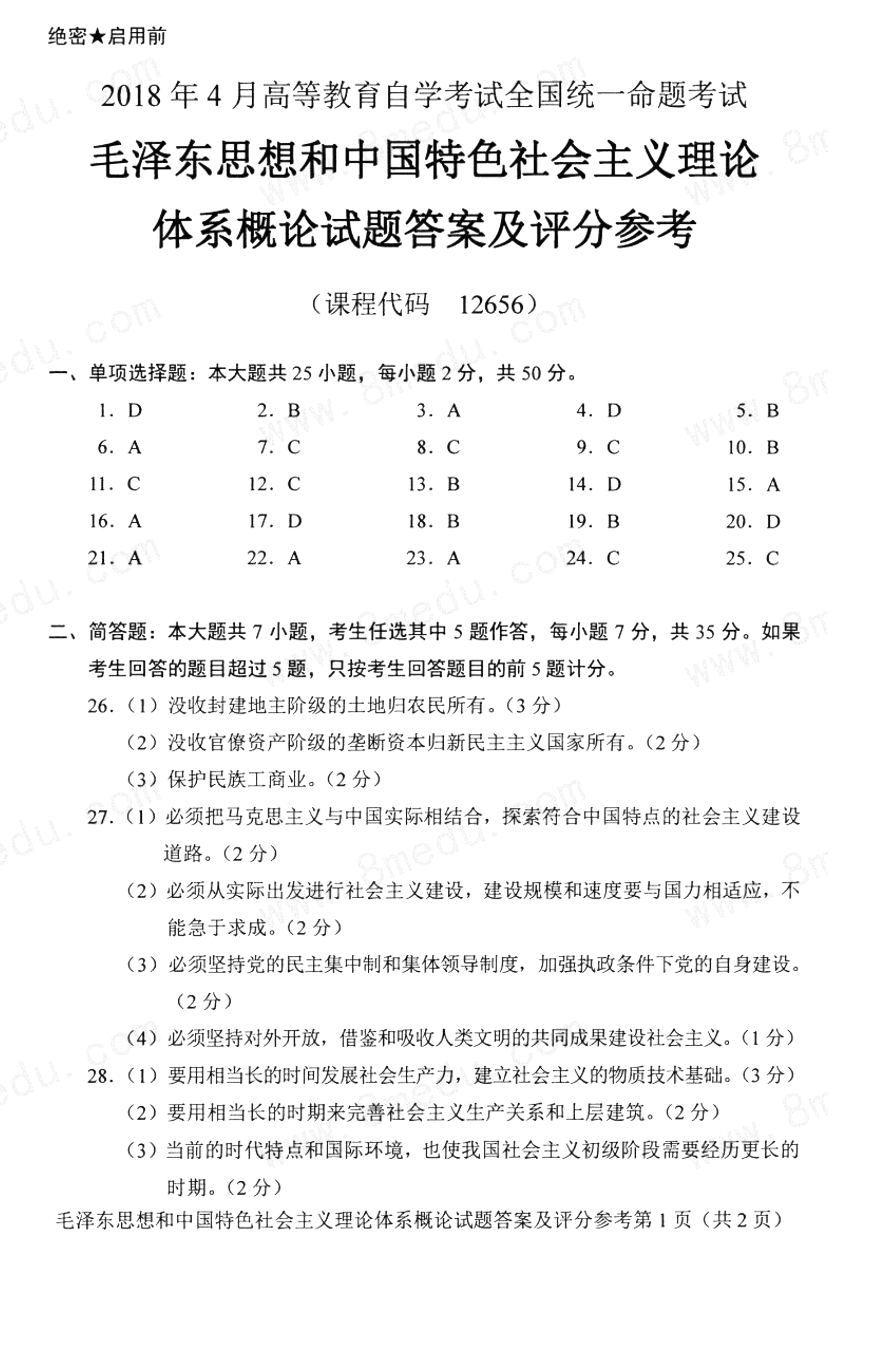2018年04月贵州自考12656毛泽东思想和中国特色社会主义理论真题及答案