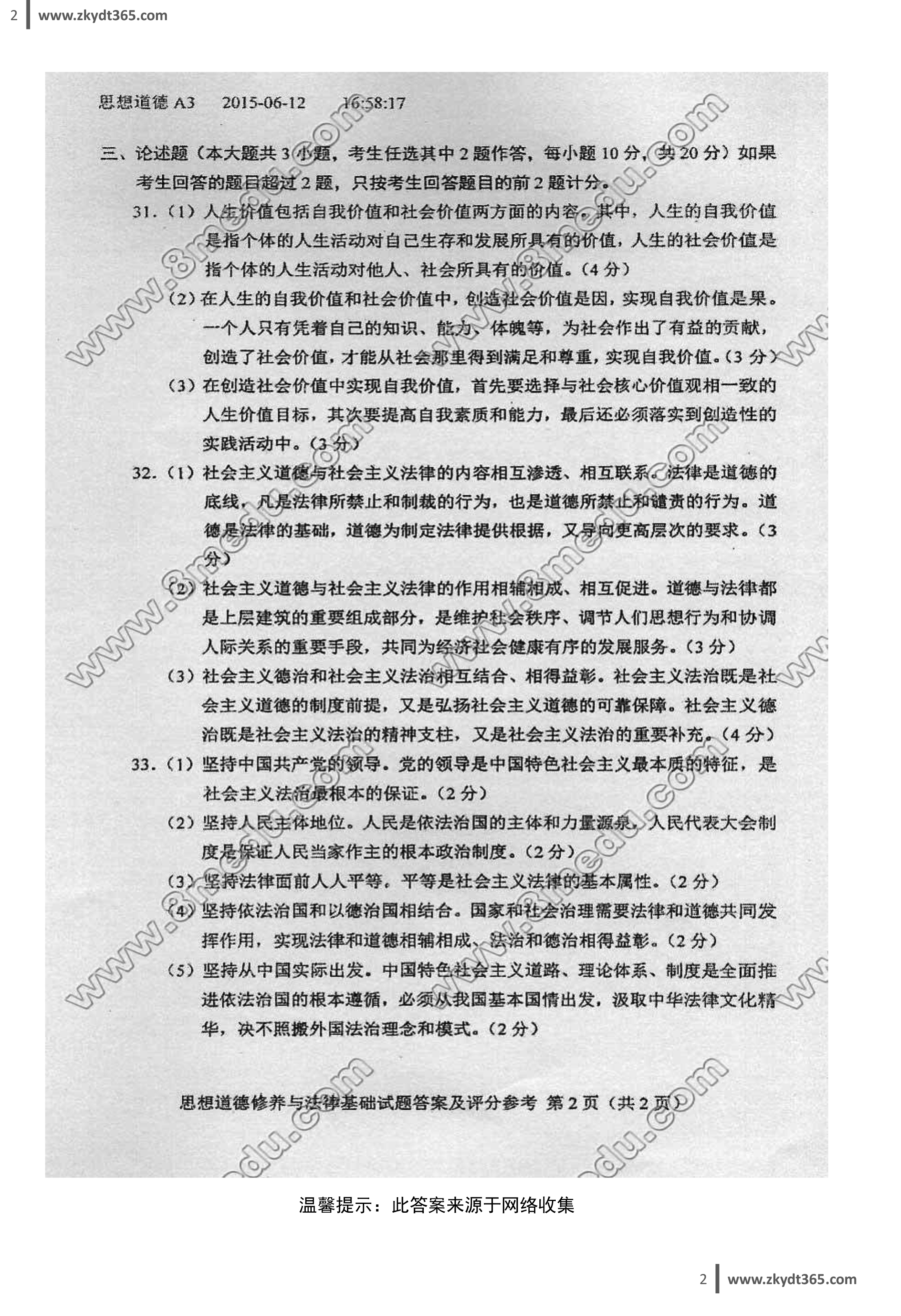 32.习近平指出:“法律是成文的道德,道德是内心的法律,法律和道德都具有规范社会行为、维护社会秩序的作用。治理国家、治理社会必须一手抓法治、一手抓德治,既重视发挥法律的规范作用,又重视发挥道德的教化作用,实现法律和道德相辅相成、法治和德治相得益彰。”联系实际论述为什么我国社会主义道德建设要与社会主义法律规范相协调。微信公众号:zkydt365