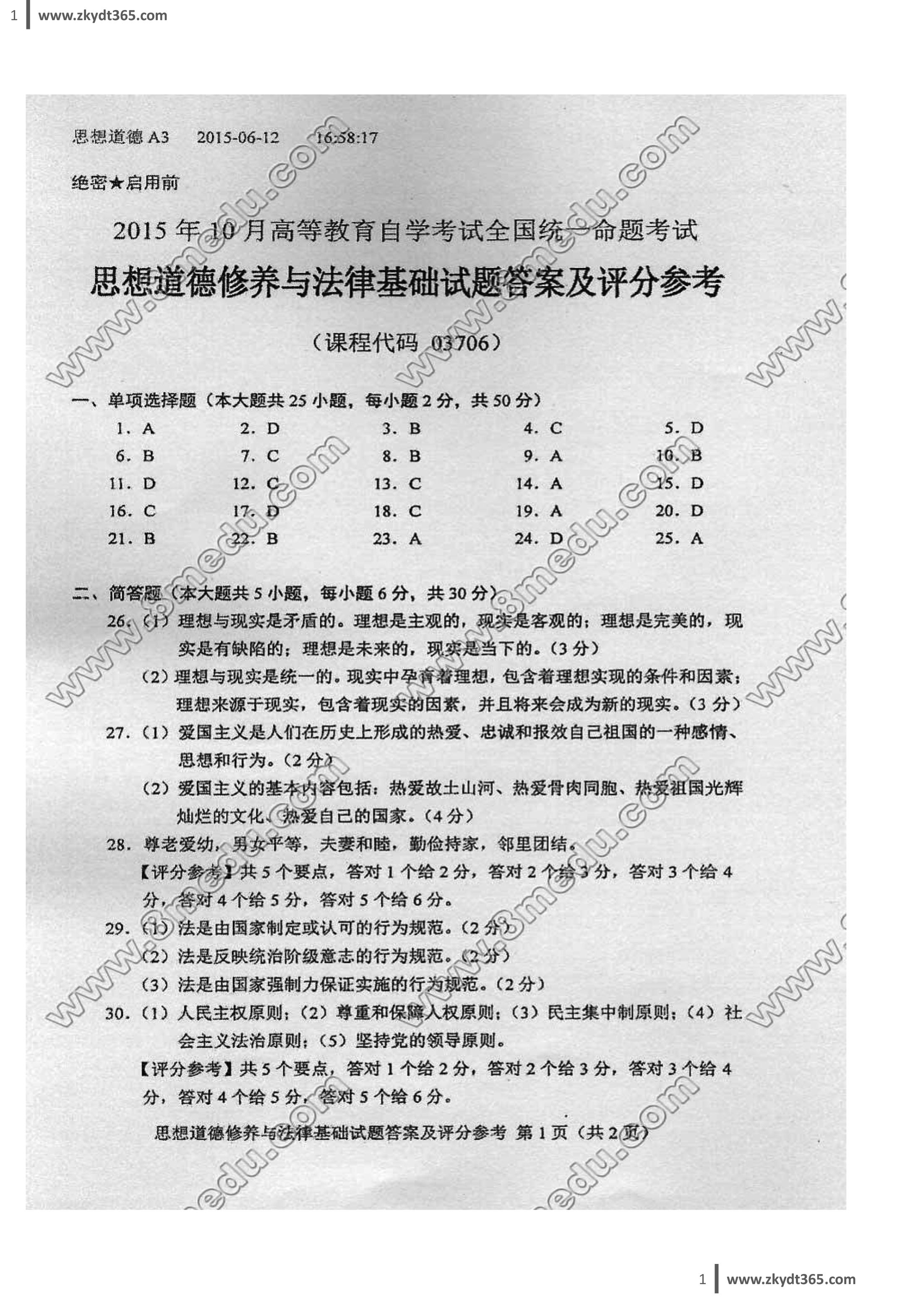 贵州省2015年10月自学考试03706《思想道德修养与法律基础》真题及答案
