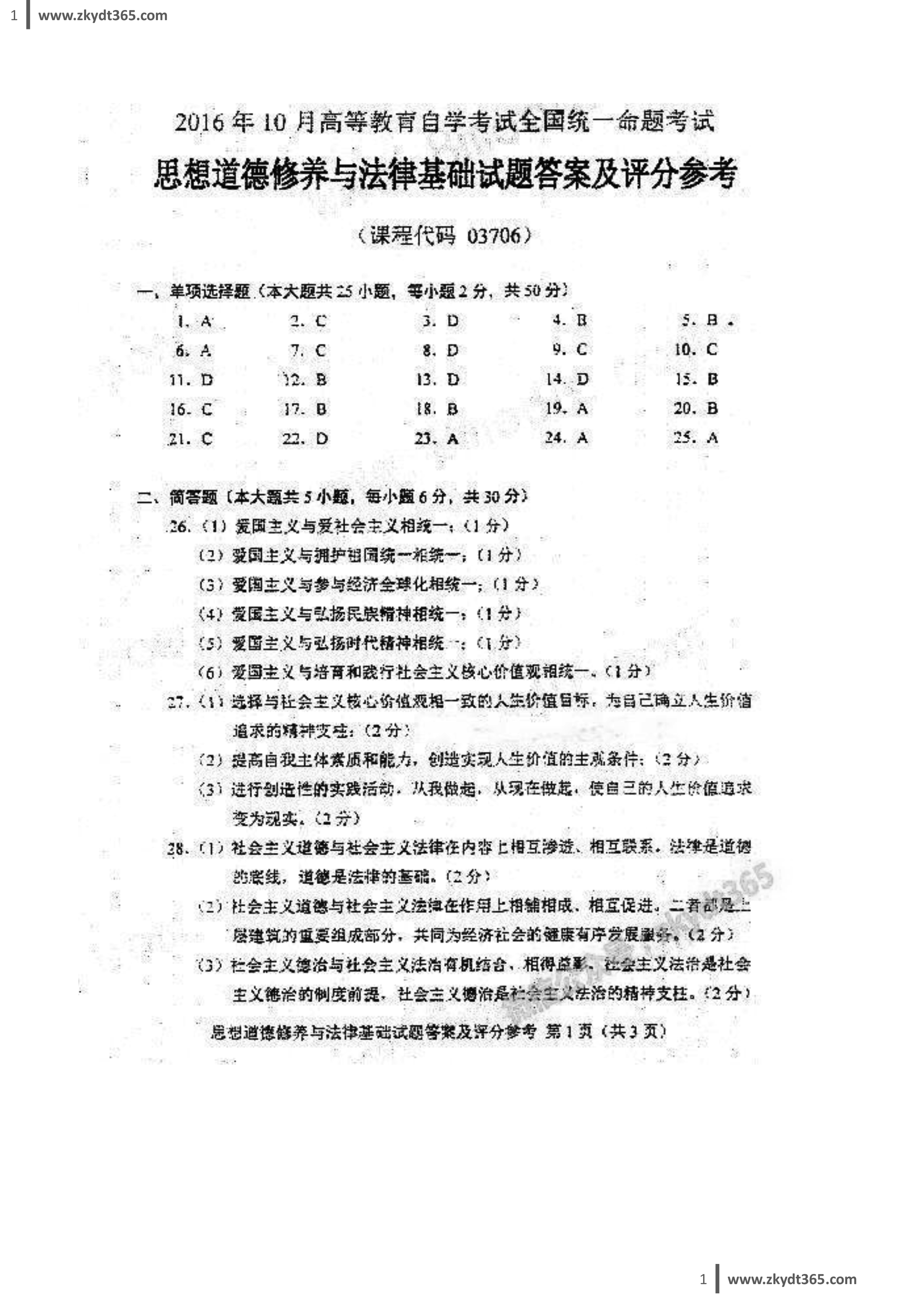 贵州省2016年10月自学考试03706《思想道德修养与法律基础》真题及答案