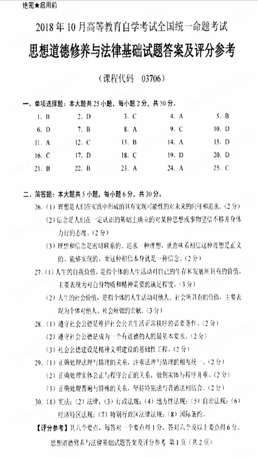 2018年10月贵州自考03706思想道德修养与法律基础试题及答案