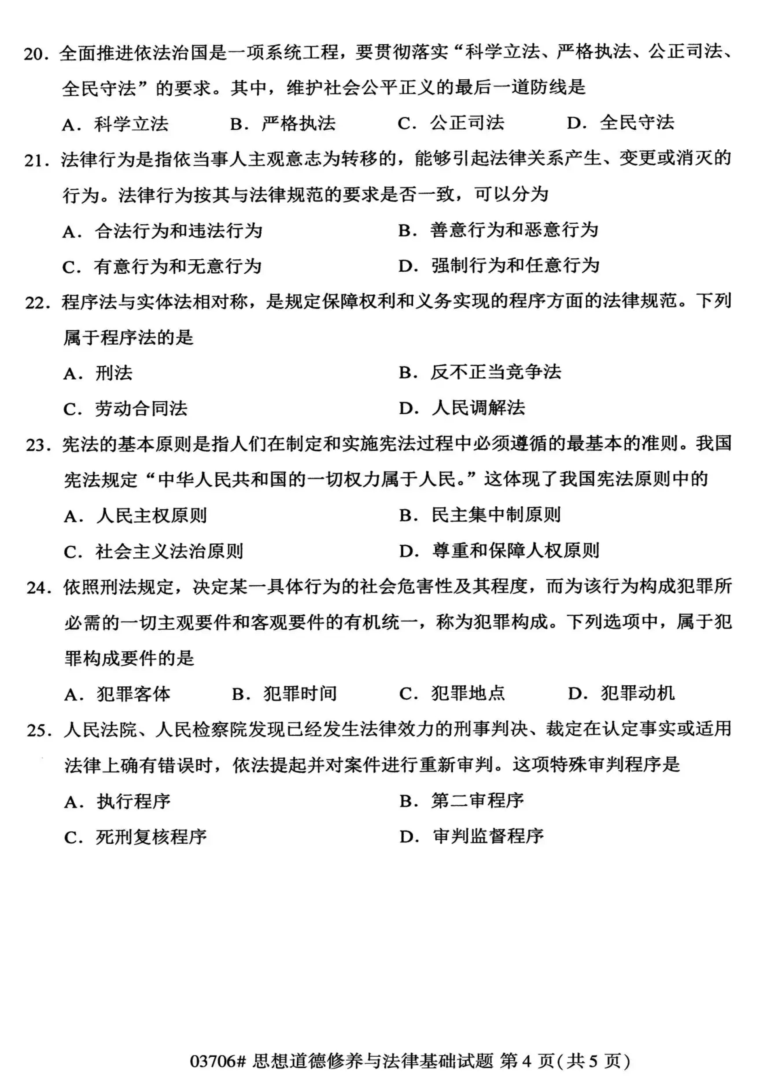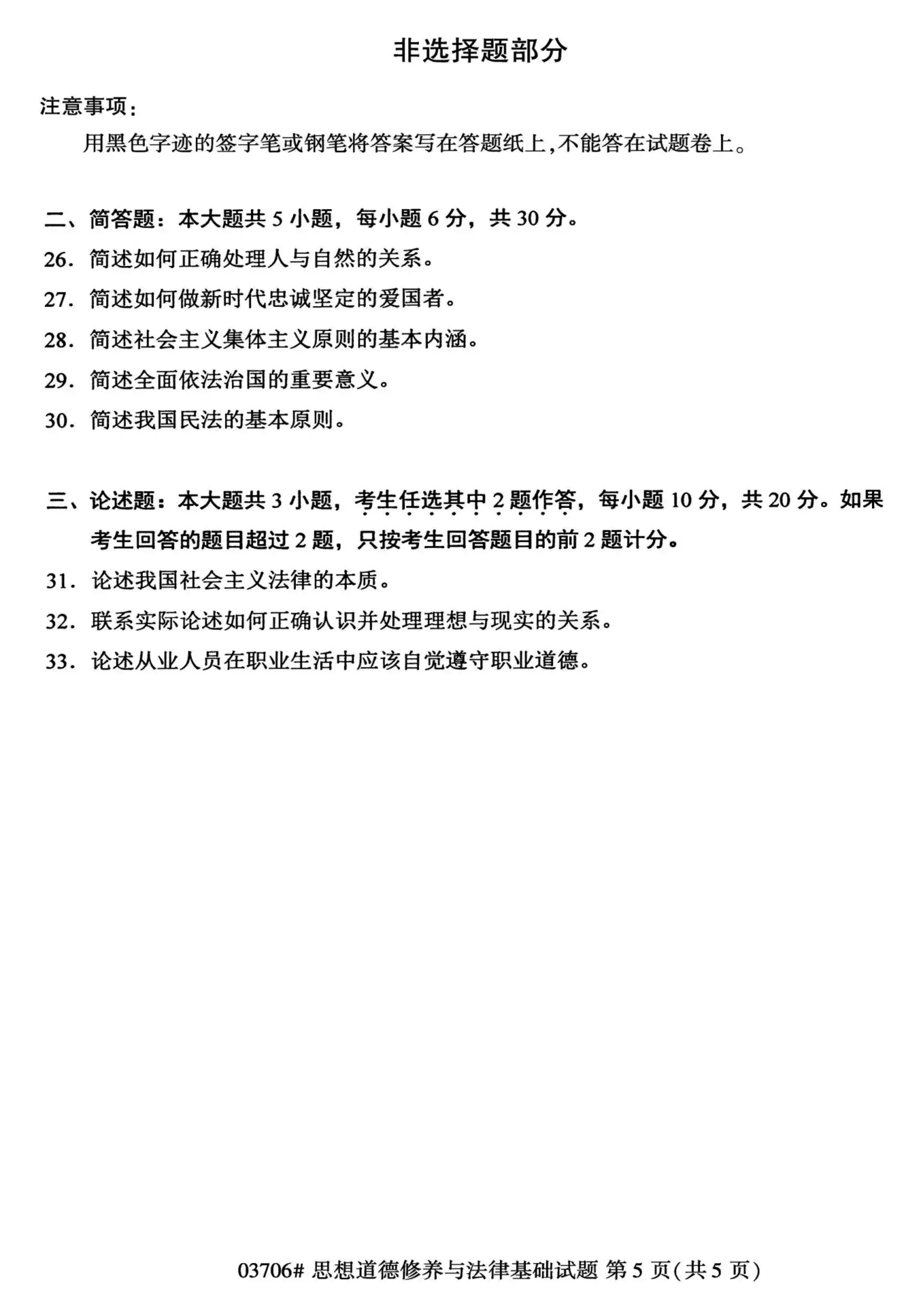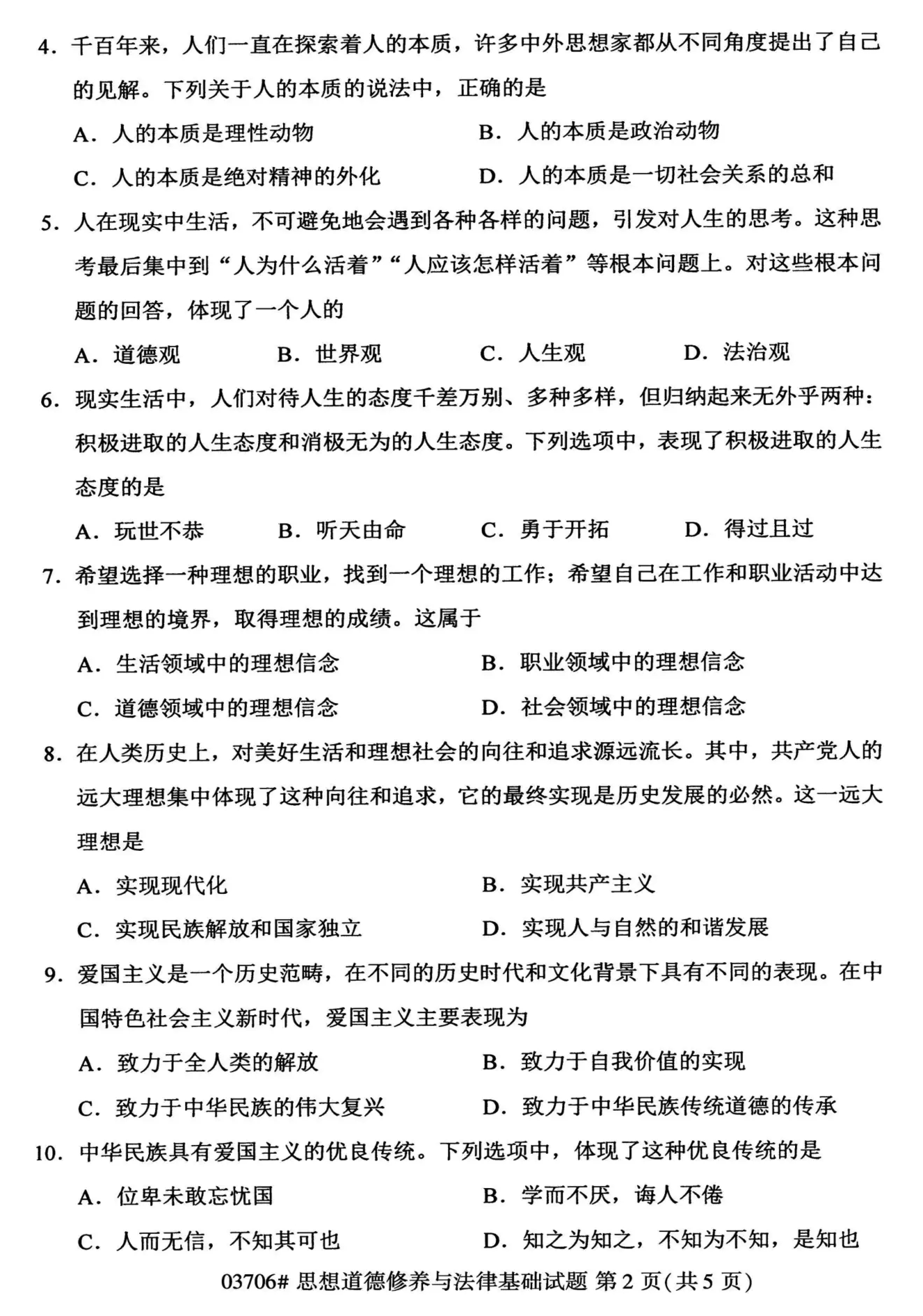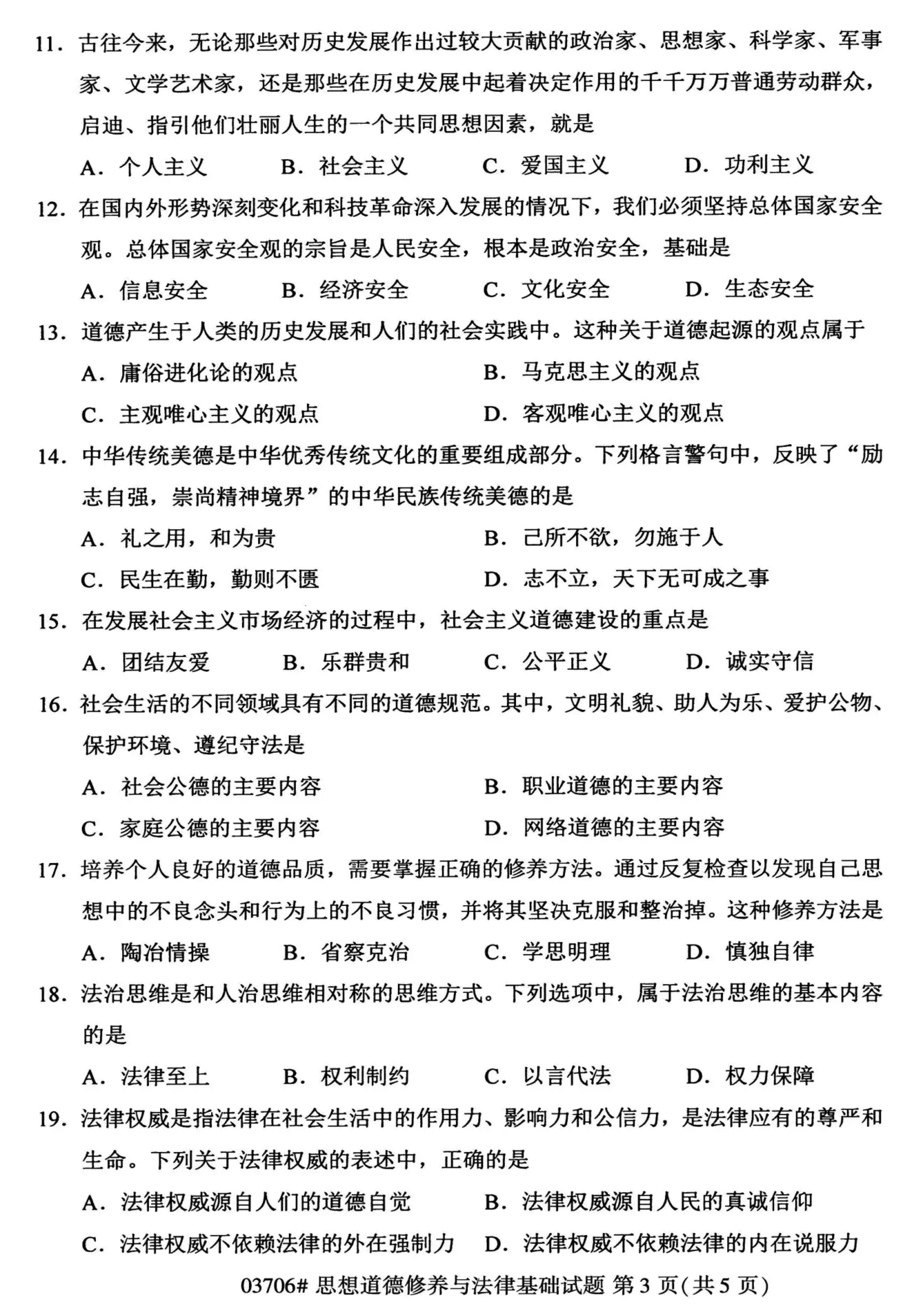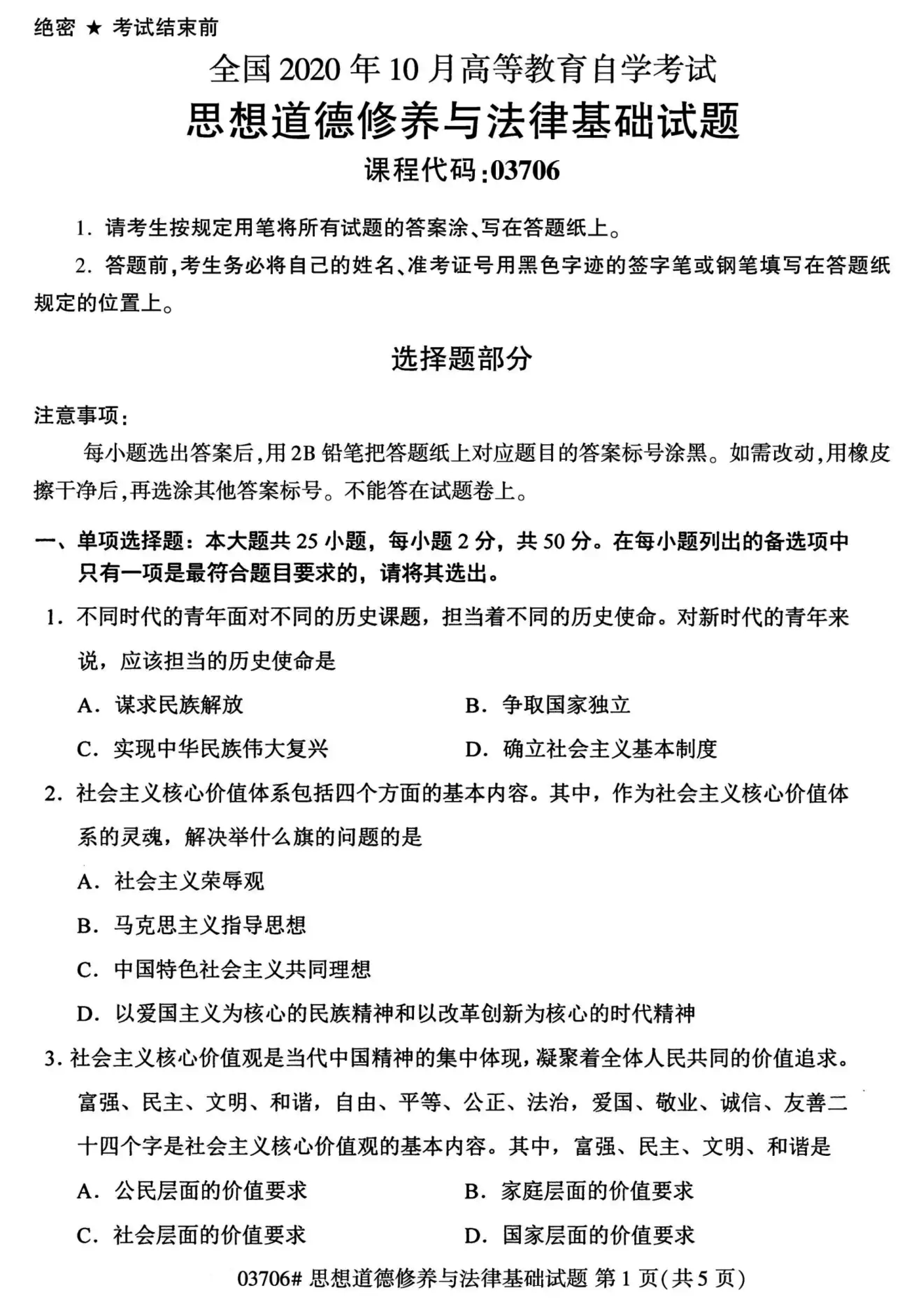 2020年10月自学考试科目《思想道德修养与法律基础 》(03706)答案解析