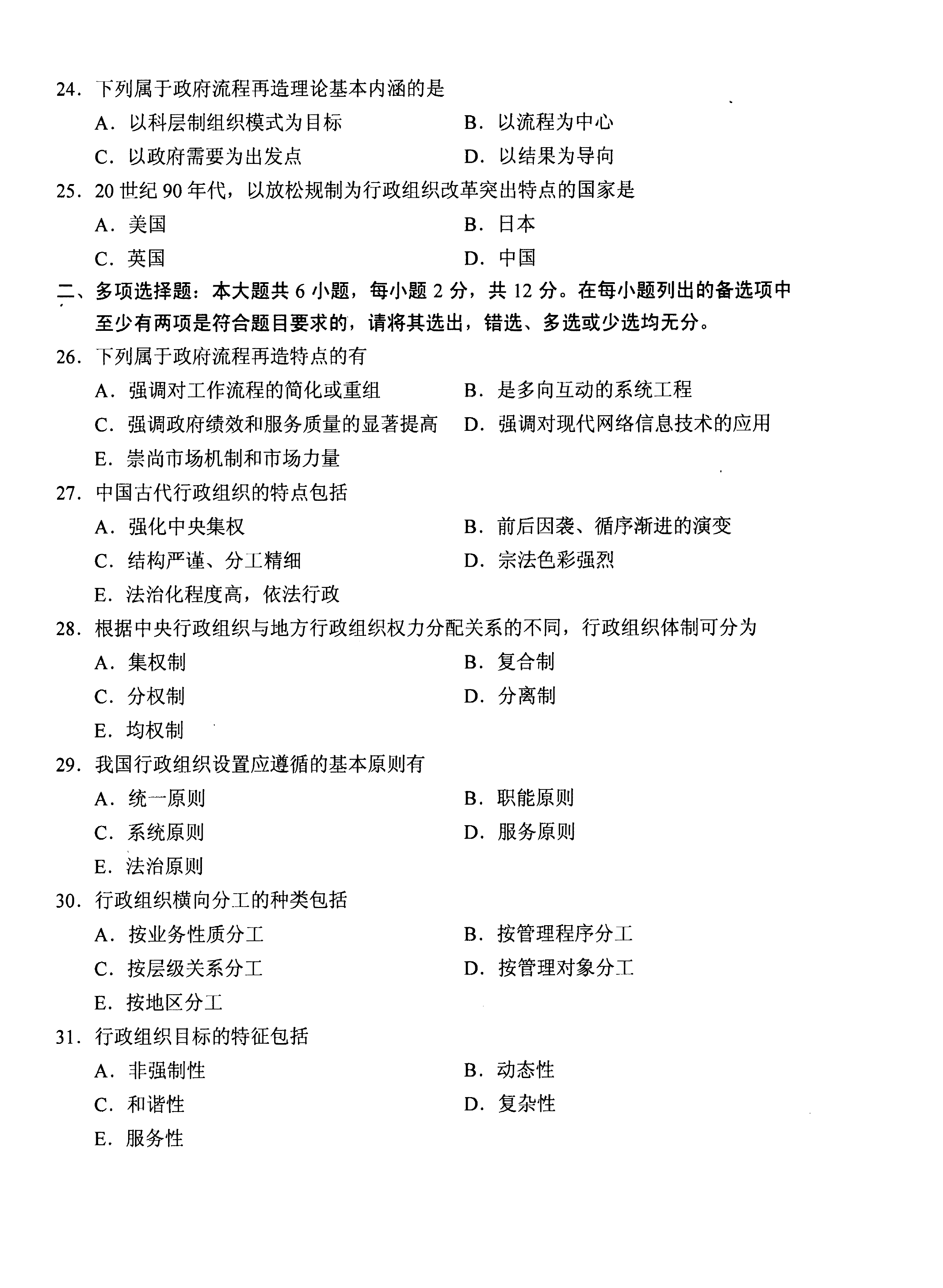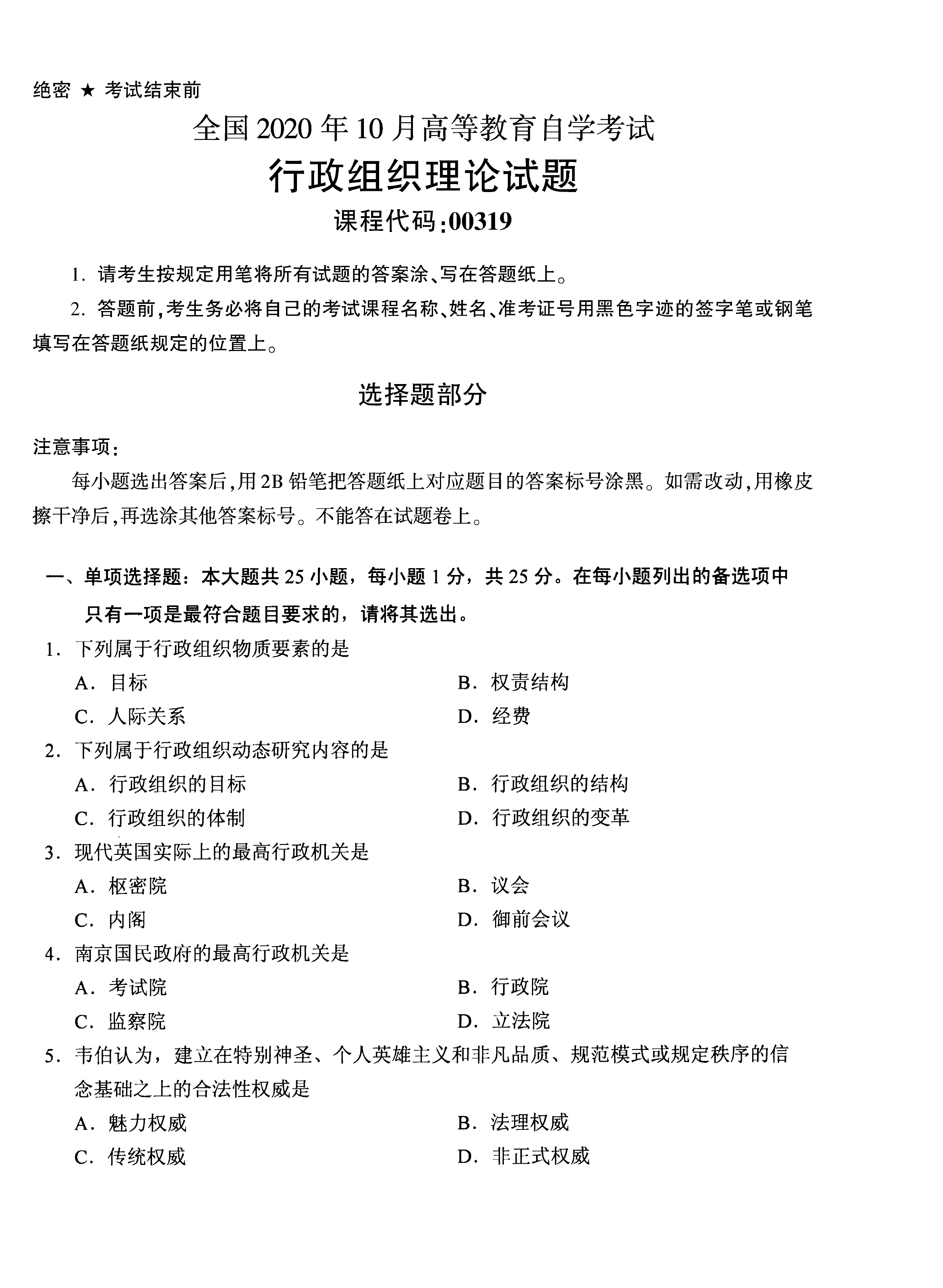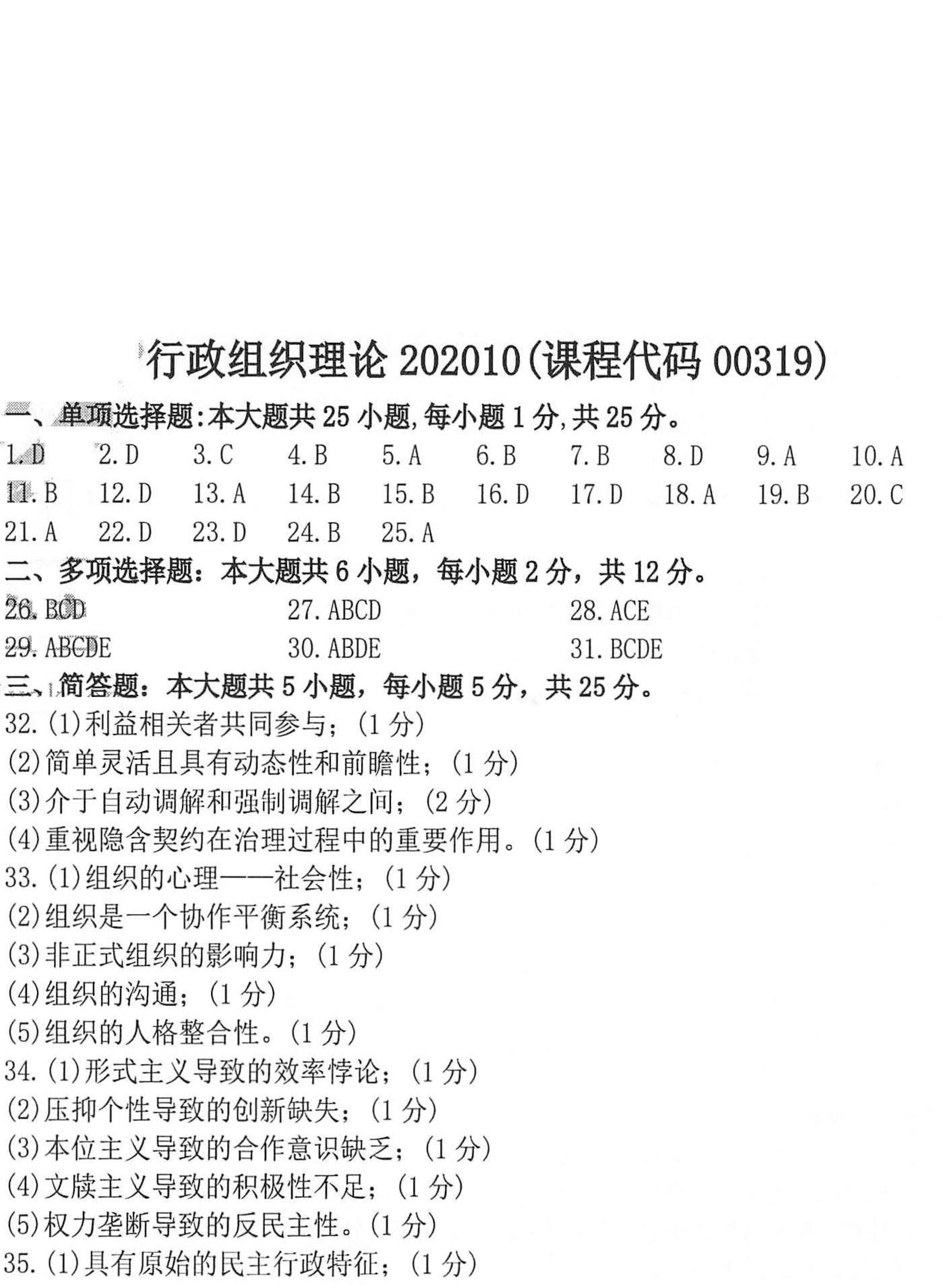贵州省2020年10月自考00319行政组织理论真题及答案