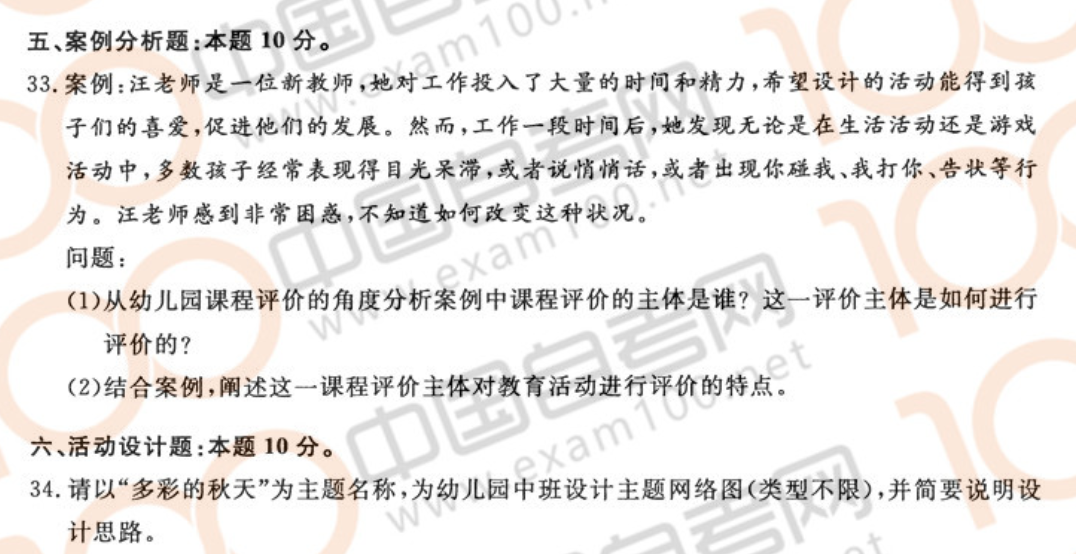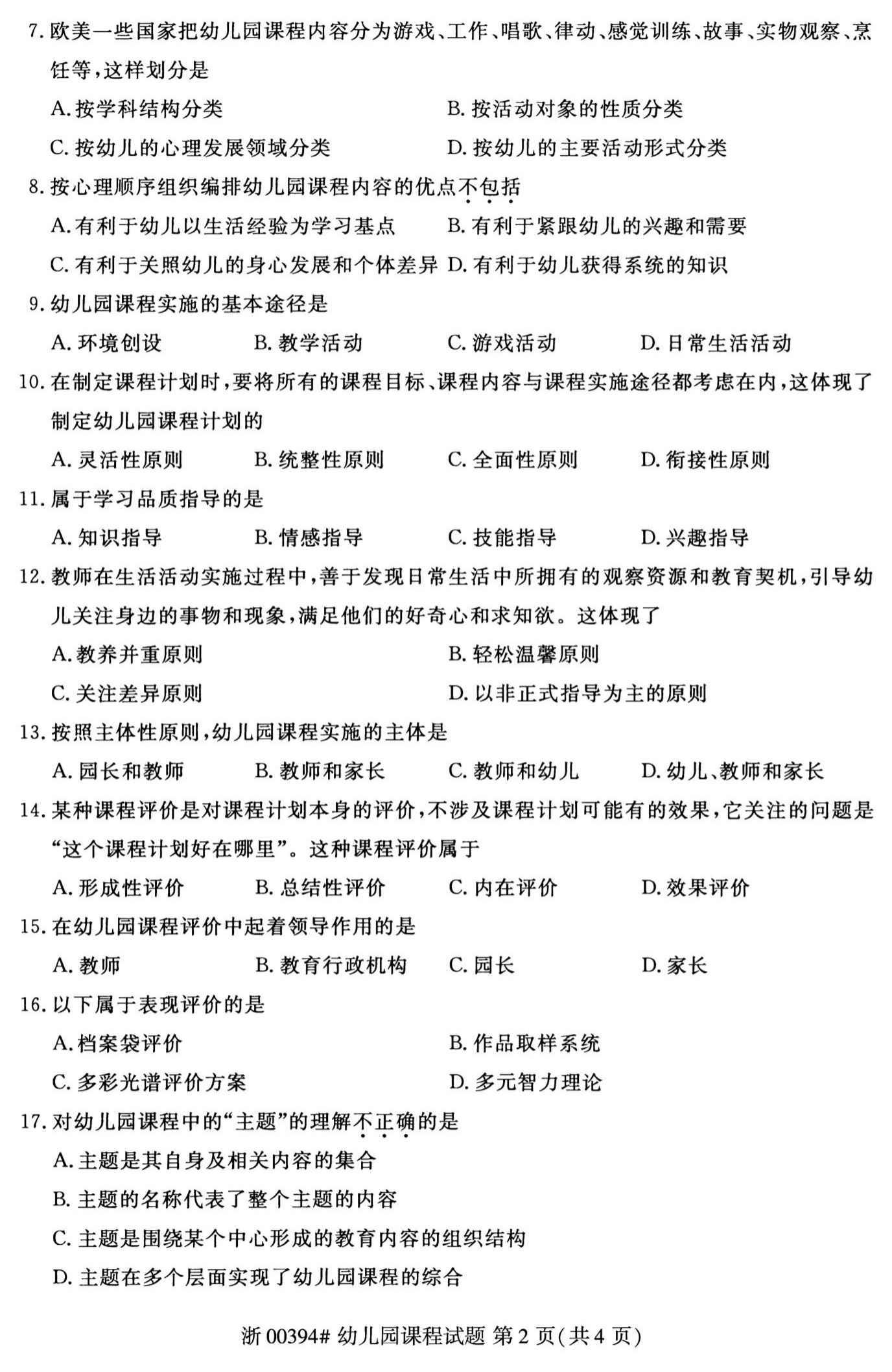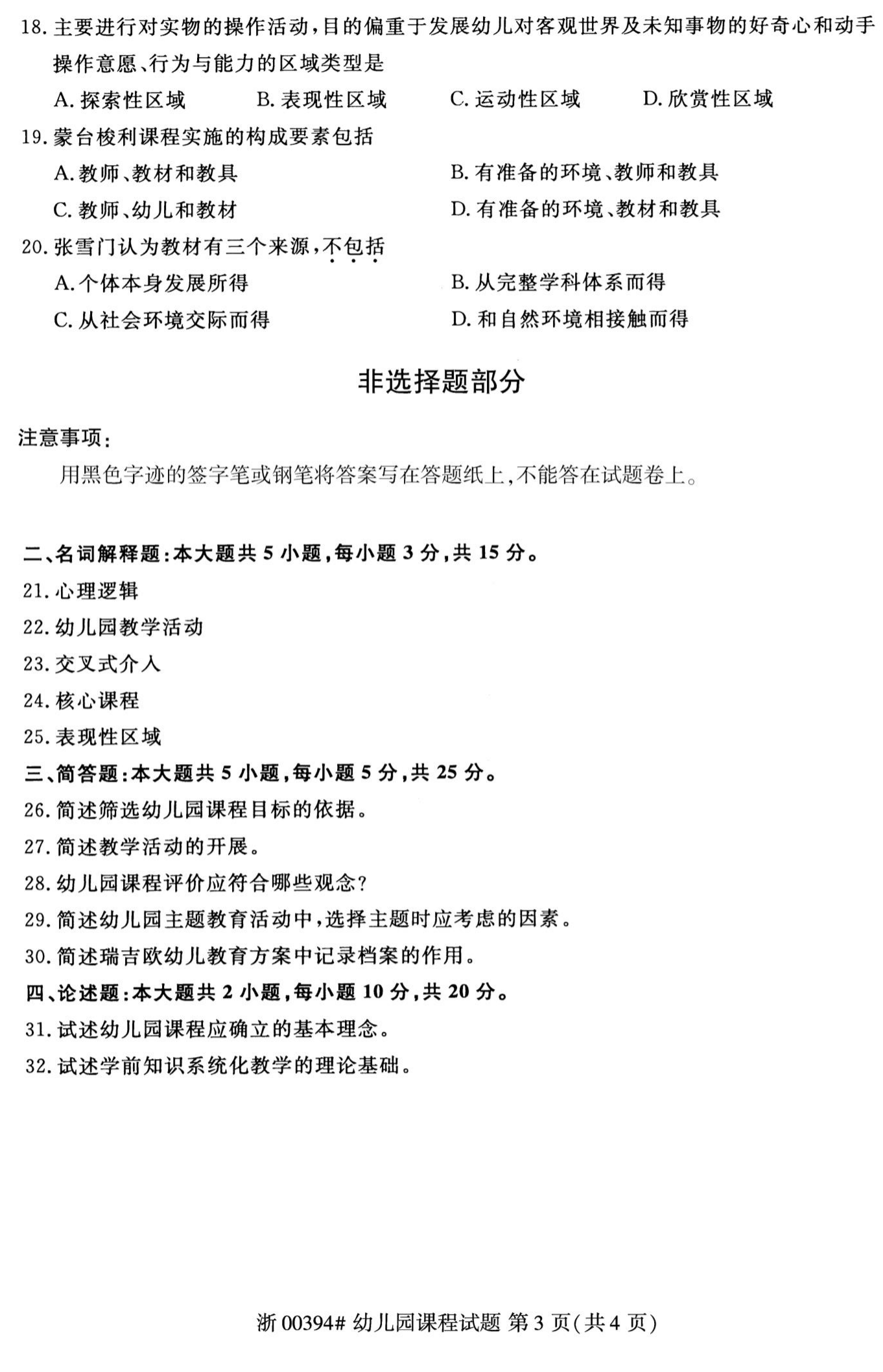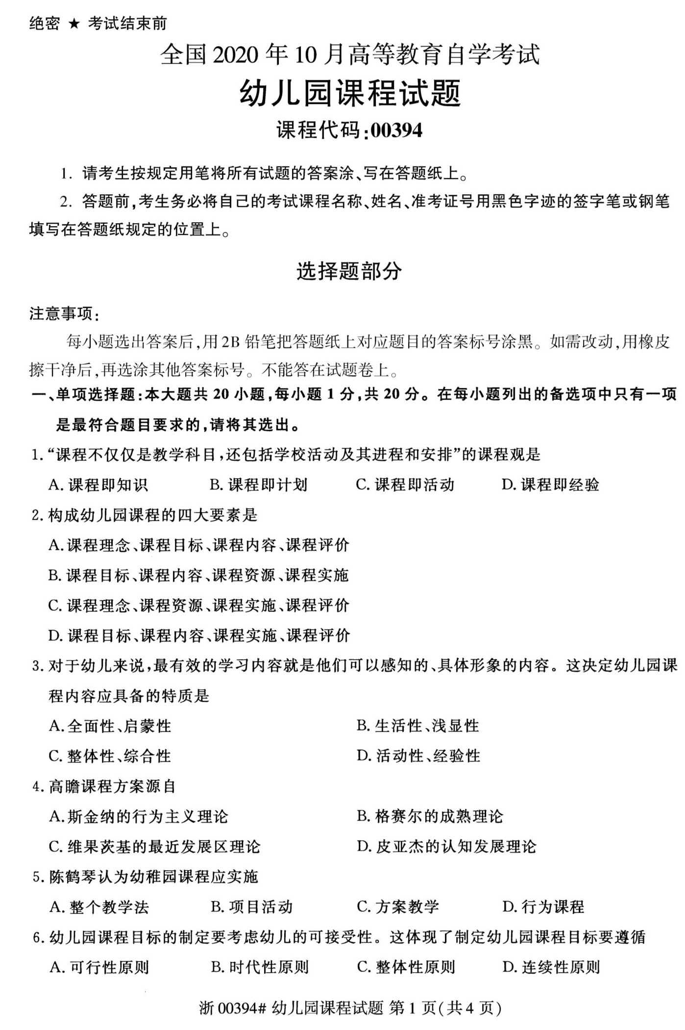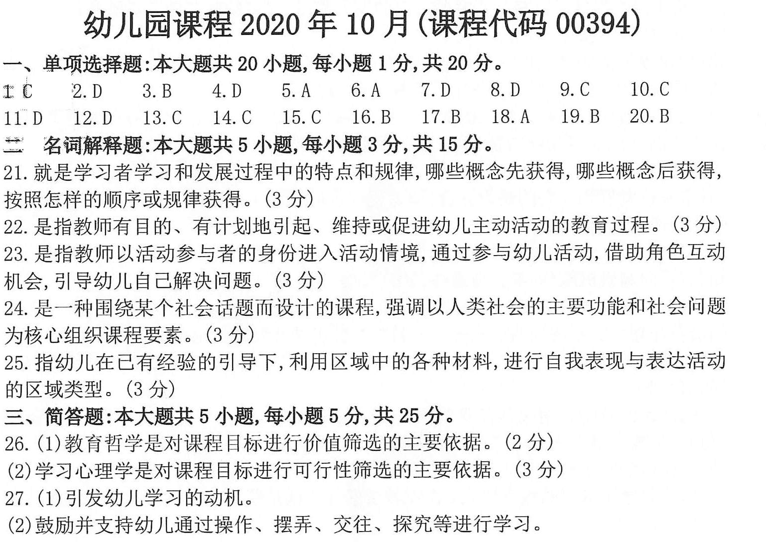 贵州省2020年10月自学考试00394幼儿园课程真题及答案