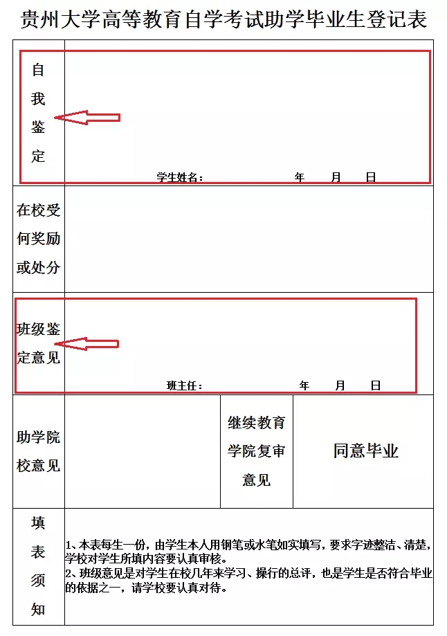 注:领取毕业证需要同学们提前填写助学毕业生登记表中【自我鉴定】一栏,再交由班主任填写【班级鉴定意见】一栏;均填写完毕方可至512室周述伦老师处领取毕业证。