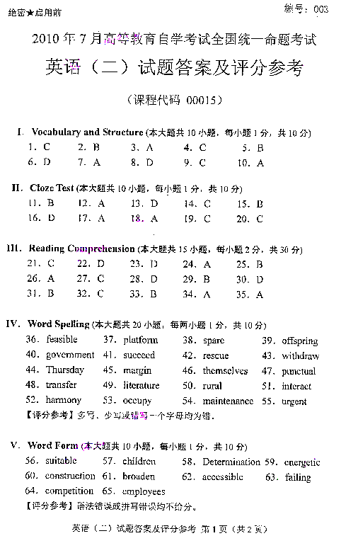 2010年07月贵州自考00015英语二真题答案