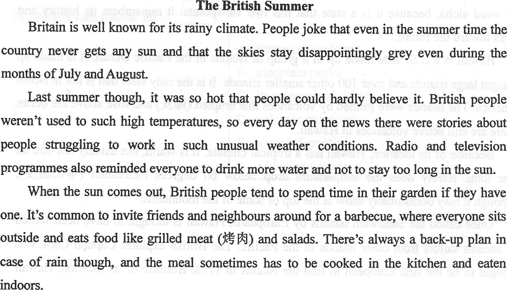 Last summer though, it was so hot that people could hardly believe it. British people weren't used to such high temperatures, so every day on the news there were stories about people struggling to work in such unusual weather conditions. Radio and television programmes also reminded everyone to drink more water and not to stay too long in the sun.