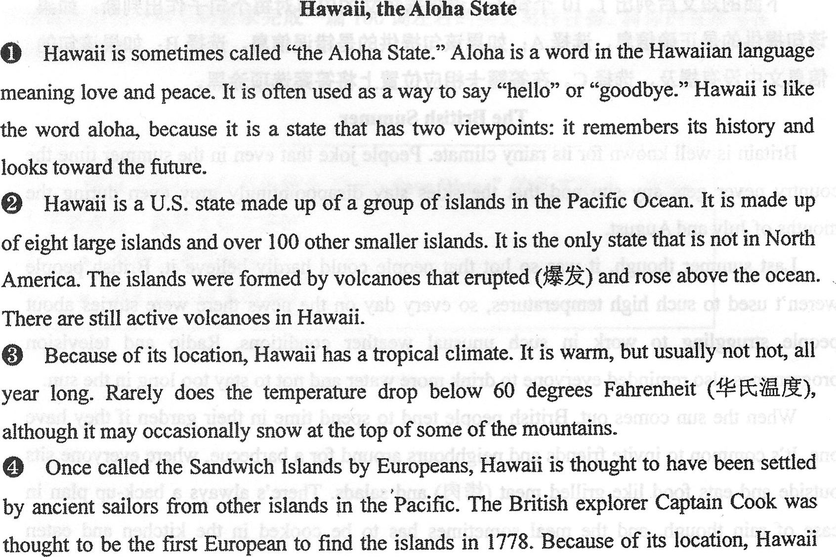 ① Hawaii is sometimes called “the Aloha State.” Aloba is a word in the Hawaiian language meaning love and peace. It is often used as a way to say “hello” or “goodbye.” Hawaii is like the word aloha, because it is a state that has two viewpoints: it remembers its history and looks toward the future.