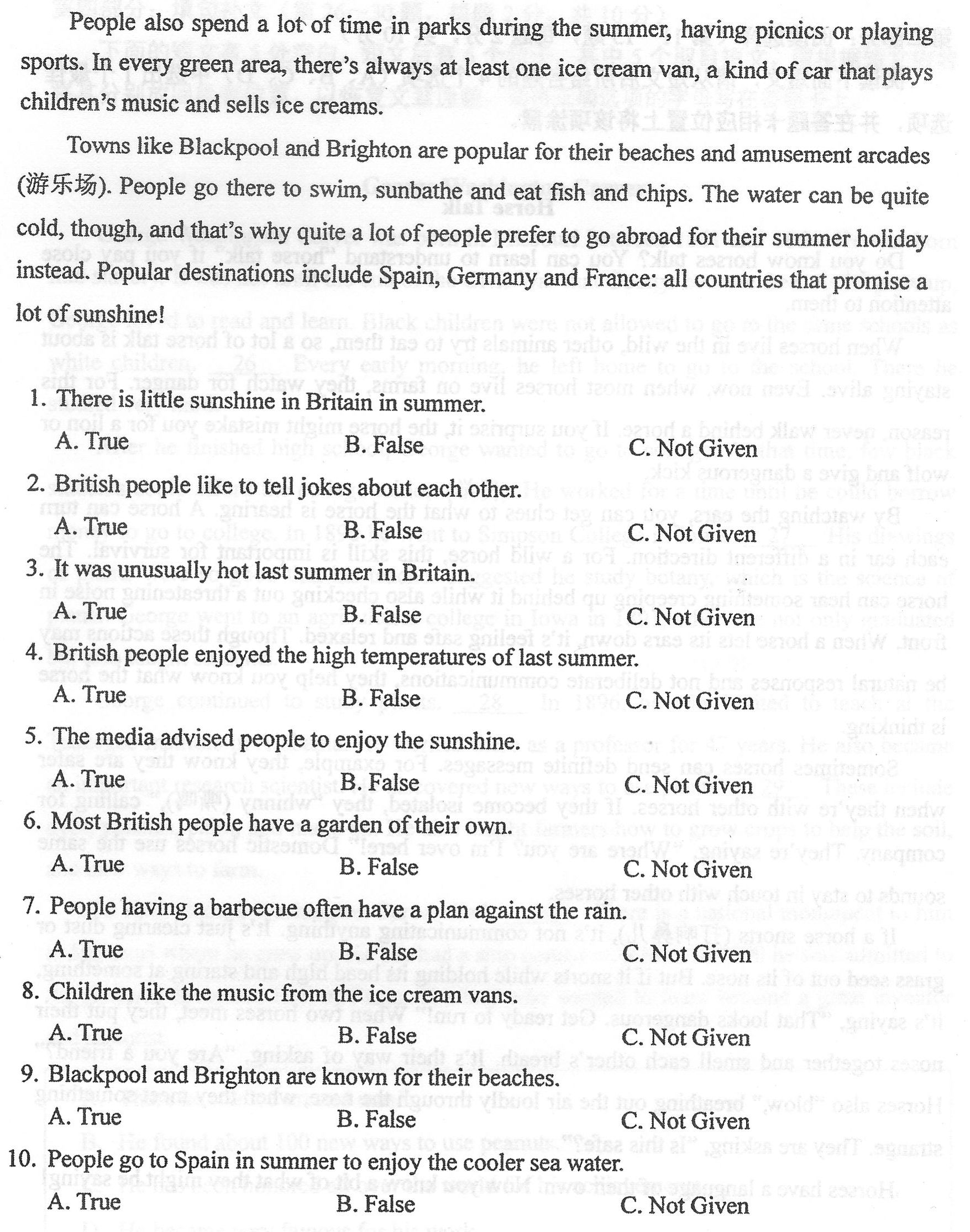 Towns like Blackpool and Brighton are popular for their beaches and amusement arcades(游乐场).People go there to swim, sunbathe and eat fish and chips. The water can be quite cold, though, and that’s why quite a lot of people prefer to go abroad for their summer holiday instead. Popular destinations include Spain, Germany and France: all countries that promise a lot of sunshine!