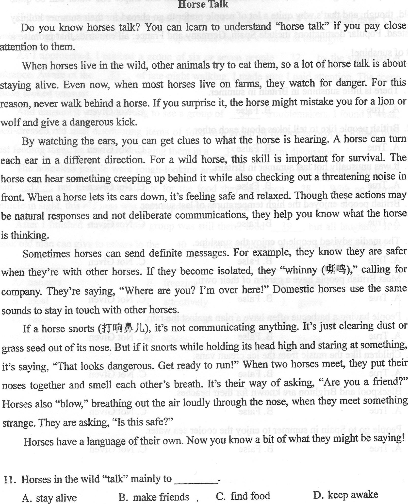 If a horse snorts (打响鼻儿),it's not communicating anything. It’s just clearing dust or grass seed out of its nose. But if it snorts while holding its head high and staring at something, it’s saying. “That looks dangerous. Get ready to run!" When two horses meet, they put their noses together and smell each other's breath. It’s their way of asking, “Are you a friend?” Horses also “blow "breathing out the air loudly through the nose, when they meet something strange. They are asking, “Is this safe?”