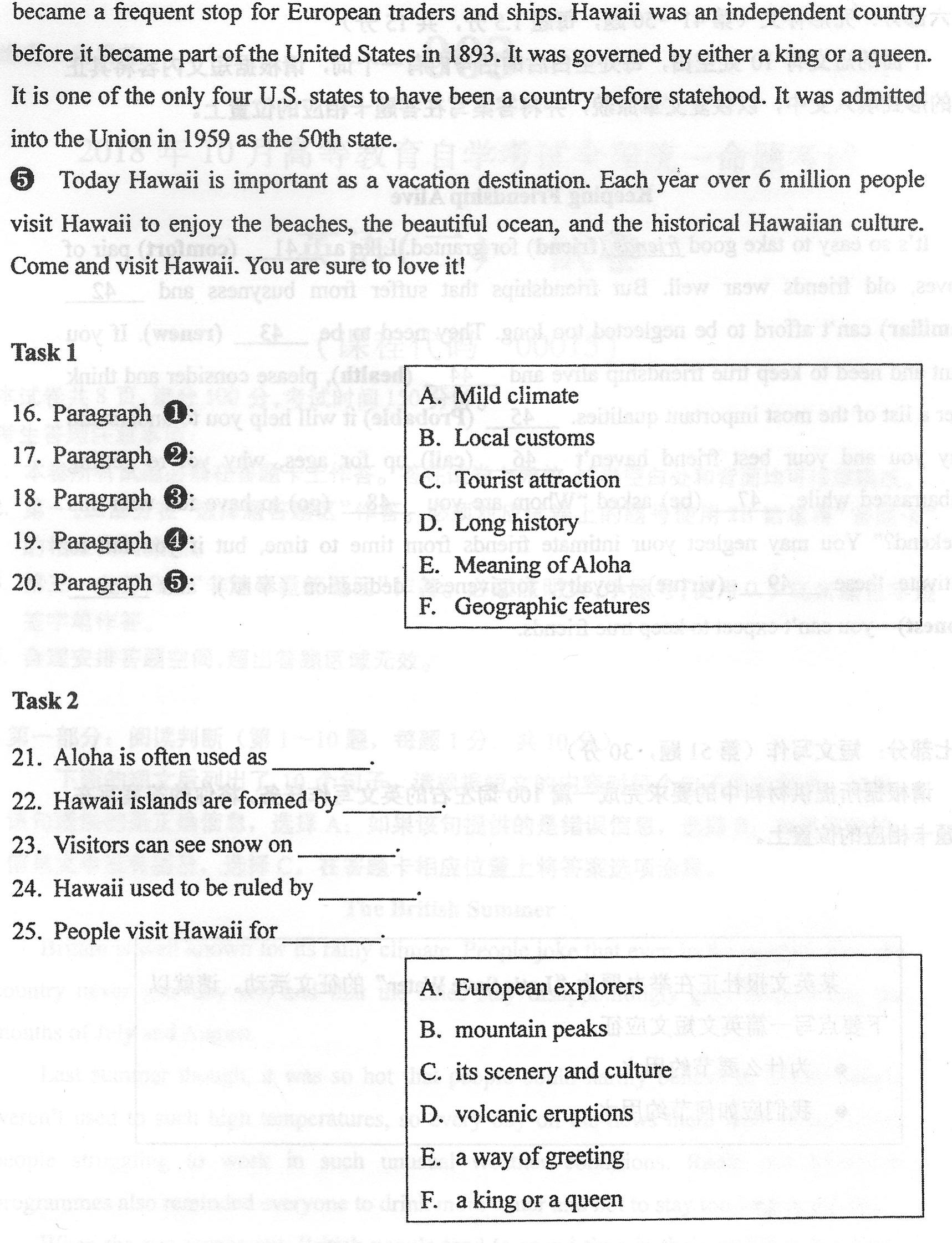 第三部分:概括段落大意和补全句子(第16~25题,每题l分,共10分)