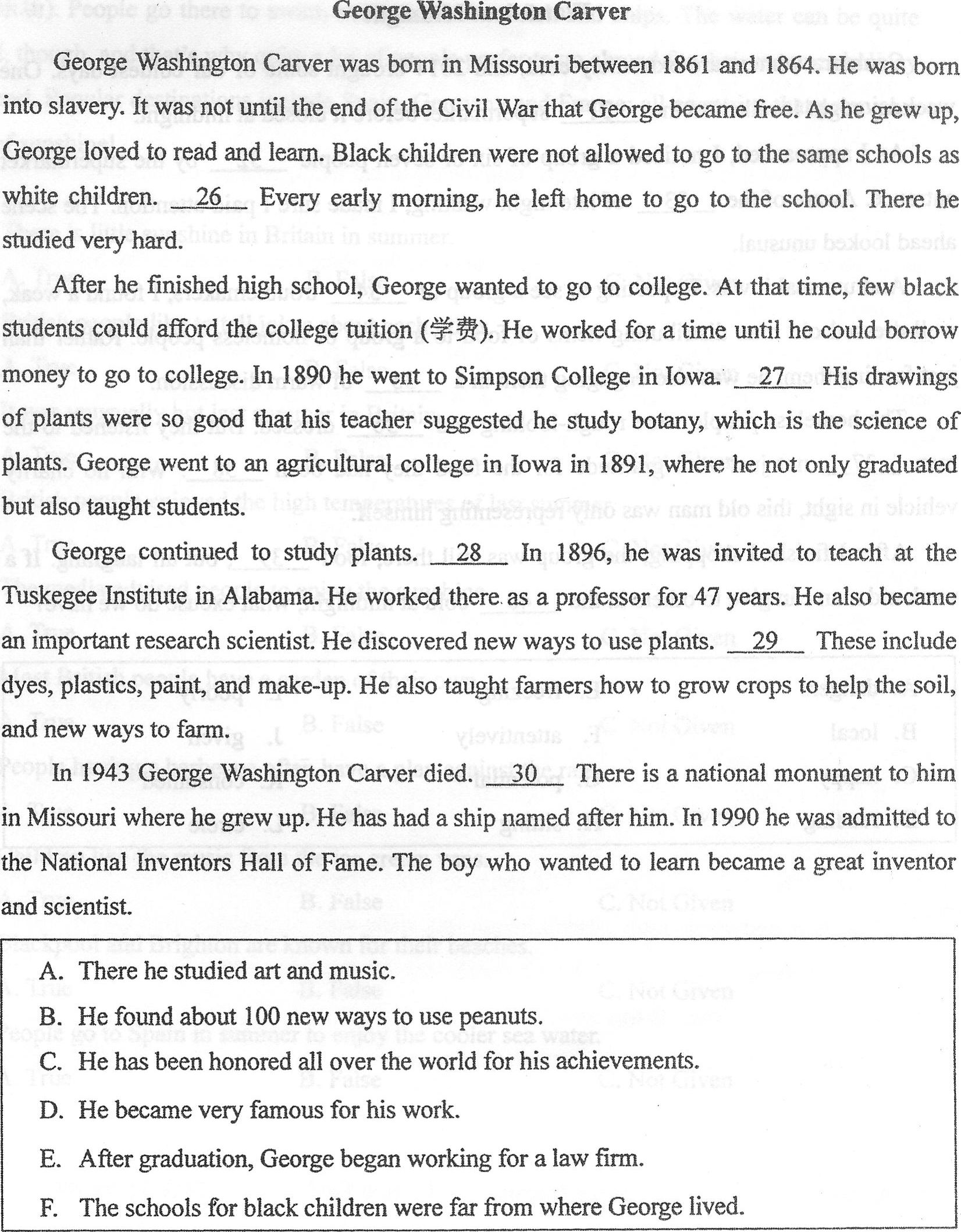 After he finished high school, George wanted to go to college. At that time, few black students could afford the college tuition (学费) .He worked for a time until he could borrow money to go to college. In 1890 he went to Simpson College in Iowa. 2 His drawing of plants were so good that his teacher suggested he study botany, which is the science of plants. George went to an agricultural college in Iowa in 1891, where he not only graduated but also taught students.