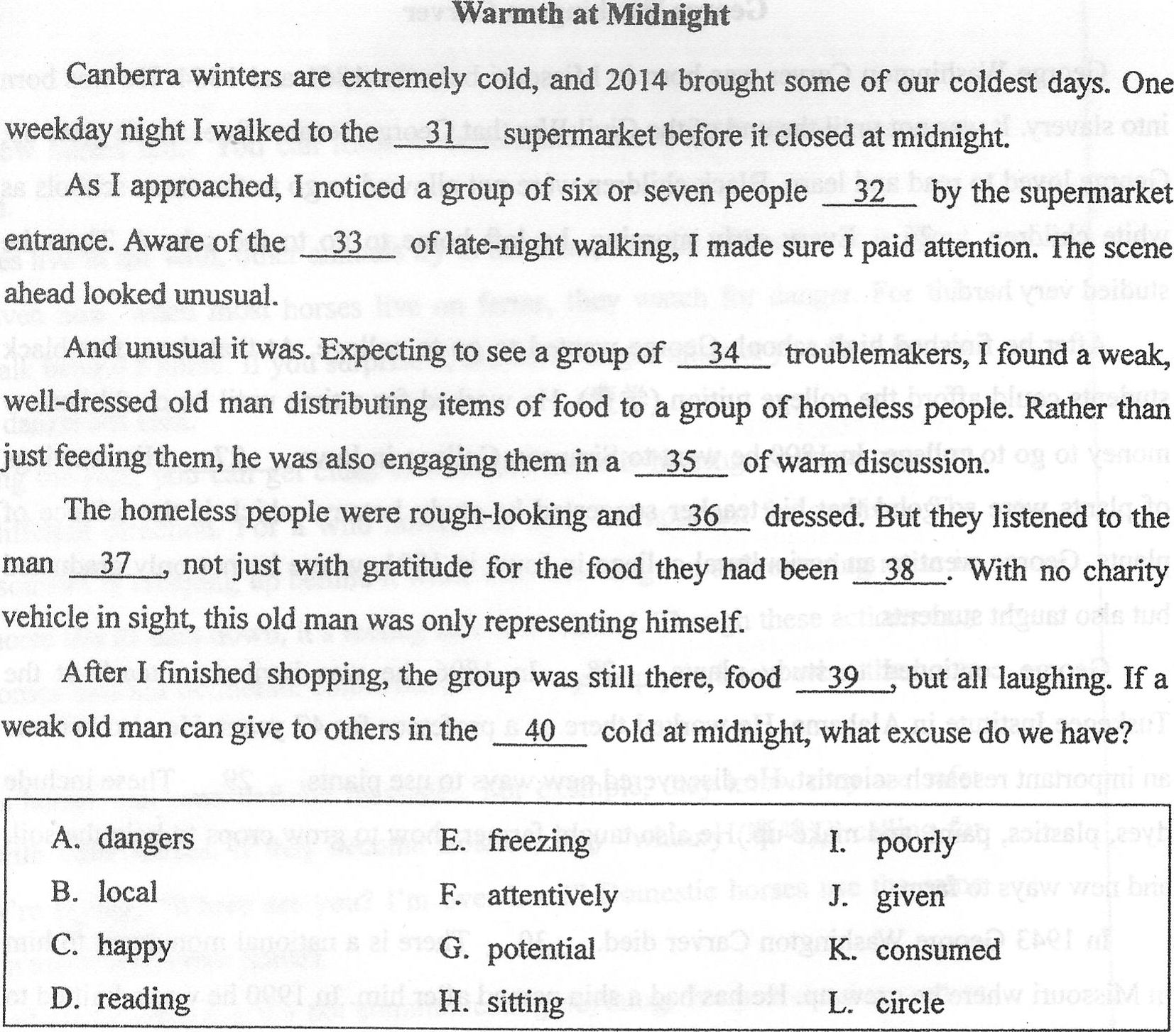 The homeless people were rough-looking and 6 dressed. But they listened to the man 7, not just with gratitude for the food they had been 8. With no charity vehicle in sight, this old man was only representing himself.