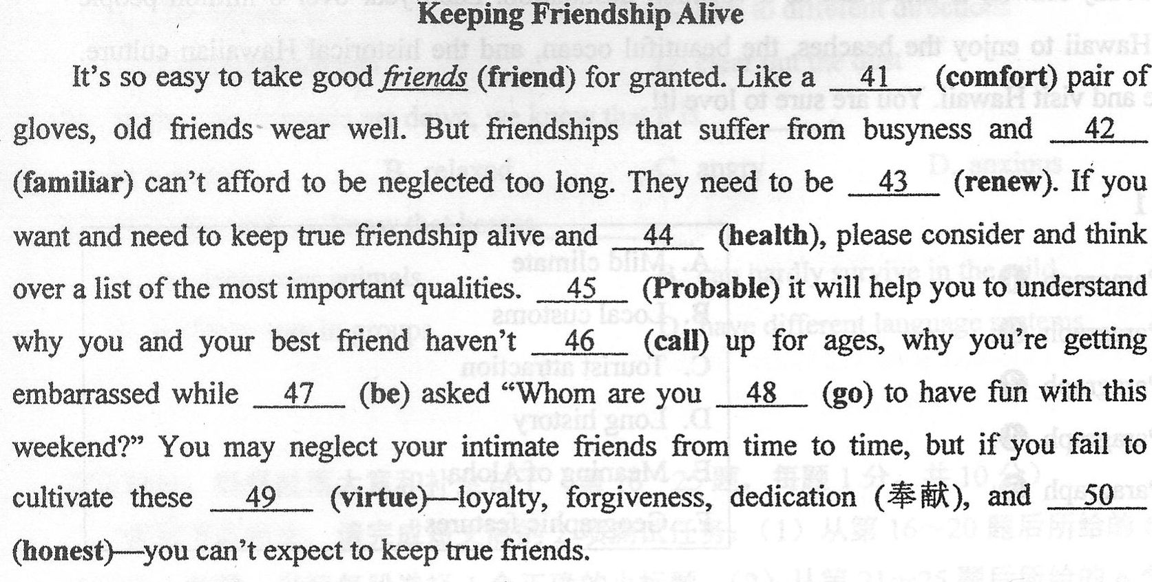 It’s so easy to take good friends (friend) for granted. Like a 1 (comfort) pair of gloves, old friends wear well. But friendships that suffer from busyness and 2 (familiar) can’t afford to be neglected too long. They need to be 3 (renew). If you want and need to keep true friendship alive and 4 (health), please consider and think over a list of the most important qualities. 5 (Probable) it will help you to understand why you and your best friend haven't 6 (call) up for ages, why you’re getting embarrassed while 7 (be) asked “Whom are you 8 (go) to have fun with this weekend?" You may neglect your intimate friends from time to time, but if you fail to cultivate these9 (virtue)---loyalty, forgiveness, dedication (奉献)and 10 (honest)---you can't expect to keep true friends.